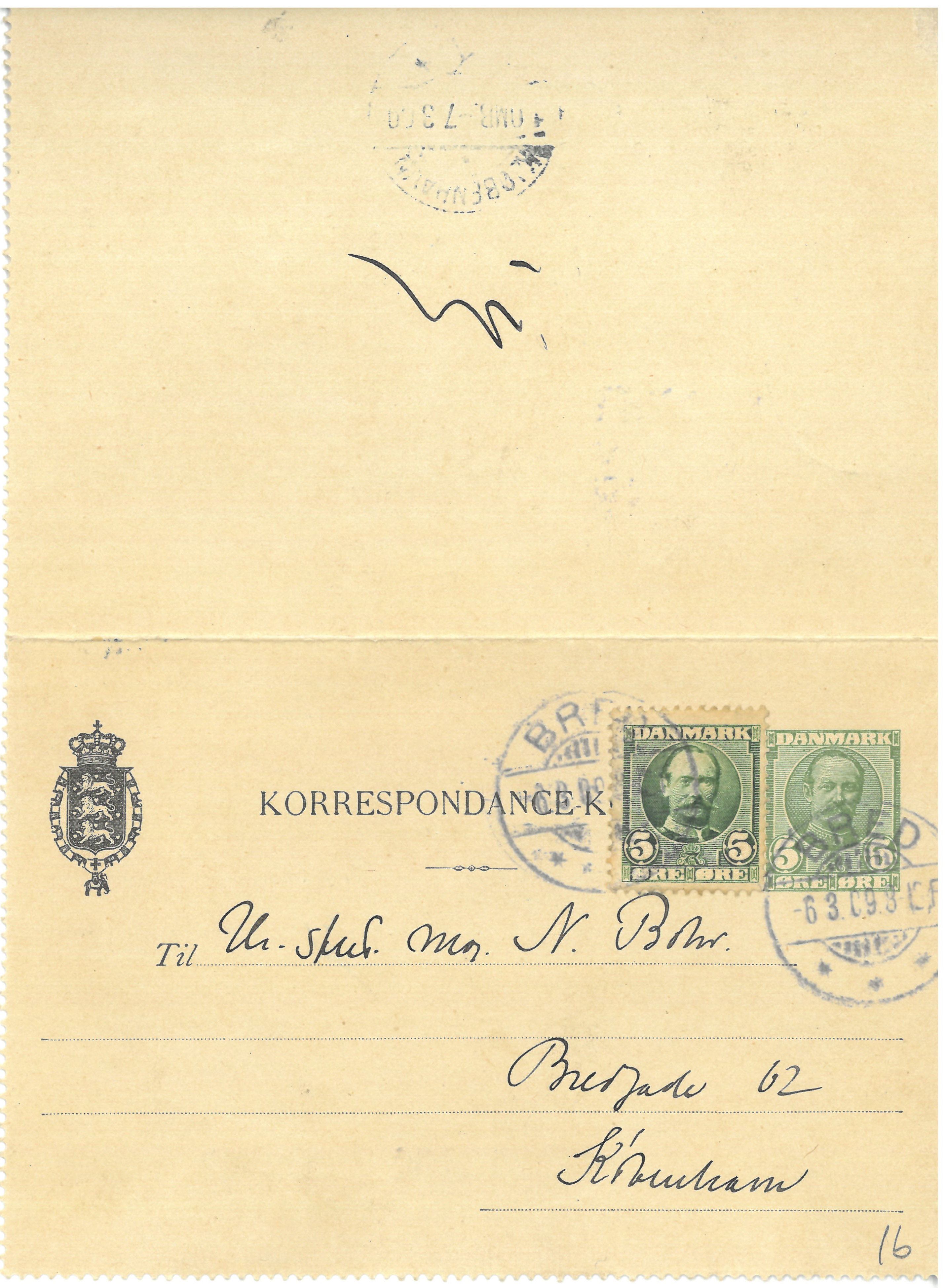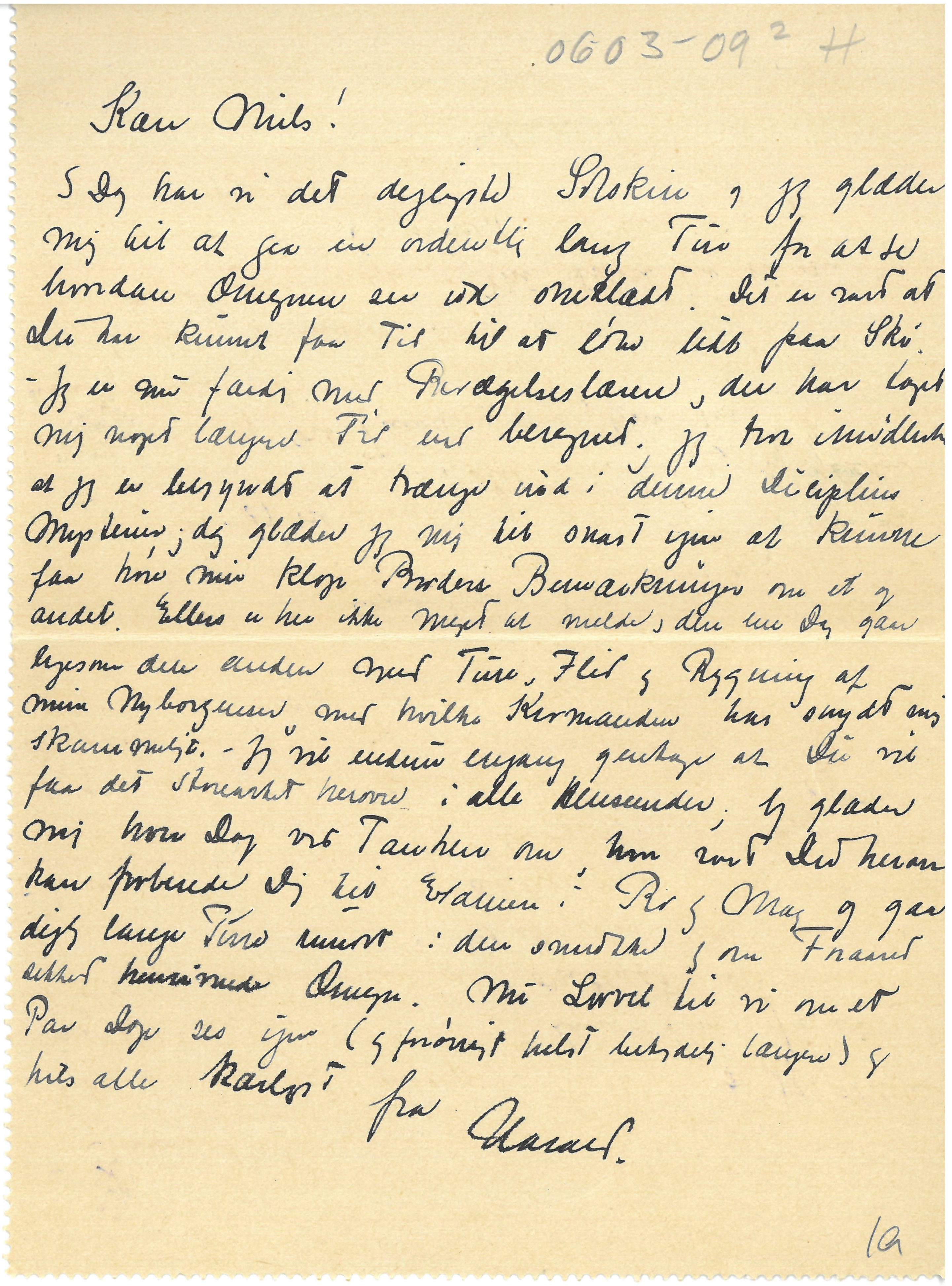 I Dag har vi det dejligste Solskin og jeg glæder mig til at gaa en ordentlig lang Tur for at se hvordan Omegnen ser ud omklædt. Det er rart at Du har kunnet faa Tid til at løbe lidt paa Ski. – Jeg er nu færdig med Bevægelseslæren, der har taget mig noget længere Tid end beregnet; jeg tror imidlertid at jeg er begyndt at trænge ind i denne Disciplins Mysterier; dog glæder jeg mig til snart igen at kunne faa høre min kloge Broders Bemærkninger om et og andet. Ellers er her ikke meget at melde, den ene Dag gaar ligesom den anden med Ture, Flid og Rygning af mine Nyborgensere med hvilke Kromanden har snydt mig skammeligt. – Jeg vil endnu engang gentage at Du vil faa det storartet herovre i alle Henseender; jeg glæder mig hver Dag ved Tanken om, hvor rart Du herovre kan forberede Dig til Examen i Ro og Mag og gaa dejlig lange Ture rundt i den smukke og om Foraaret sikkert henrivende Omegn. Nu Levvel til vi om et Par Dage ses igen (og forøvrigt helst betydelig længere) og hils alle