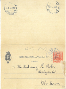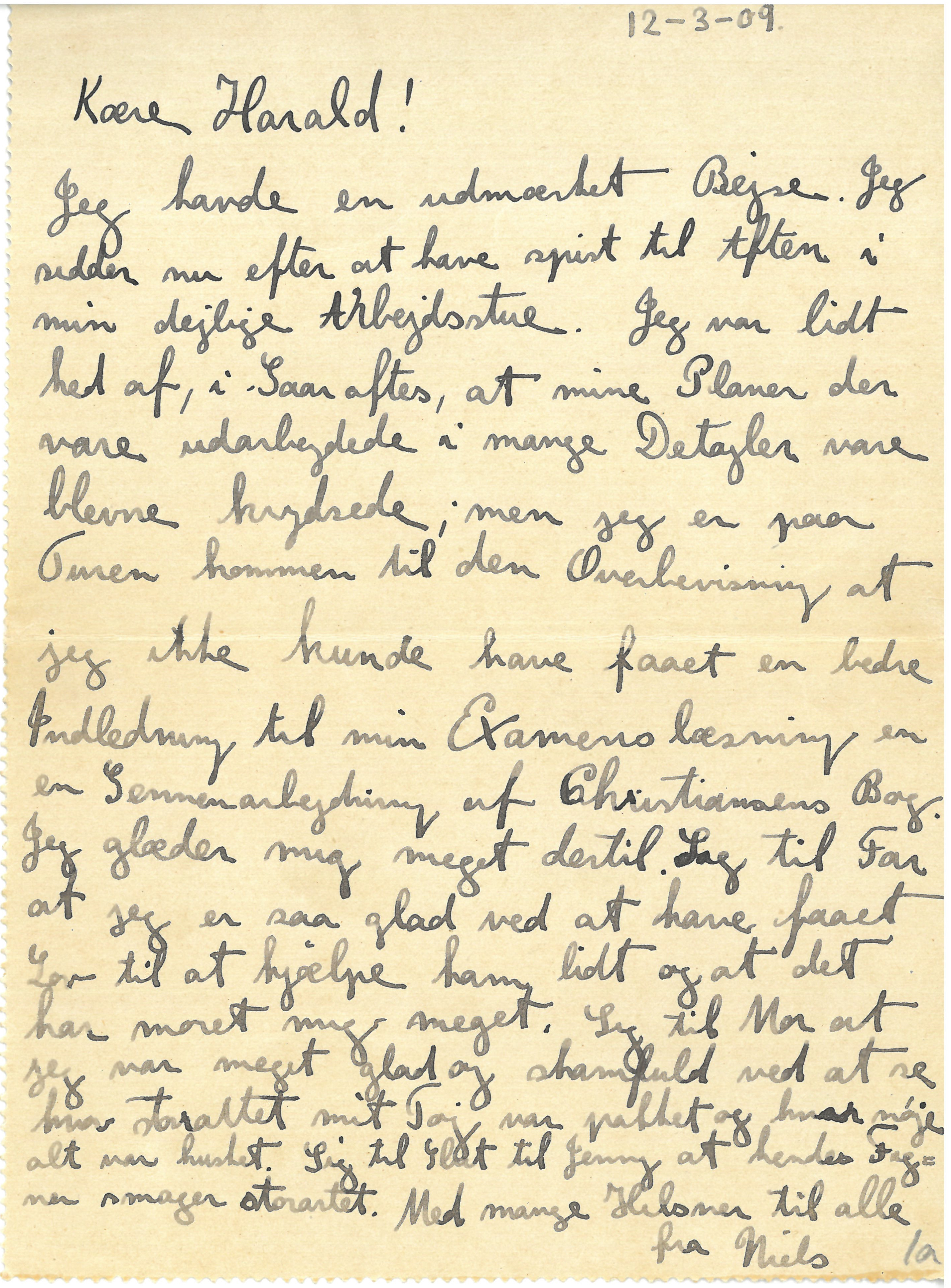 Jeg havde en udmærket Rejse. Jeg sidder nu efter at have spist til Aften i min dejlige Arbejdsstue. Jeg var lidt ked af, i Gaar aftes, at mine Planer der vare udarbejdede i mange Detajler vare blevne krydsede; men jeg er paa Turen kommen til den Overbevisning at jeg ikke kunde have faaet en bedre Indledning til min Examenslæsning end en Gennemarbejdning af Christiansens Bog. Jeg glæder mig meget dertil. Sig til Far at jeg er saa glad ved at have faaet Lov til at hjælpe ham lidt og at det har moret mig meget. Sig til Mor at jeg var meget glad og skamfuld ved at se hvor storartet mit Tøj var pakket og hvor nøje alt var husket. Sig til Slut til Jenny at hendes Figner smager storartet.