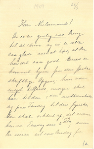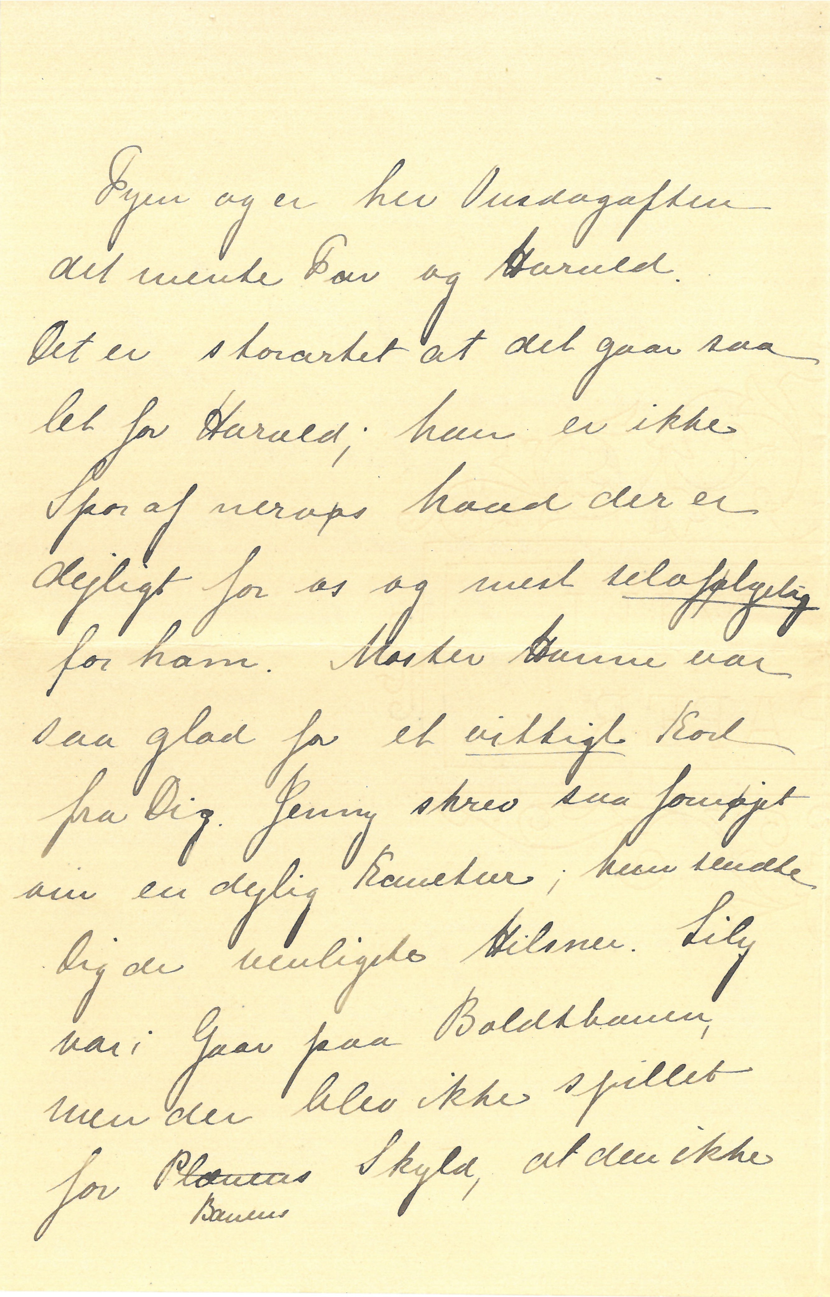 Det er storartet at det gaar saa let for Harald; han er ikke Spor af nervøs hvad der er dejligt for os og mest selvfølgelig for ham. Moster Hanne var saa glad for et vittigt Kort fra Dig. Jenny skrev saa fornøjet om en dejlig Kanetur; hun sendte Dig de venligste Hilsner. Lily var i Gaar paa Boldtbanen, men der blev ikke spillet for Banens Skyld, at den ikke |skulde ødelægges. Den næste Bogpakke fra Michaelsen var ikke særlig god heller, Eventyr af Otto Larsen, Fortællinger af Evald og en iøvrigt god Bog af Hamsun “Benoni”, men den var lidt langtrukken. Nu farvel min søde Dreng, Far og Ribs sender de kærligste Hilsner.