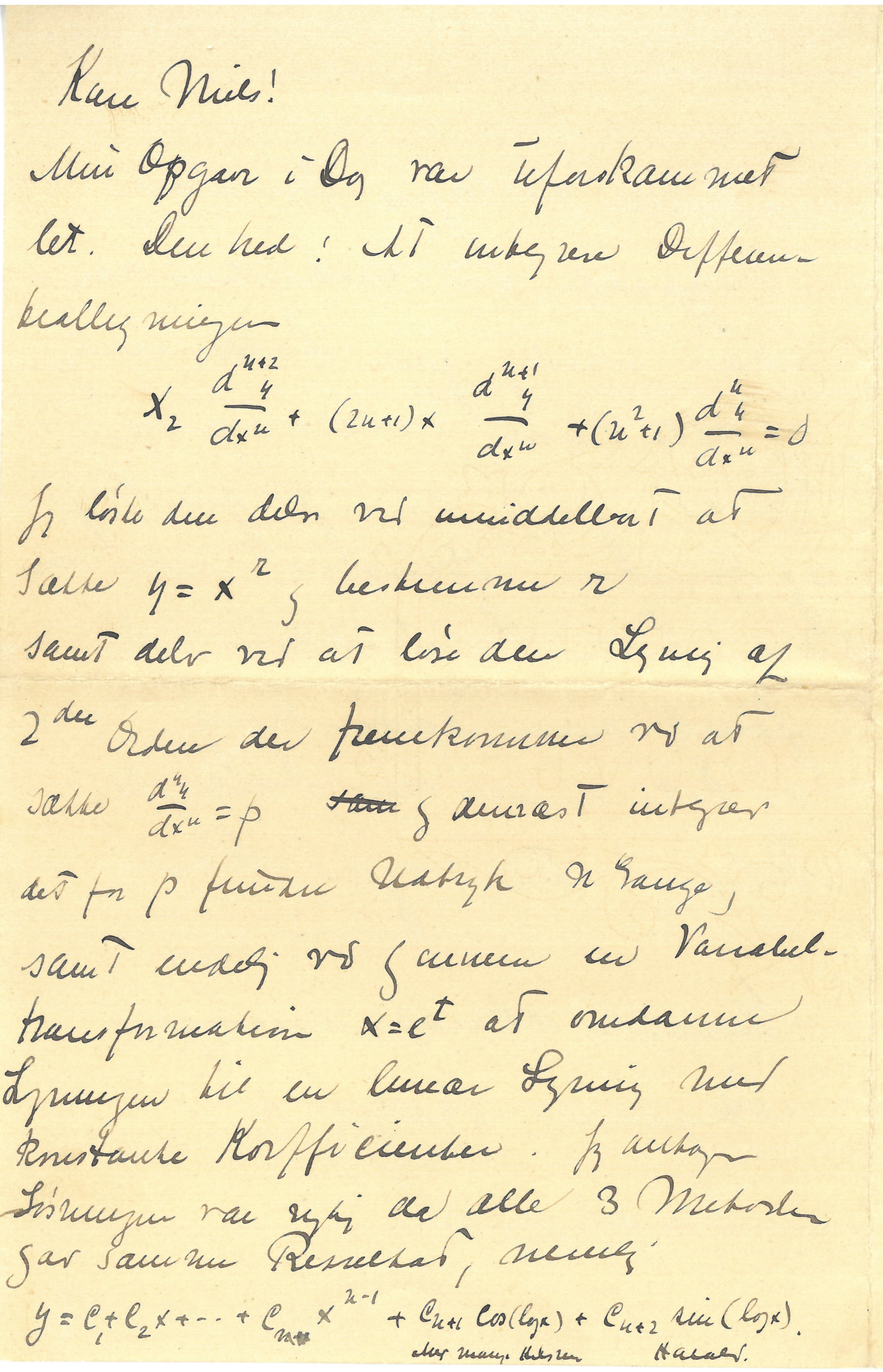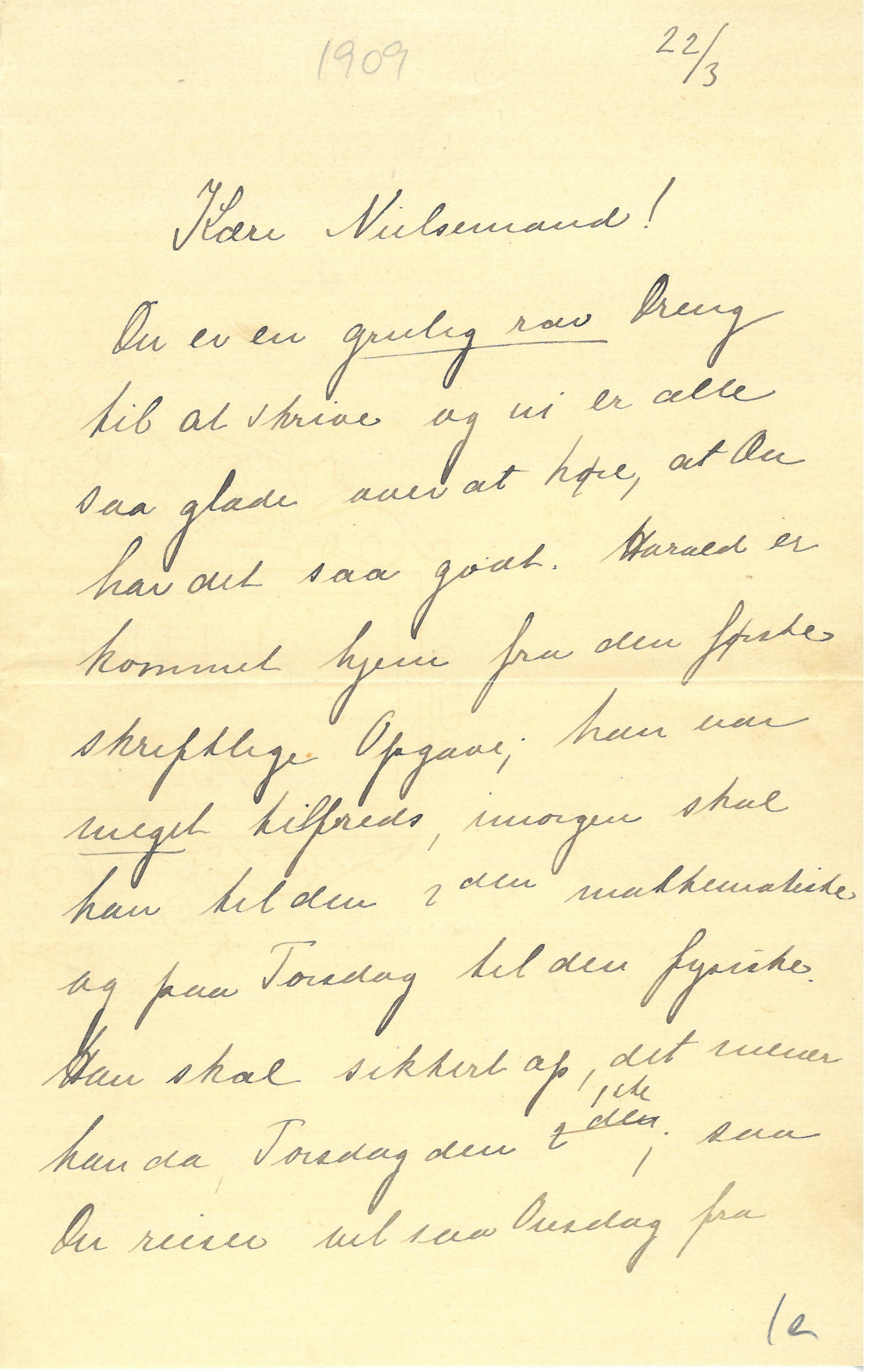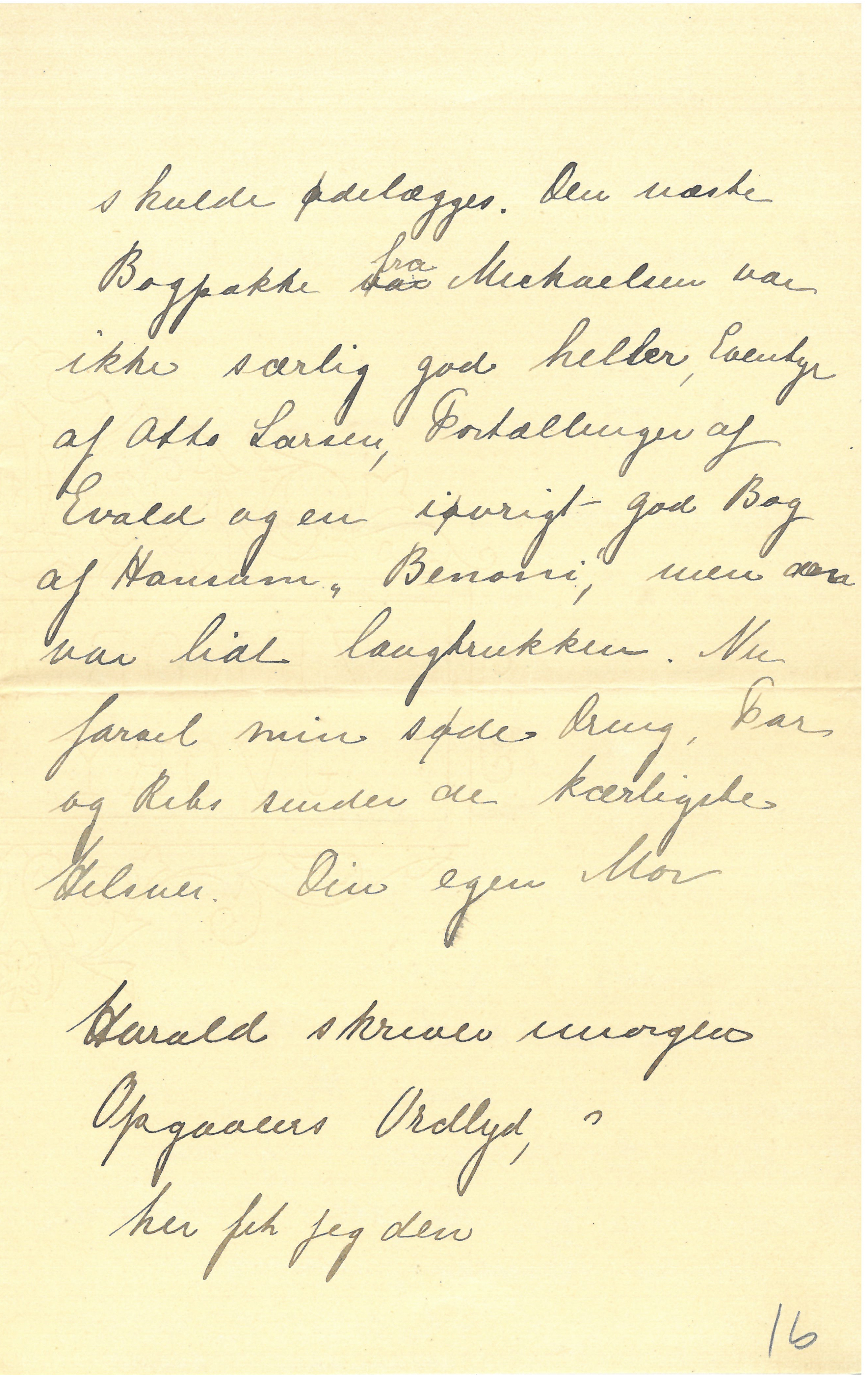 Du er en grulig rar Dreng til at skrive og vi er alle saa glade over at høre, at Du har det saa godt. Harald er kommet hjem fra den første skriftlige Opgave; han var meget tilfreds, imorgen skal han til den 2den mathematiske og paa Torsdag til den fysiske. Han skal sikkert op, det mener han da, Torsdag den 1ste; saa Du reiser vel saa Onsdag fra | Fyen og er her Onsdagaften det mente Far og Harald.