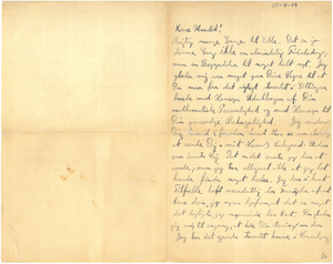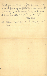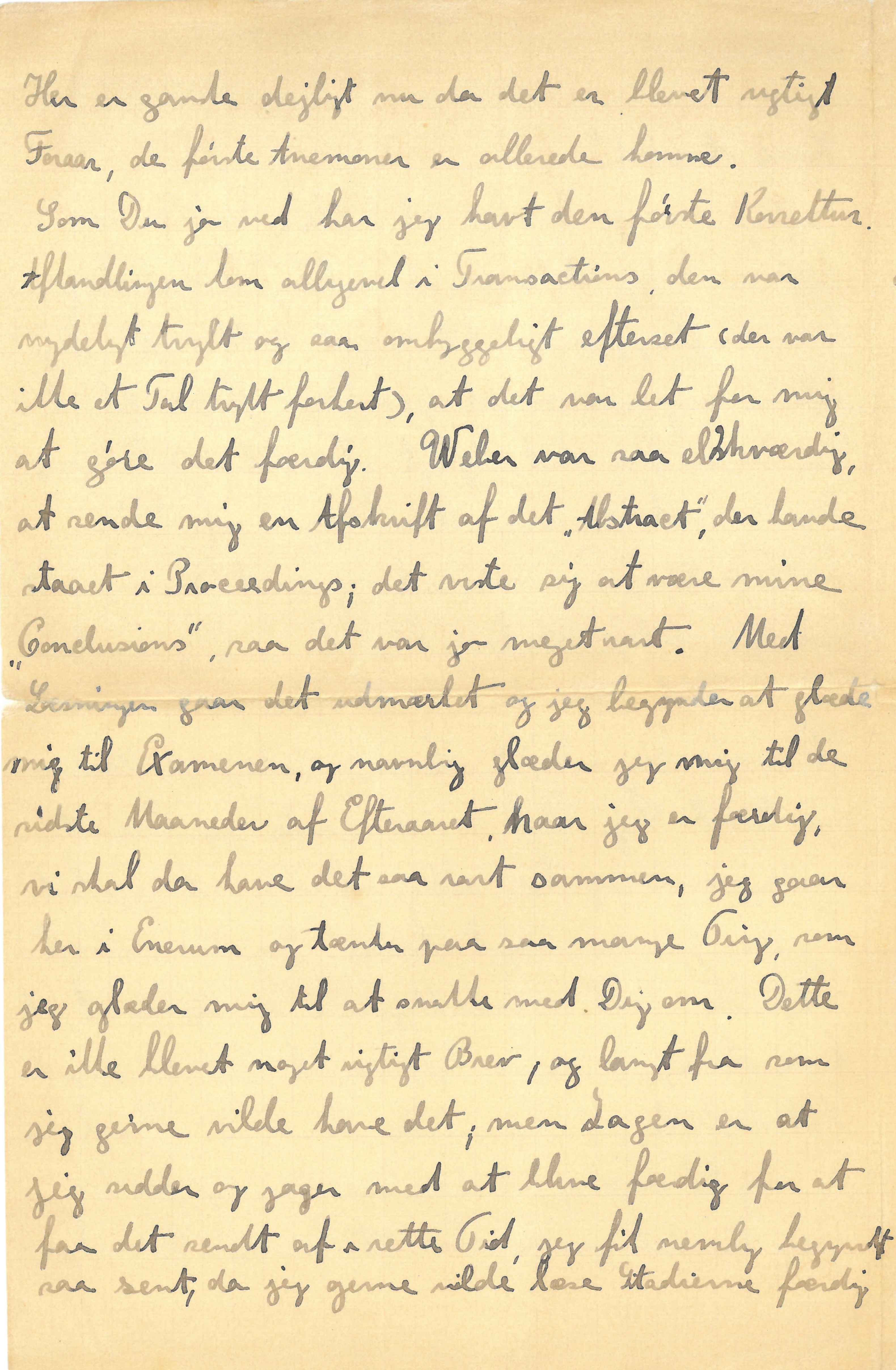 Som Du jo ved har jeg havt den første Korrektur. Afhandlingen kom alligevel i Transactions, den var nydeligt trykt og saa omhyggeligt efterset (der var ikke et Tal trykt forkert), at det var let for mig at gøre det færdig. Weber var saa elskværdig, at sende mig en Afskrift af det “Abstract”, der havde staaet i Proceedings; det viste sig at være mine “Conclusions”, saa det var jo meget rart. Med Læsningen gaar det udmærket og jeg begynder at glæde mig til Examenen, og navnlig glæder jeg mig til de sidste Maaneder af Efteraaret, naar jeg er færdig, vi skal da have det saa rart sammen, jeg gaar her i Enerum og tænker paa saa mange Ting, som jeg glæder mig til at snakke med Dig om. Dette er ikke blevet noget rigtigt Brev, og langt fra som jeg gerne vilde have det; men Sagen er at jeg sidder og jager med at blive færdig for at faa det sendt af i rette Tid, jeg fik nemlig begyndt saa sent, da jeg gerne vilde læse Stadierne færdig |førend jeg sendte dem af; Du faar da trøste Dig med at jeg en af de første Dage skal sende et nyt Brev; jeg vil da denne Gang ende med at ønske Dig rigtig mange Gange til Lykke.