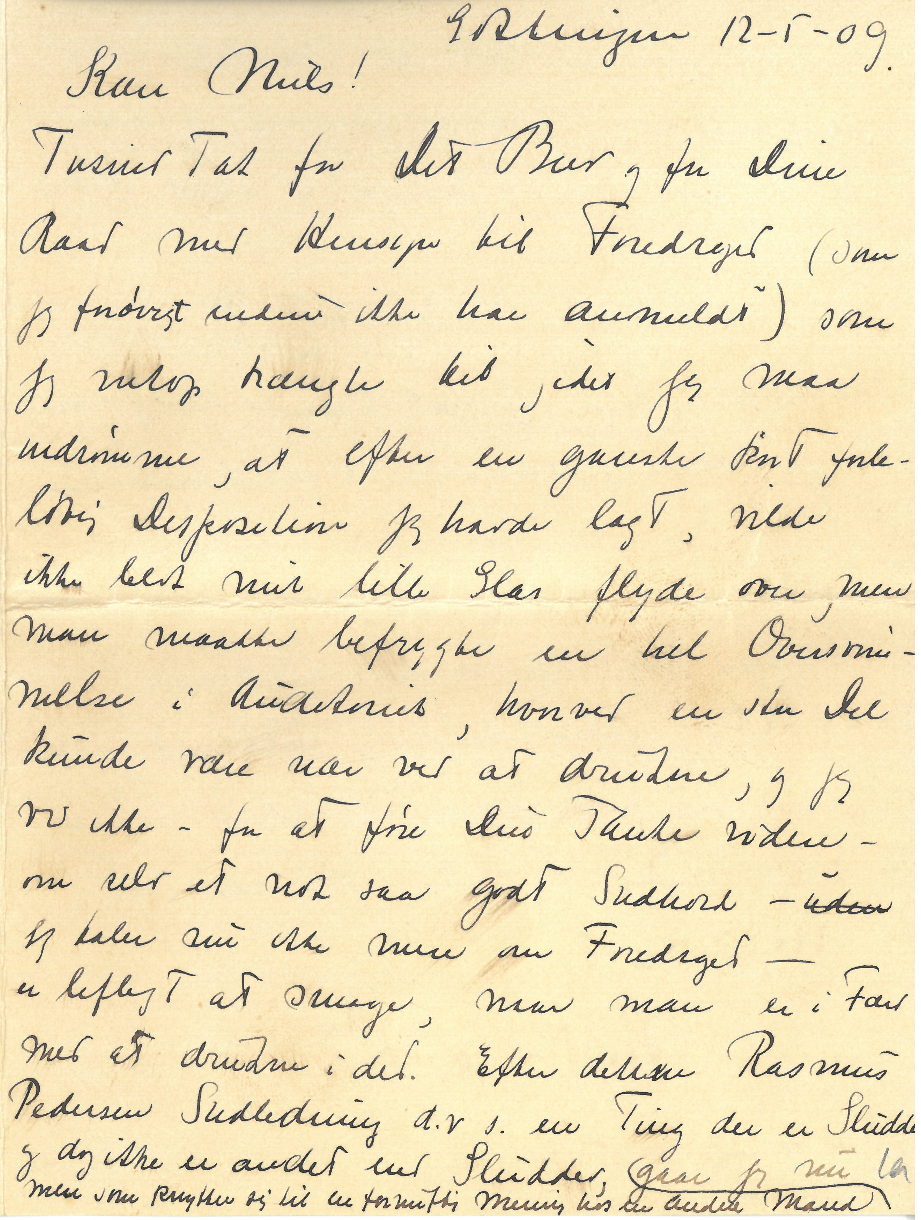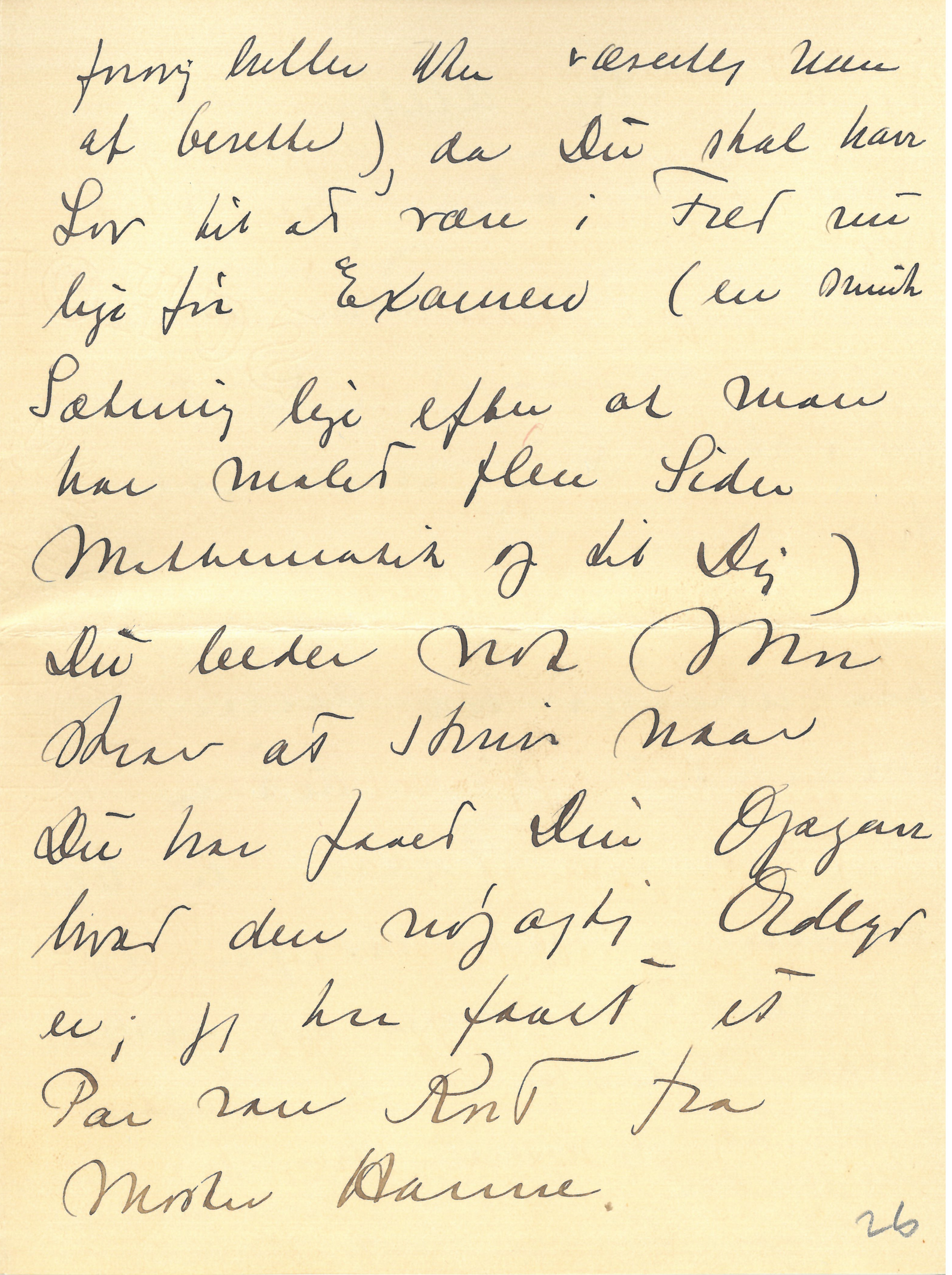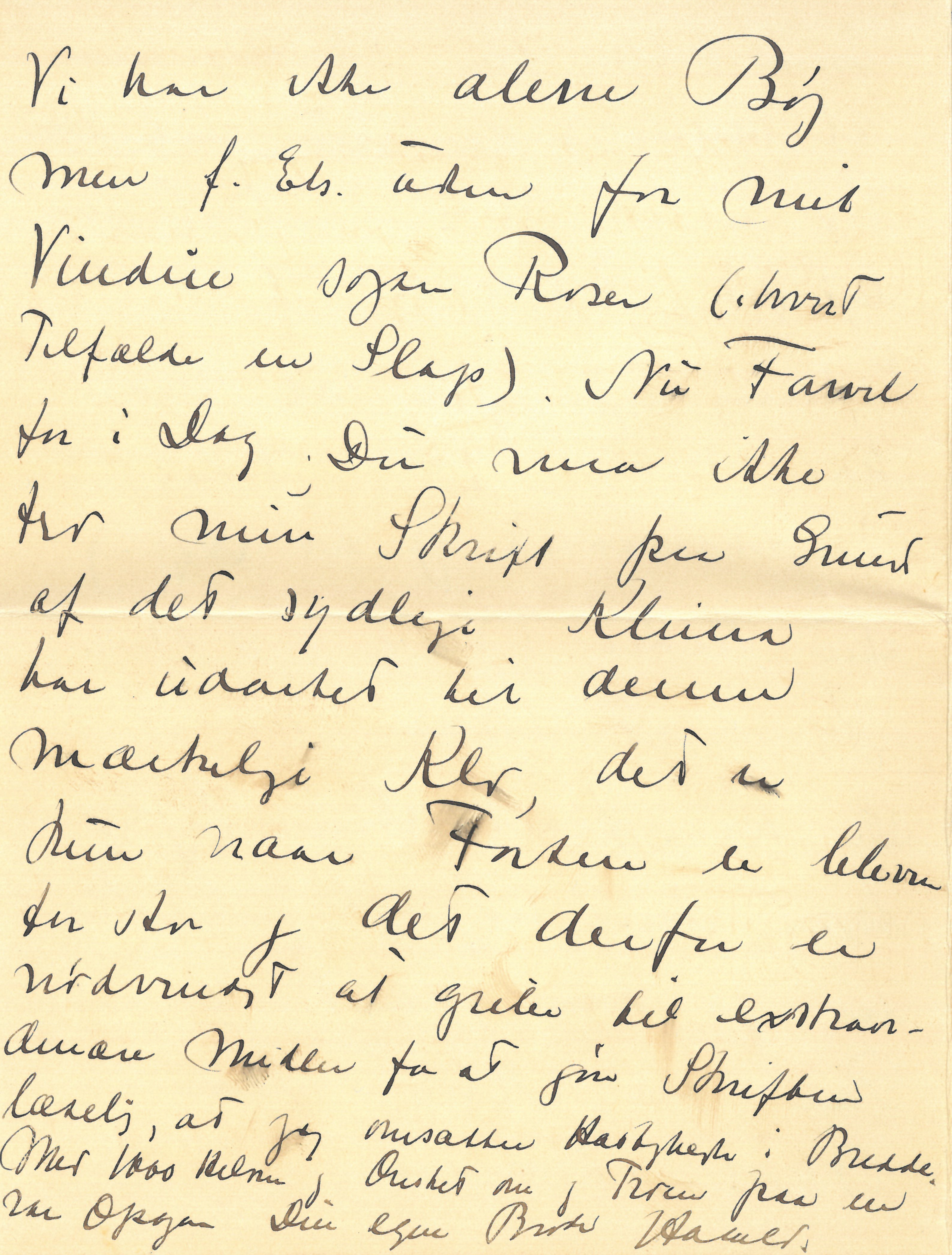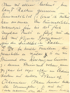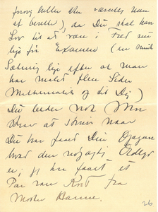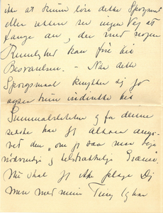 |Vi har ikke alene Bøg men f. Eks. uden for mit Vindue ogsaa Roser (i hvert Tilfælde en Slags). Nu Farvel for i Dag. Du maa ikke tro min Skrift paa Grund af det sydlige Klima har udartet til denne mærkelige Klo, det er kun naar Farten er bleven for stor og det derfor er nødvendigt at gribe til extraordinære Midler for at gøre Skriften læselig, at jeg omsætter Hastigheden i Bredde. Med 1000 Hilsner og Ønsket om og Troen paa en rar Opgave.