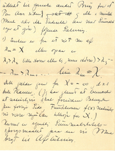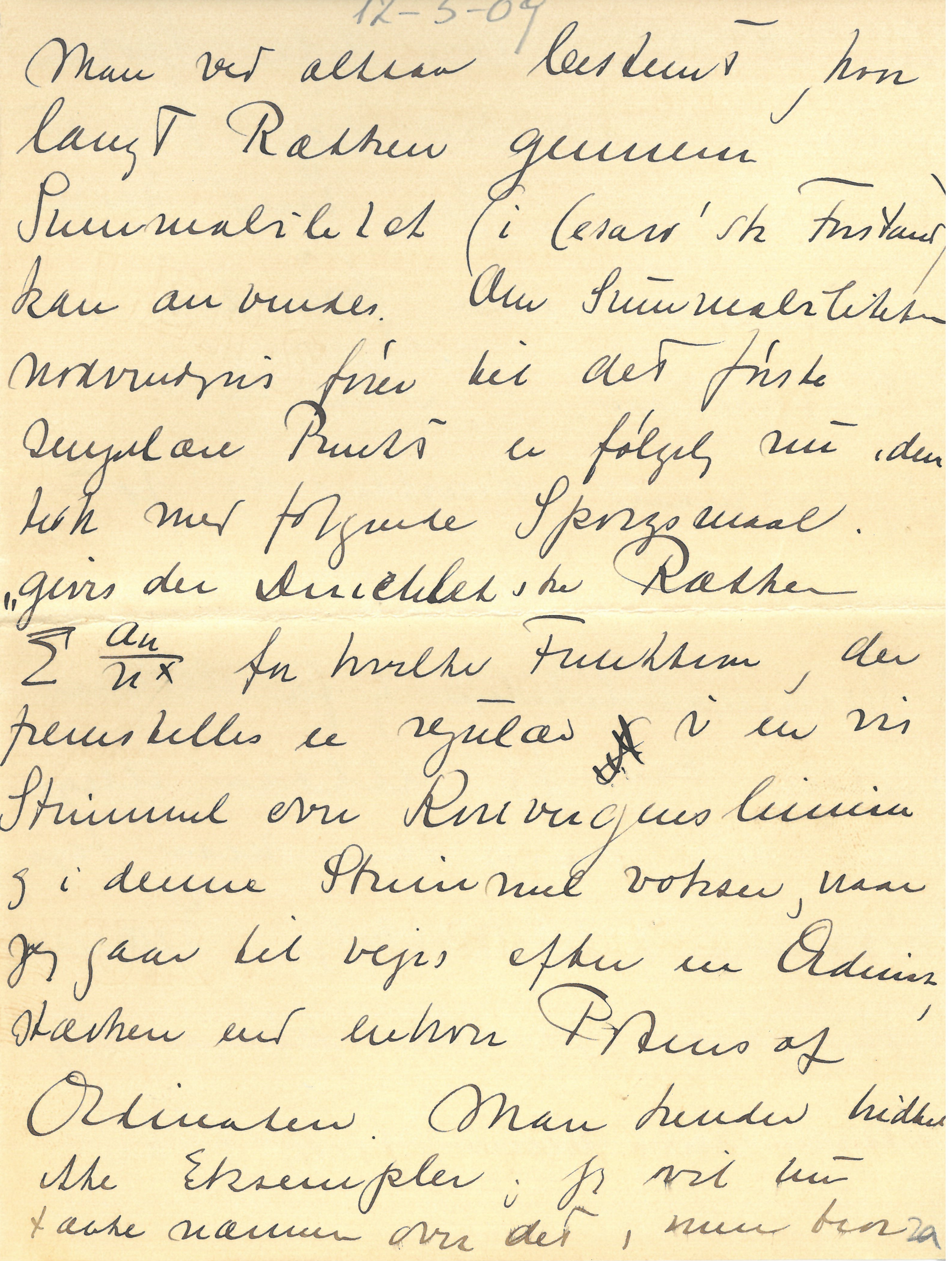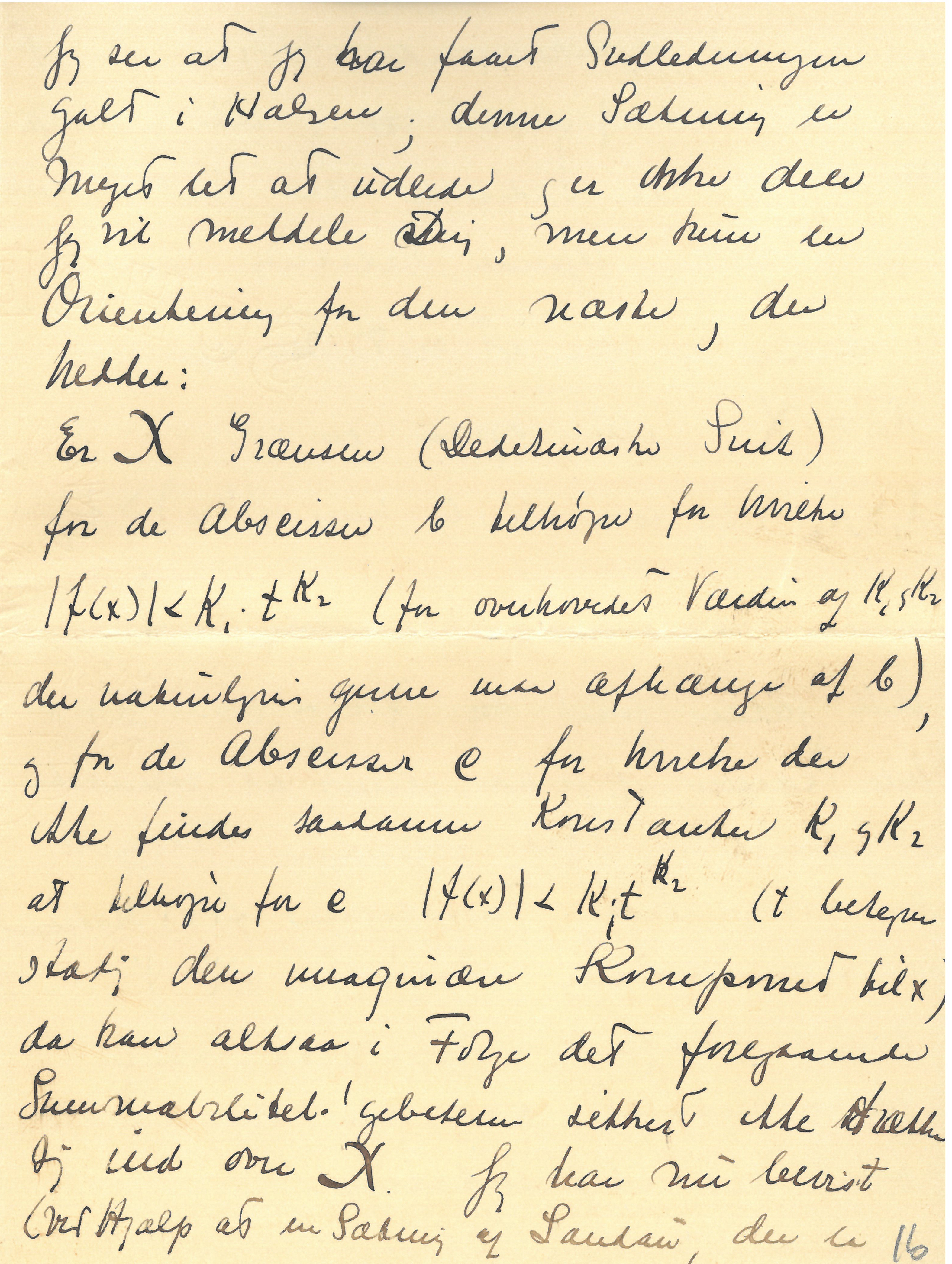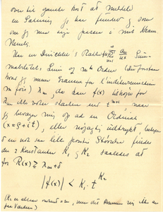 |Man ved altsaa bestemt, hvor langt Rækken gennem Summabilitet (i Cesaro’sk Forstand) kan anvendes. Om Summabiliteten nødvendigvis fører til det første singulære Punkt er følgelig nu identisk med følgende Spørgsmaal, “gives der Dirichletske Rækker \(\sum \frac{a_{n}}{n^{x}}\) for hvilke Funktionen, der fremstilles er regulær i en vis Strimmel over Konvergenslinien og i denne Strimmel vokser, naar jeg gaar til vejrs efter en Ordinat stærkere end enhver Potens af Ordinaten. Man kender hidtil ikke Eksempler; jeg vil nu tænke nærmere over det, man tror |ikke at kunne løse dette Spørgsmaal eller rettere ser ingen Vej at fange an, der med nogen Rimelighed kan føre til Besvarelsen. – Naa dette Spørgsmaal knytter sig jo ogsaa kun indirekte til Summabiliteten og for denne sidste har jeg altsaa angivet den “om jeg saa maa sige nødvendige og tilstrækkelige Grænse”. Nu skal jeg ikke plage Dig mere med mine Ting (og har |forøvrig heller ikke væsentlig mere at berette), da Du skal have Lov til at være i Fred nu lige før Examen (en smuk Sætning lige efter at man har malet flere Sider Mathematik op til Dig). Du beder nok Mor straks at skrive naar Du har faaet Din Opgave hvad den nøjagtige Ordlyd er; jeg har faaet et Par rare Kort fra Moster Hanne.
