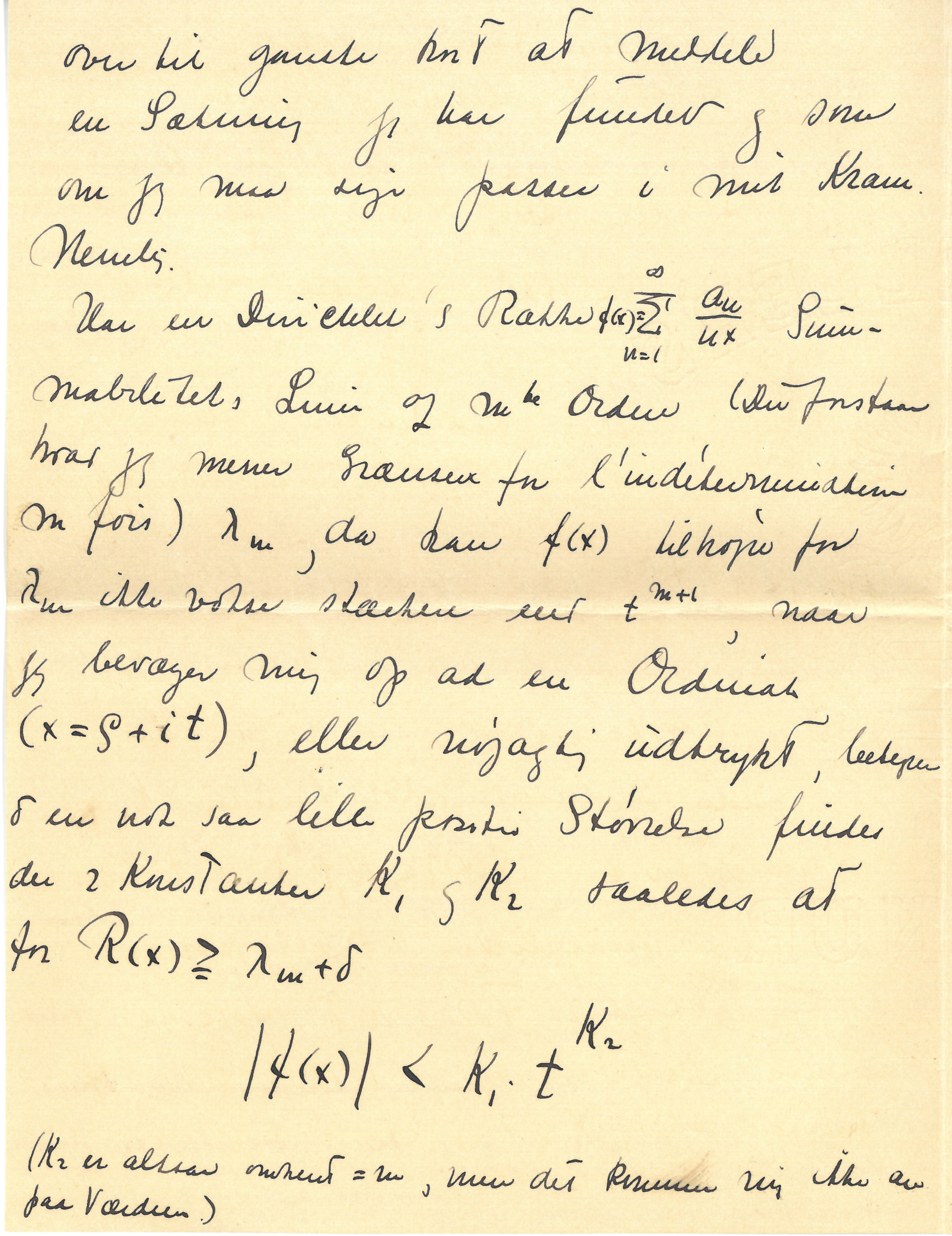 Jeg har nu bevist (ved Hjælp af en Sætning af Landau, der er |udledt til ganske andet Brug for et Par Aar siden og ikke i mindste Maade selv ikke Indirekte har med Summabi. sagen at gøre) følgende