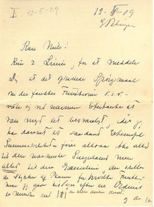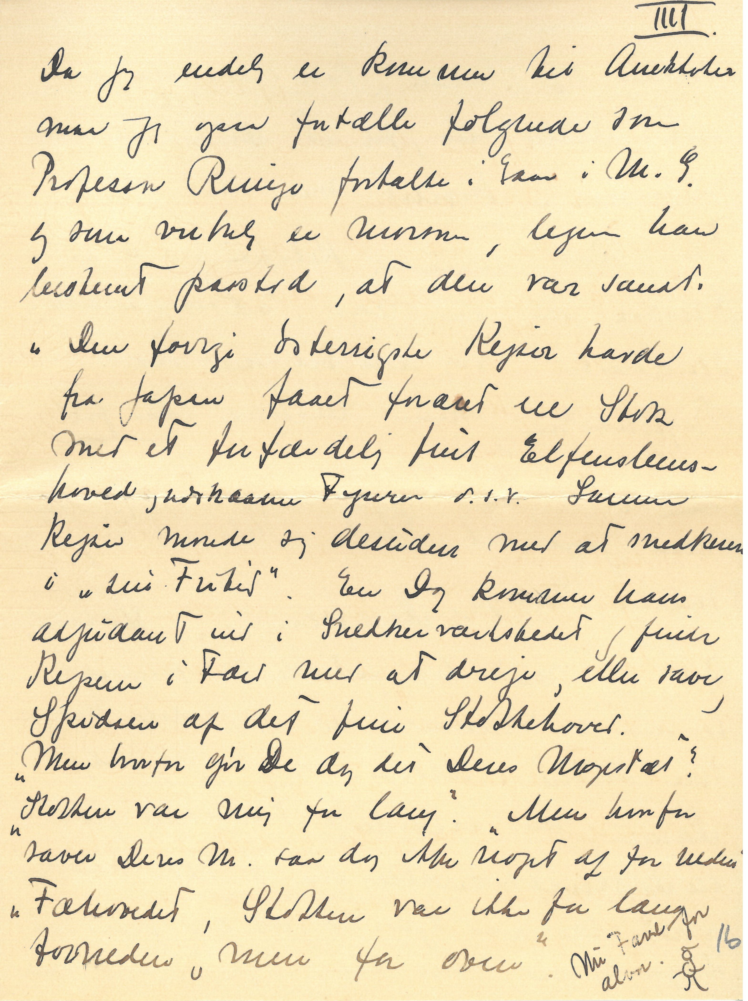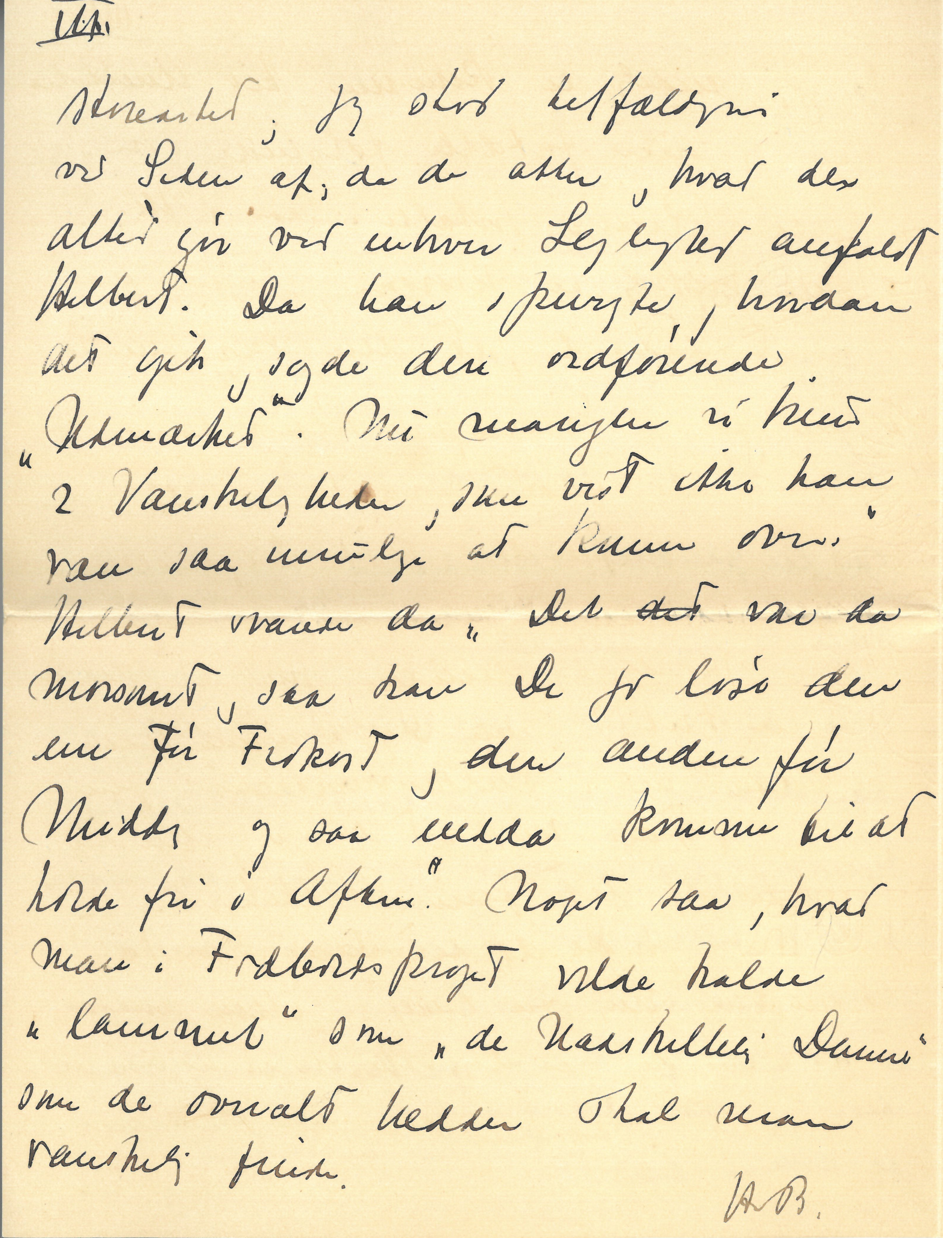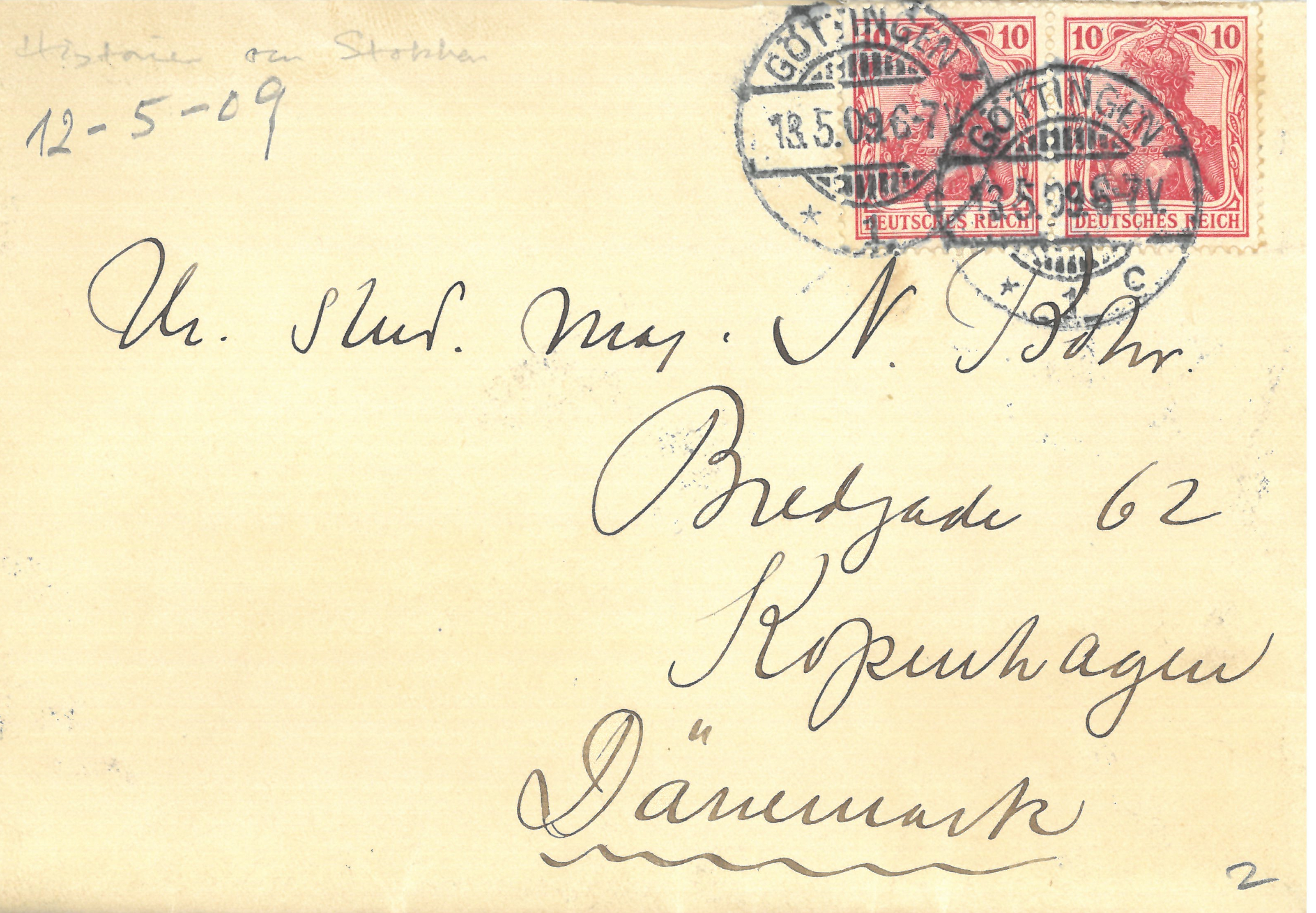 P.S. Jeg maa lige fortælle Dig følgende for dem der overværede det forfærdelige morsomme Svar Hilbert i Morges gav 2 frygtelige Damer, der arbejder "i Fælleskab” paa en Doktorafhandling om 6. Grads Kurver og vist ikke har Spor Begreb om hvad det drejer sig om men altid siger at det gaar |storartet; jeg stod tilfældigvis ved Siden af, da de atter, hvad de altid gør ved enhver Lejlighed anfaldt Hilbert. Da han spurgte, hvordan det gik, sagde den ordførende “Udmærket”. “Nu mangler vi hver 2 Vanskeligheder, som vist ikke kan være saa umulige at komme over.” Hilbert svarede da “Det var da morsomt, saa kan De jo løse den ene før Frokost, den anden før Middag og saa endda komme til at holde fri i Aften.” Noget saa, hvad man i Fodboldsproget vilde kalde “lammet” som “de Vanskelige Damer” som de overalt hedder skal man vanskelig finde.