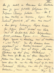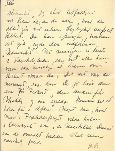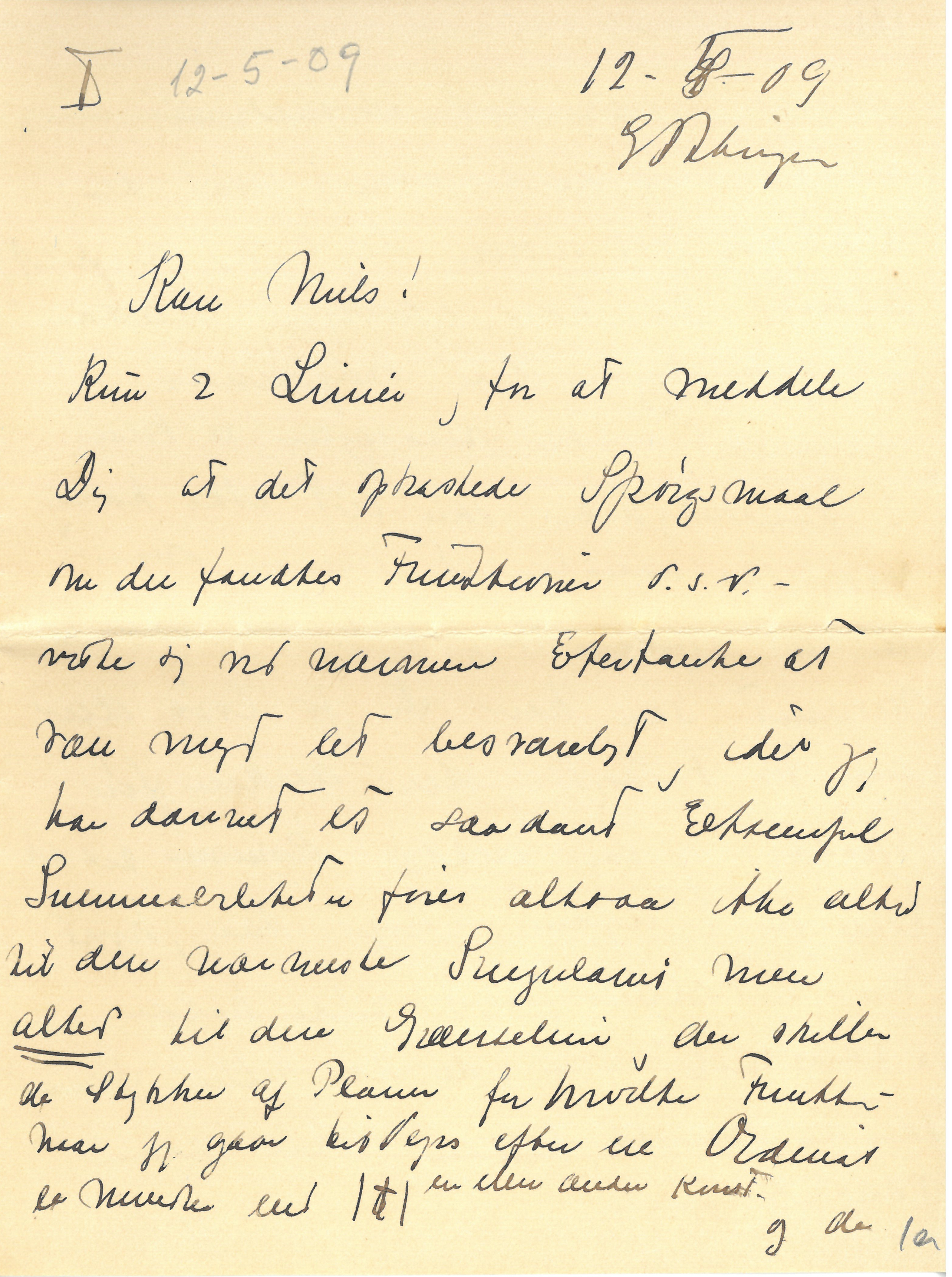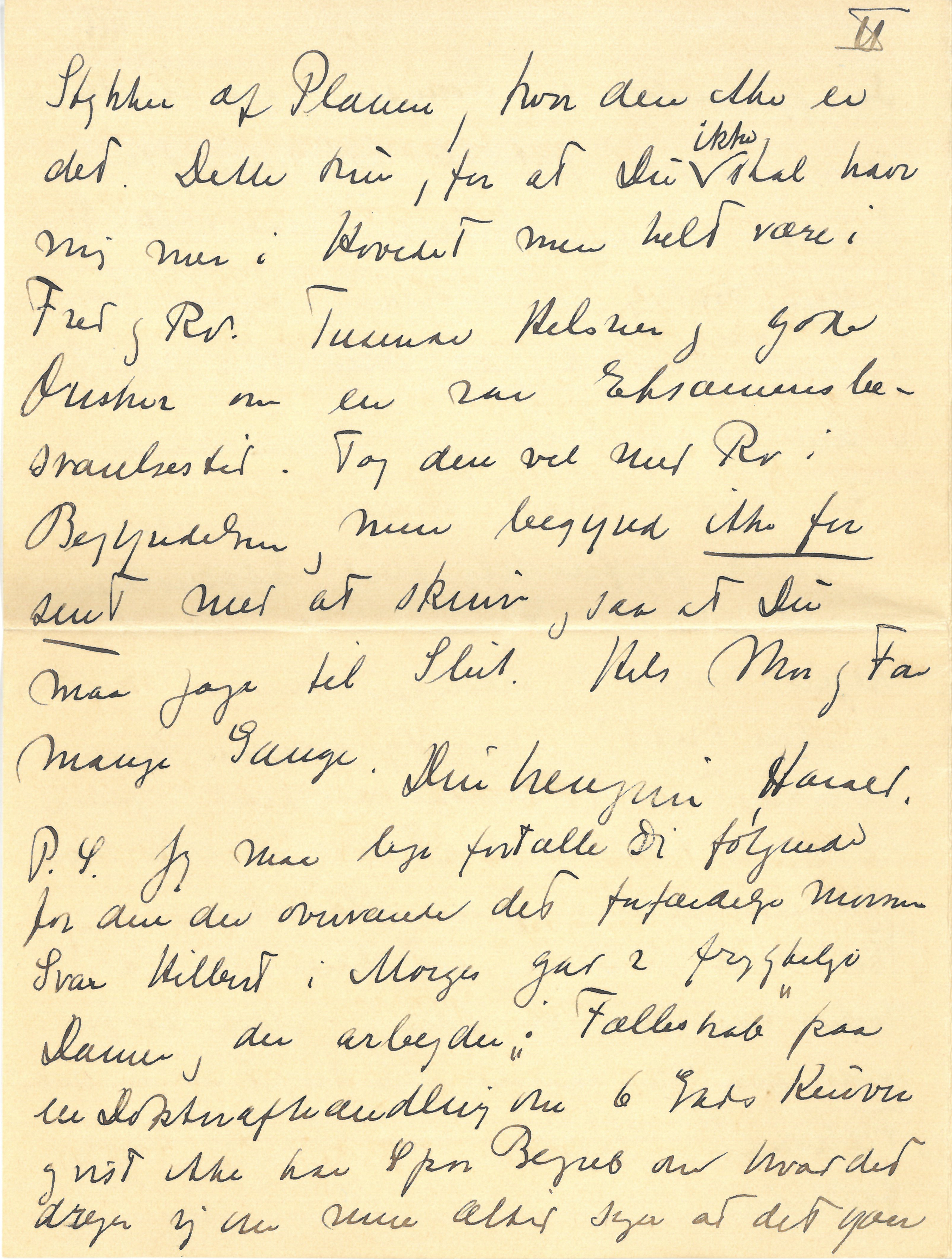 Kun 2 Linier, for at meddele Dig at det opkastede Spørgsmaal om der fandtes Funktioner o.s.v. – viste sig ved nærmere Eftertanke at være meget let besvarligt, idet jeg har dannet et saadant Eksempel Insummabilitet fører altsaa ikke altid til den nærmeste Singularitet men altid til den Grænselinie, der skiller de Stykker af Planen for hvilke Funktioner naar jeg gaar til Vejrs efter en Ordinat er mindre end \(|t|\) en eller anden Konst. og de |Stykker af Planen, hvor den ikke er det. Dette kun, for at Du ikke skal have mig mere i Hovedet men helt være i Fred og Ro. Tusind Hilsner og gode Ønsker om en rar Eksamensbesvarelsestid. Tag den vel med Ro i Begyndelsen, men begynd ikke for sent med at skrive, saa at Du maa jage til Slut. Hils Mor og Far mange Gange.