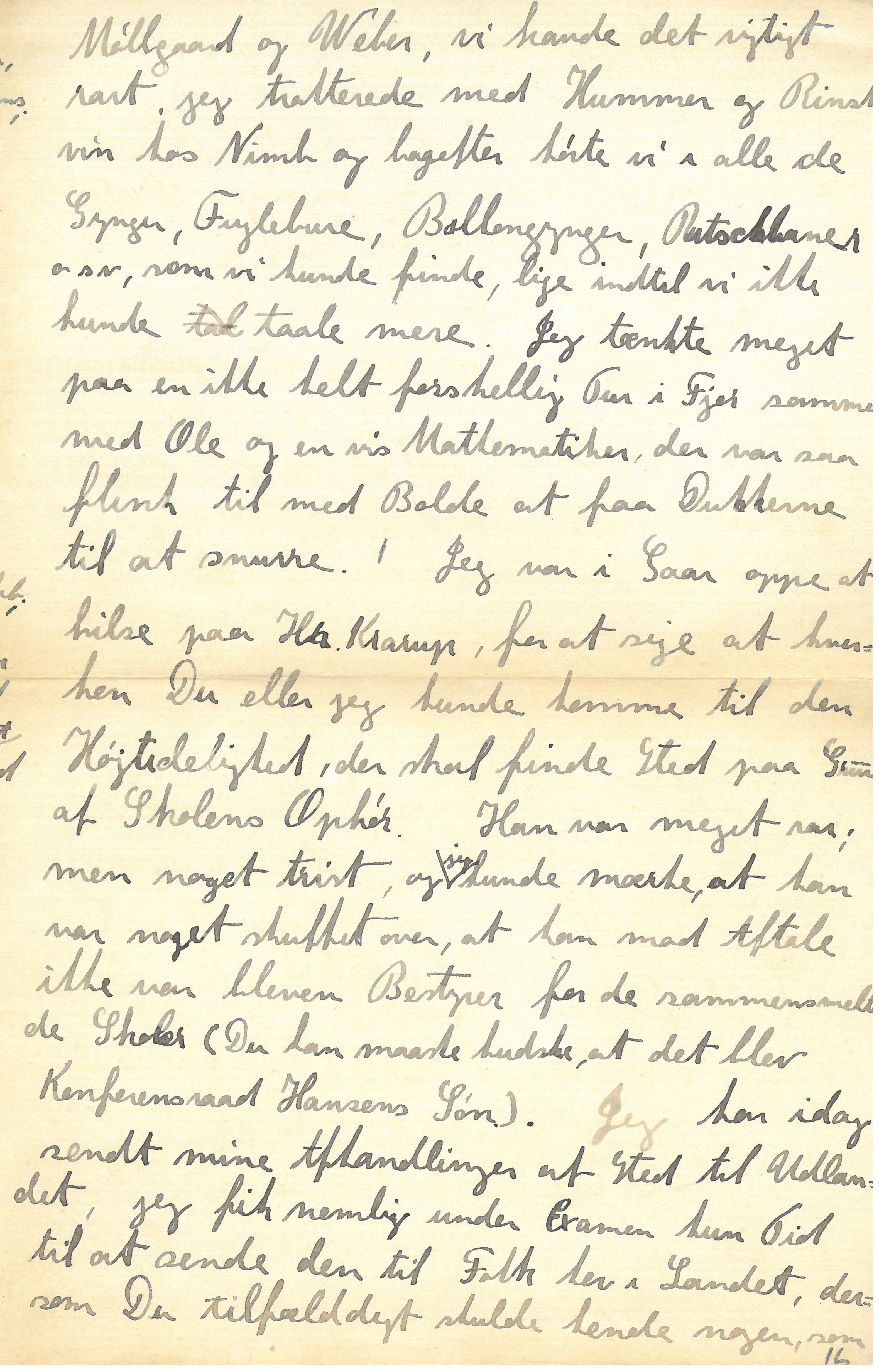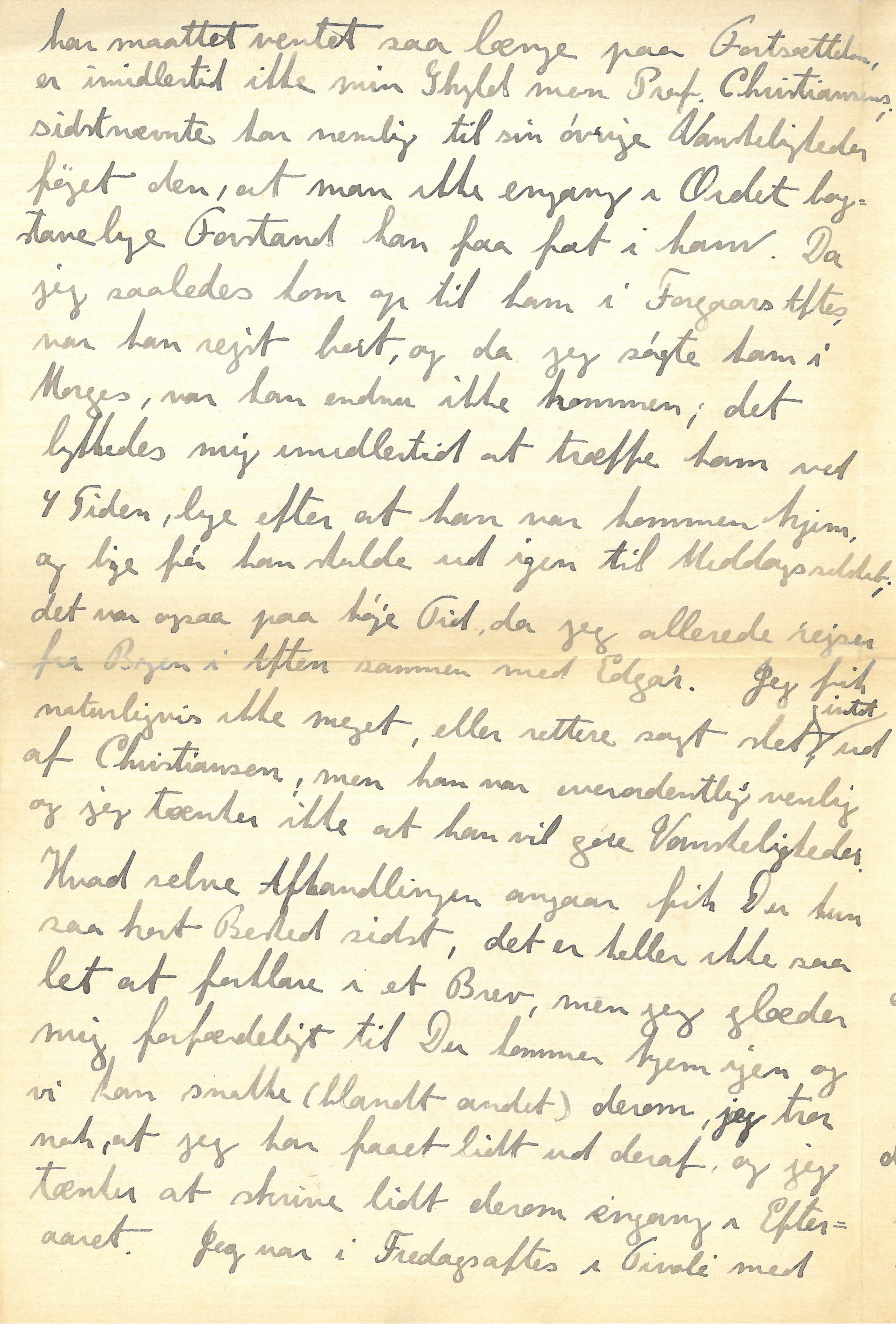 I øvrigt synes det mig, at det omhandlede “rencontre” nok kan være ærgerligt, men ikke behøver at medføre stor Forandring i en vis Mathematikers Planer for den nærmeste Fremtid. Jeg er meget skamfuld over det Grissebrev, som jeg sendte forleden, at Du |har maattet vente saa længe paa Fortsættelsen, er imidlertid ikke min Skyld men Prof. Christiansens; sidstnævnte har nemlig til sin øvrige Vanskeligheder føjet den, at man ikke engang i Ordets bogstavelige Forstand kan faa fat i ham. Da jeg saaledes kom op til ham i Forgaars Aftes, var han rejst bort, og da jeg søgte ham i Morges, var han endnu ikke kommen; det lykkedes mig imidlertid at træffe ham ved 4 Tiden, lige efter at han var kommen hjem, og lige før han skulde ud igen til Middagsselskab; det var ogsaa paa høje Tid, da jeg allerede rejser fra Byen i Aften sammen med Edgar. Jeg fik naturligvis ikke meget, eller rettere sagt slet intet, ud af Christiansen, men han var overordentlig venlig og jeg tænker ikke at han vil gøre Vanskeligheder. Hvad selve Afhandlingen angaar fik Du kun saa kort Besked sidst, det er heller ikke saa let at forklare i et Brev, men jeg glæder mig forfærdeligt til Du kommer hjem igen og vi kan snakke (blandt andet) derom, jeg tror nok, at jeg har faaet lidt ud deraf, og jeg tænker at skrive lidt derom engang i Efteraaret. Jeg var i Fredagsaftes i Tivoli med | Møllgaard og Weber, vi havde det rigtigt rart, jeg trakterede med Hummer og Rinskvin hos Nimb og bagefter kørte vi i alle de Gynger, Fuglebure, Ballongynger, Rutschebaner o.s.v., som vi kunde finde, lige indtil vi ikke kunde taale mere. Jeg tænkte meget paa en ikke helt forskellig Tur i Fjor sammen med Ole og en vis Mathematiker, der var saa flink til med Bolde at faa Dukkerne til at snurre.