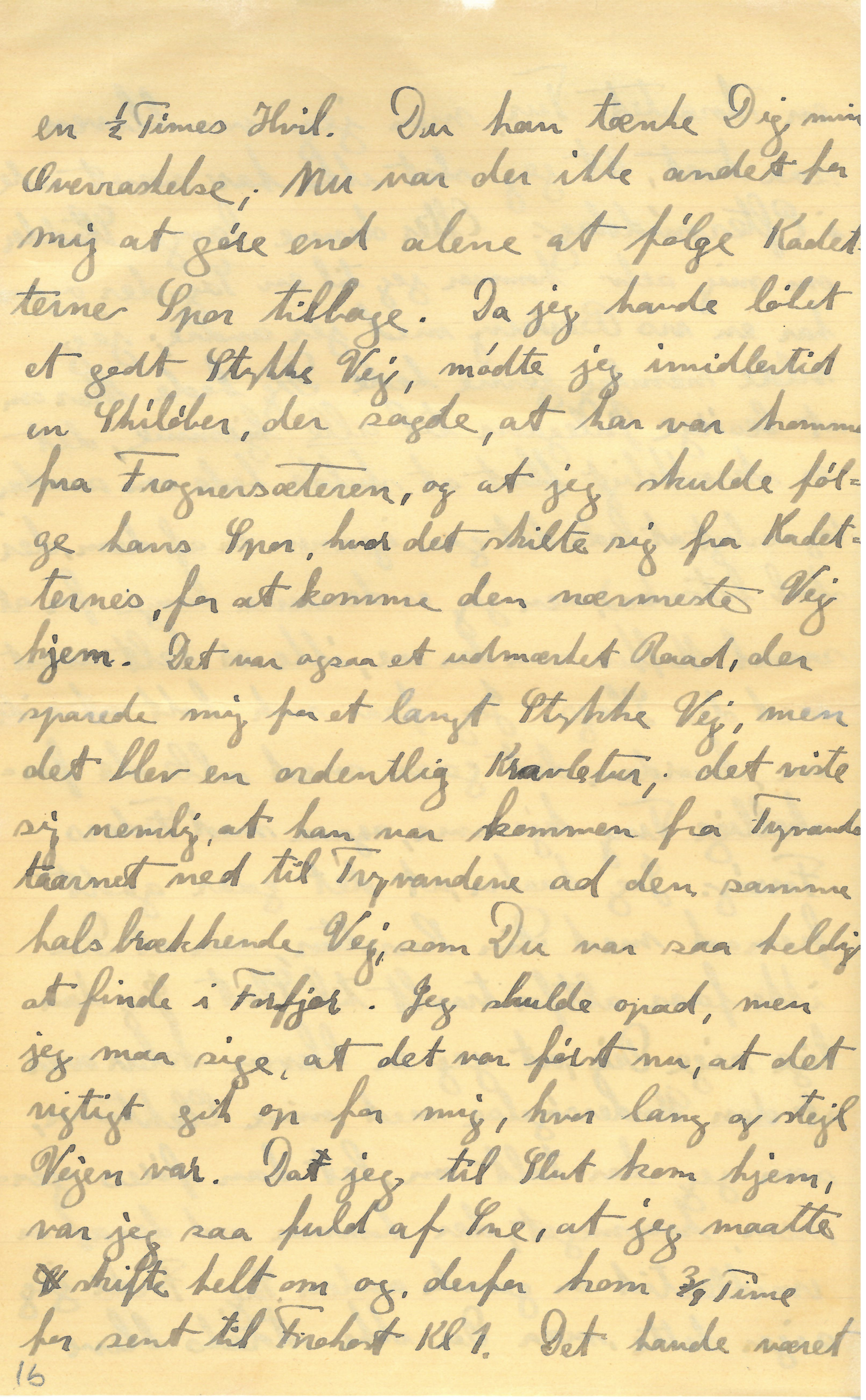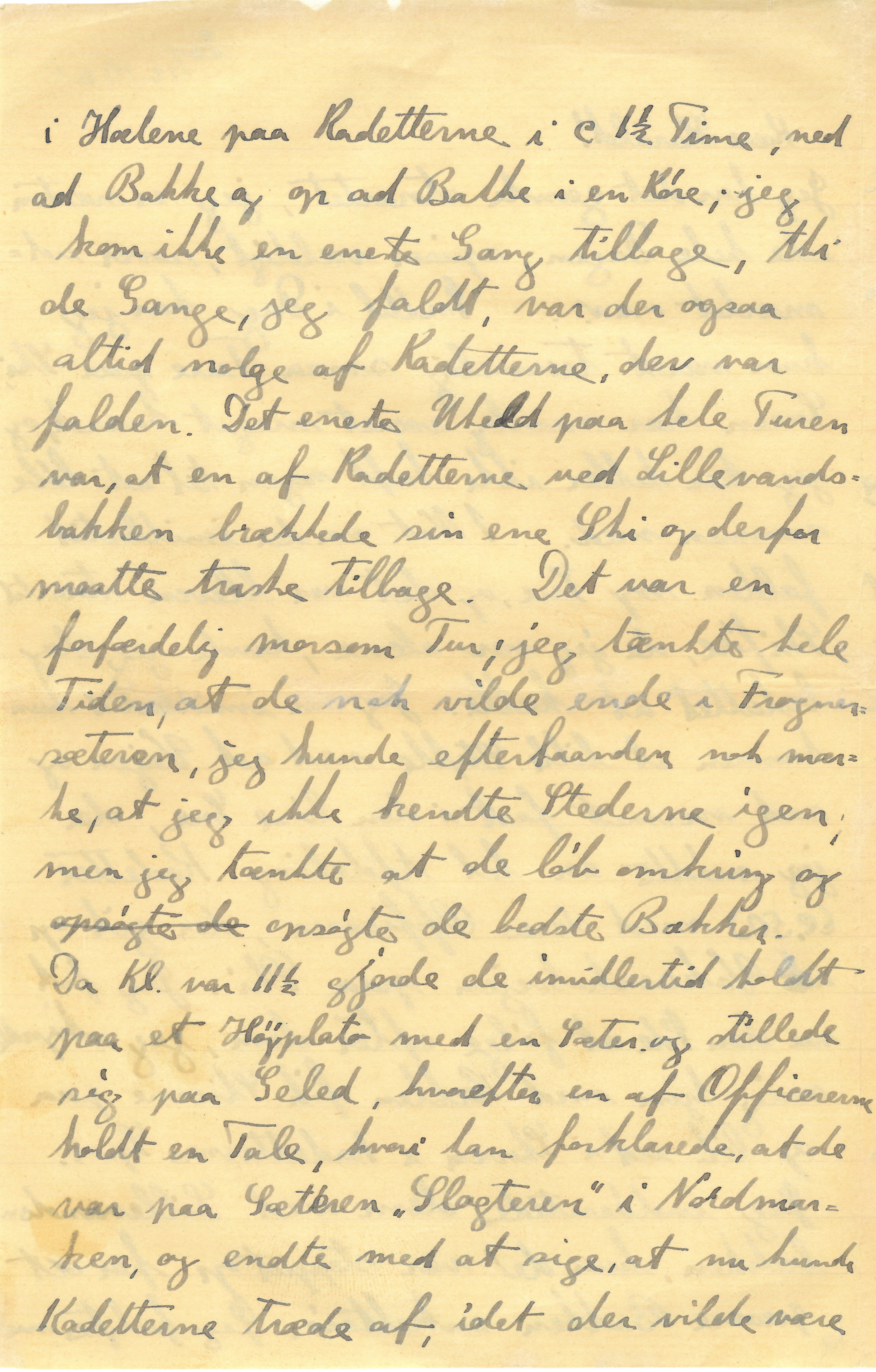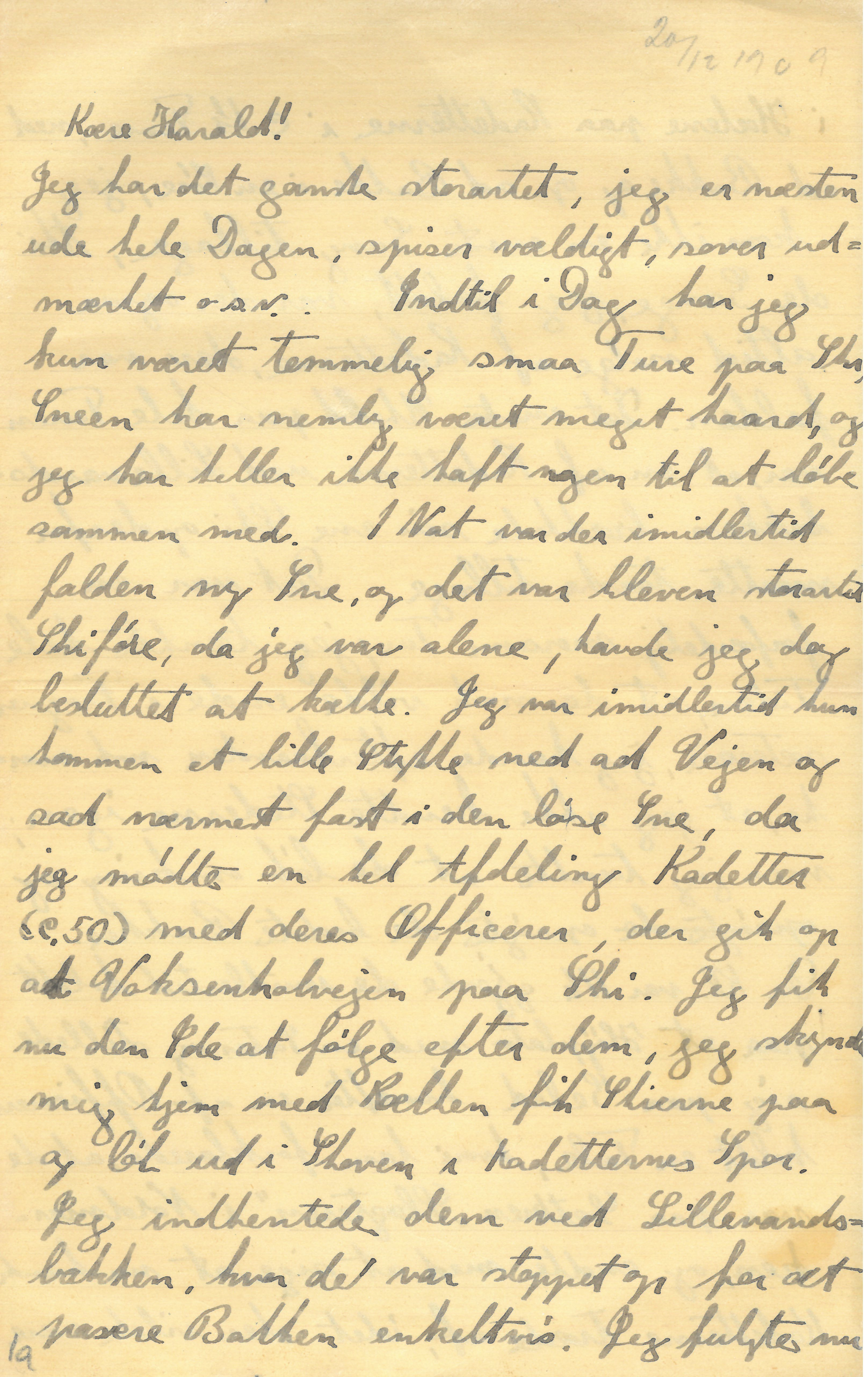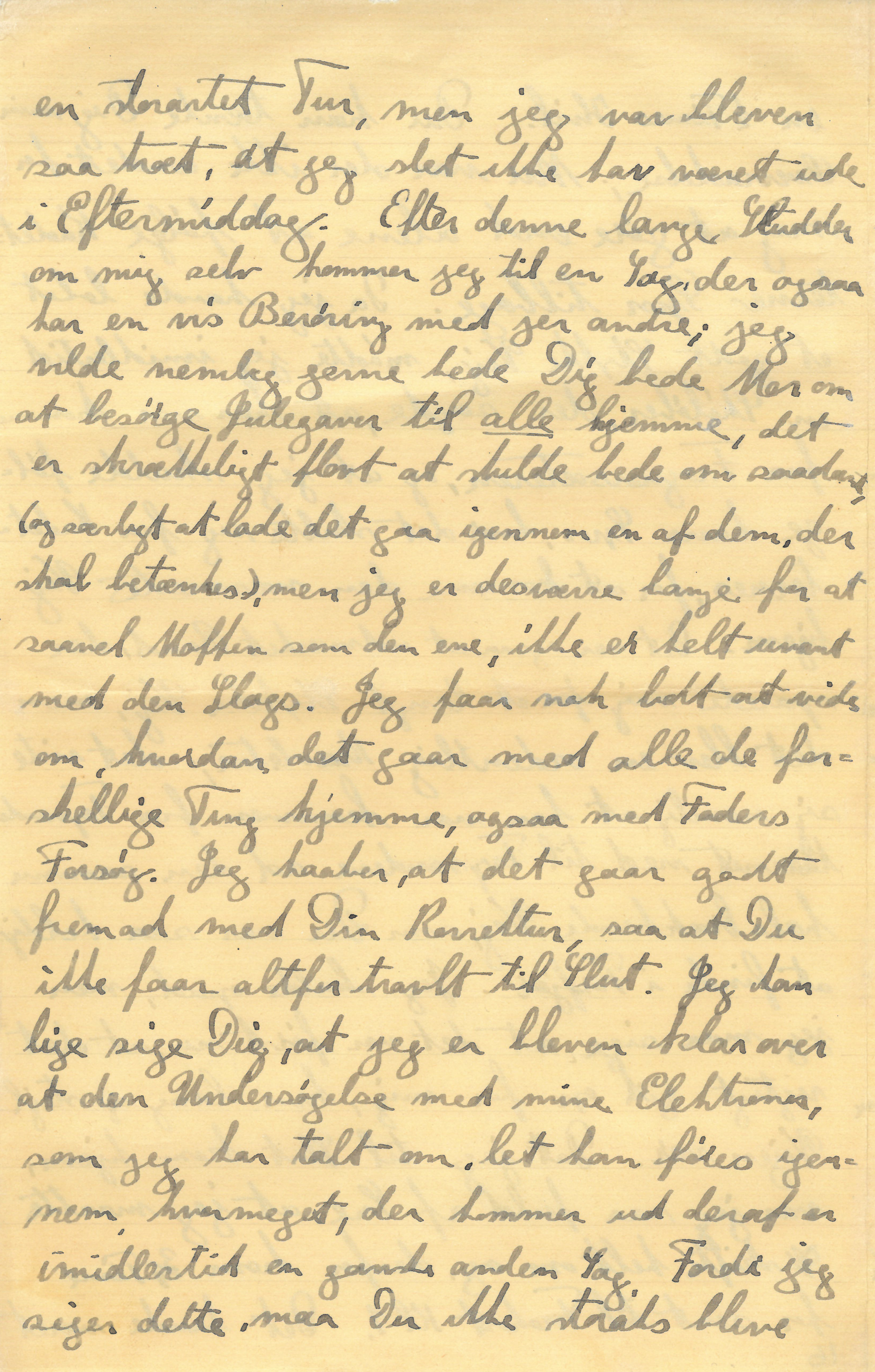 Jeg har det ganske storartet, jeg er næsten ude hele Dagen, spiser vældigt, sover udmærket o.s.v. Indtil i Dag har jeg kun været temmelig smaa Ture paa Ski, Sneen har nemlig været meget haard, og jeg har heller ikke haft nogen til at løbe sammen med. I Nat var der imidlertid falden ny Sne, og det var bleven storartet Skiføre, da jeg var alene, havde jeg dog besluttet at kælke. Jeg var imidlertid kun kommen et lille Stykke ned ad Vejen og sad nærmest fast i den løse Sne, da jeg mødte en hel Afdeling Kadetter (c. 50) med deres Officerer, der gik op ad Voksenkolvejen paa Ski. Jeg fik nu den Ide at følge efter dem, jeg skyndte mig hjem med Kælken fik Skierne paa og løb ud i Skoven i Kadetternes Spor. Jeg indhentede dem ved Lillevandsbækken, hvor de var stoppet for at passere Bækken enkeltvis. Jeg fulgte nu |i Hælene paa Kadetterne i c. 1½ Time, ned ad Bakke og op ad Bakke i en Køre; jeg kom ikke en eneste Gang tilbage, thi de Gange, jeg faldt, var der ogsaa altid nogle af Kadetterne, der var falden. Det eneste Uheld paa hele Turen var, at en af Kadetterne ved Lillevandsbækken brækkede sin ene Ski og derfor maatte traske tilbage. Det var en forfærdelig morsom Tur; jeg tænkte hele Tiden, at de nok vilde ende i Frognersæteren, jeg kunde efterhaanden nok mærke, at jeg ikke kendte Stederne igen; men jeg tænkte at de løb omkring og opsøgte de bedste Bakker. Da Kl. var 11½ gjorde de imidlertid holdt paa et Højplato med en Sæter, og stillede sig paa Geled, hvorefter en af Officererne holdt en Tale, hvori han forklarede, at de var paa Sæteren “Slagteren” i Nordmarken, og endte med at sige, at nu kunde Kadetterne træde af, idet der vilde være |en ½ Times Hvil. Du kan tænke Dig min Overraskelse; Nu var der ikke andet for mig at gøre end alene at følge Kadetternes Spor tilbage. Da jeg havde løbet et godt Stykke Vej, mødte jeg imidlertid en Skiløber, der sagde at han var kommen fra Frognersæteren, og at jeg skulde følge hans Spor, hvor det skilte sig fra Kadetternes, for at komme den nærmeste Vej hjem. Det var ogsaa et udmærket Raad, der sparede mig for et langt Stykke Vej, men det blev en ordentlig Kravletur; det viste sig nemlig, at han var kommen fra Fyrvandstaarnet ned til Tryvandene ad den samme halsbrækkende Vej, som Du var saa heldig at finde i Forfjor. Jeg skulde opad, men jeg maa sige, at det var først nu, at det rigtigt gik op for mig, hvor lang og stejl Vejen var. Da jeg til Slut kom hjem, var jeg saa fuld af Sne, at jeg maatte skifte helt om og, derfor kom ¾ Time for sent til Frokost Kl 1. Det havde været |en storartet Tur, men jeg var bleven saa træt, at jeg slet ikke har været ude i Eftermiddag. Efter denne lange Sludder om mig selv kommer jeg til en Sag, der ogsaa har en vis Berøring med jer andre; jeg vilde nemlig gerne bede Dig bede Mor om at besørge Julegaver til alle hjemme, det er skrækkeligt flovt at skulde bede om saadant, (og særligt at lade det gaa igennem en af dem, der skal betænkes), men jeg er desværre bange for at saavel Moffen som den ene, ikke er helt uvant med den Slags. Jeg faar nok lidt at vide om, hvordan det gaar med alle de forskellige Ting hjemme, ogsaa med Faders Forsøg. Jeg haaber, at det gaar godt fremad med Din Korrektur, saa at Du ikke faar altfor travlt til Slut. Jeg kan lige sige Dig, at jeg er bleven klar over at den Undersøgelse med mine Elektroner, som jeg har talt om, let kan føres igennem, hvormeget, der kommer ud deraf er imidlertid en ganske anden Sag. Fordi jeg siger dette, maa Du ikke straaks blive |bange for, at jeg gaar med saadanne Ting i Hovedet, jeg driver som sagt hele Dagen, og det var kun noget, som pludseligt faldt mig ind, og som jeg fuldstændig lader ligge.