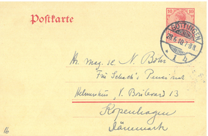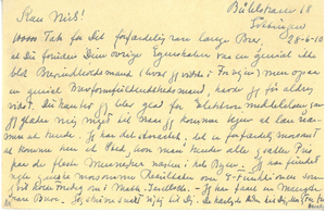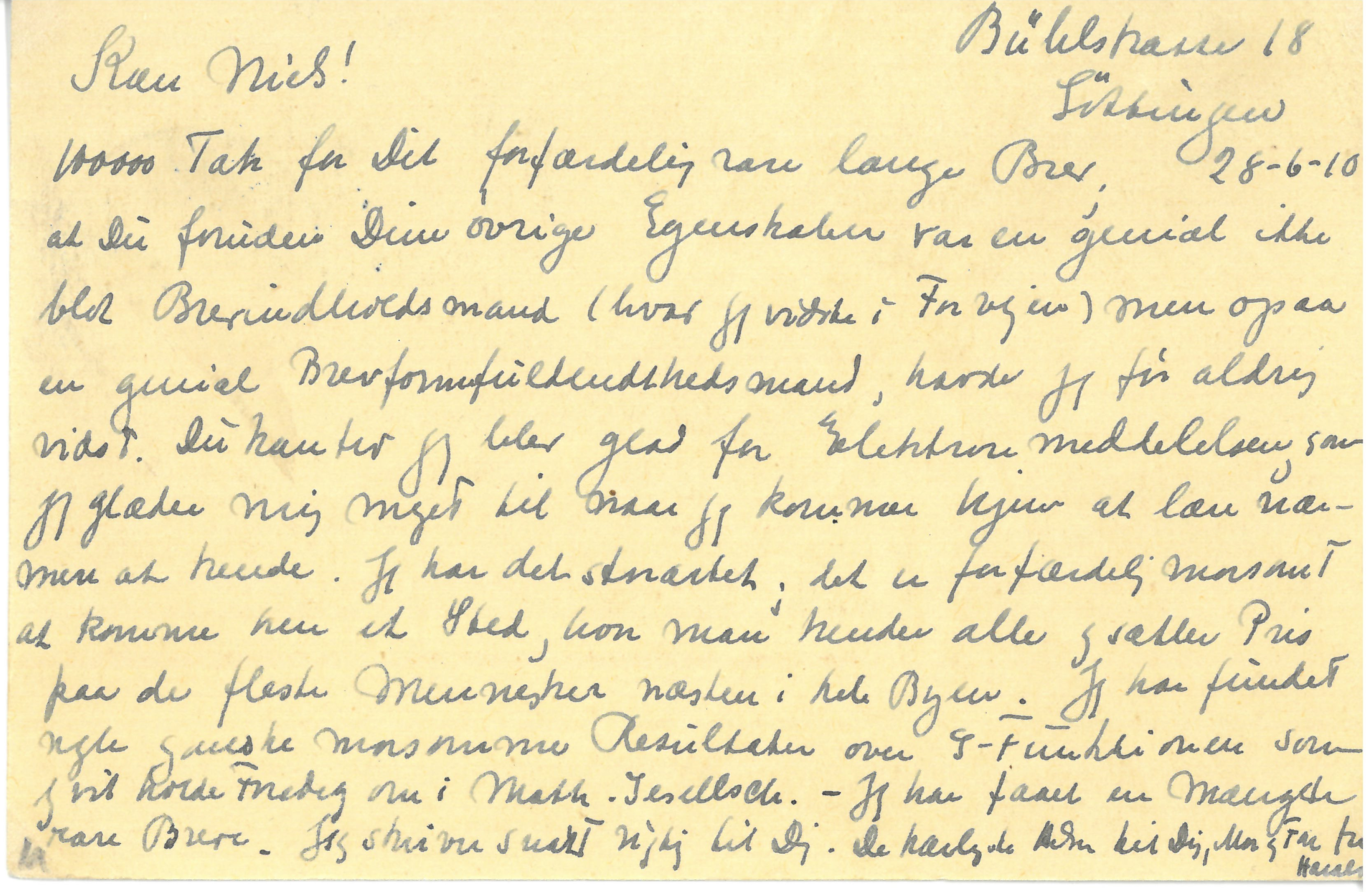 100000 Tak for Dit forfærdelig rare lange Brev; at Du foruden Dine øvrige Egenskaber var en genial ikke blot Brevindholdsmand (hvad jeg vidste i Forvejen) men ogsaa en genial Brevformfuldendthedsmand, havde jeg før aldrig vidst. Du kan tro jeg blev glad for Elektronmeddelelsen, som jeg glæder mig meget til naar jeg kommer hjem at lære nærmere at kende. Jeg har det storartet; det er forfærdelig morsomt at komme hen et Sted, hvor man kender alle og sætter Pris paa de fleste Mennesker næsten i hele Byen. Jeg har fundet nogle ganske morsomme Resultater over \(\zeta\)-Funktionen som jeg vil holde Foredrag om i Math. Gesellsch. – Jeg har faaet en Mængde rare Breve. Jeg skriver snart rigtig til Dig.