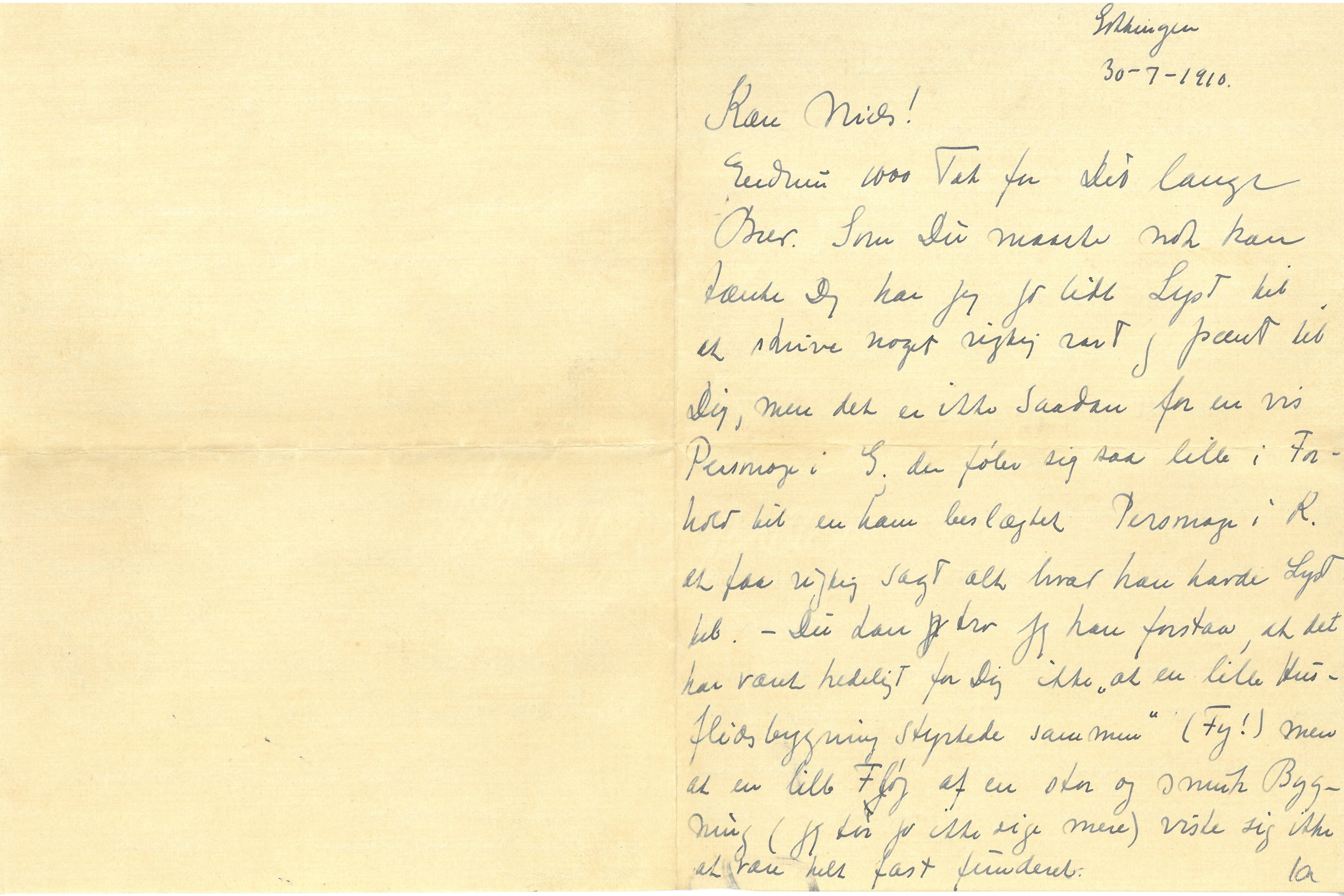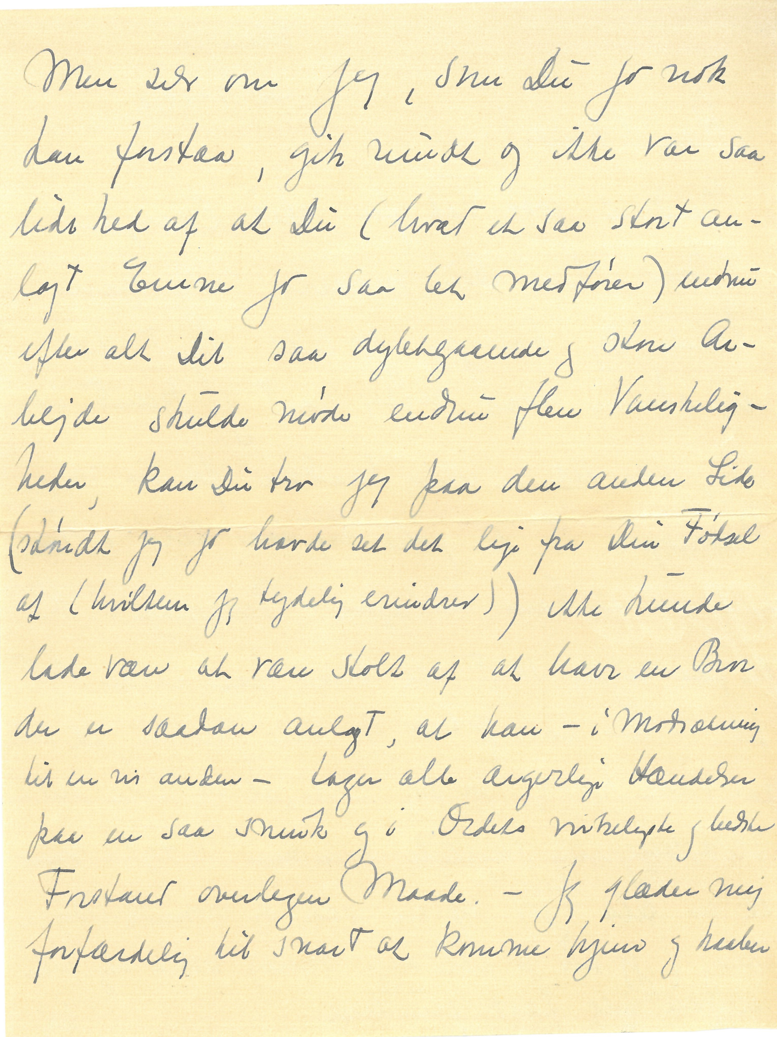 Endnu 1000 Tak for Dit lange Brev. Som Du maaske nok kan tænke Dig har jeg jo lidt Lyst til at skrive noget rigtig rart og pænt til Dig, men det er ikke saadan for en vis Personage i G. der føler sig saa lille i Forhold til en ham beslægtet Personage i K. at faa rigtig sagt alt hvad han havde Lyst til. – Du kan jo tro jeg kan forstaa, at det har været kedeligt for Dig ikke “at en lille Husflidsbygning styrtede sammen” (Fy!) men at en lille Fløj af en stor og smuk Bygning (jeg tør jo ikke sige mere) viste sig ikke at være helt fast funderet.