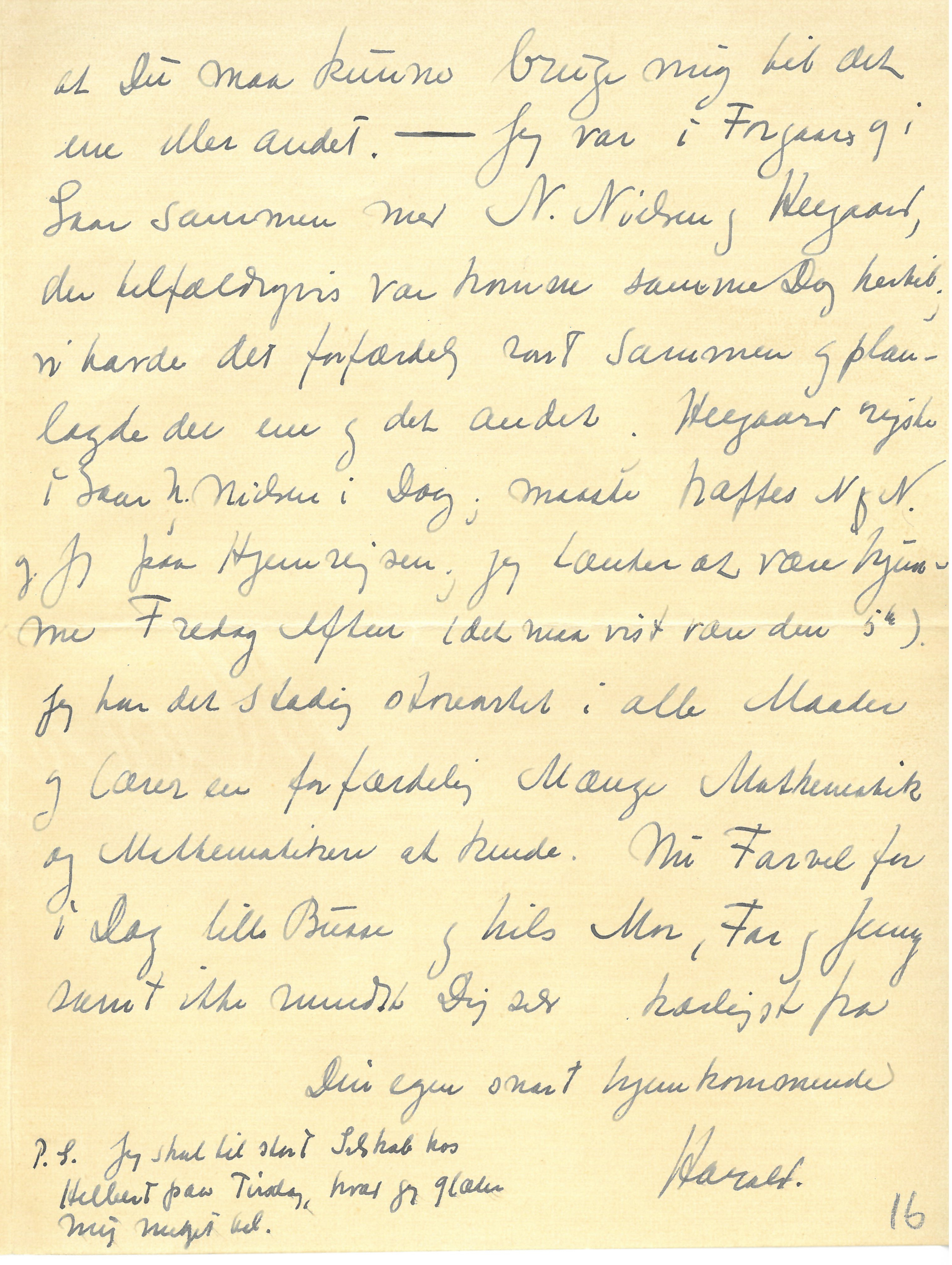 |Men selv om jeg, som Du jo nok kan forstaa, gik rundt og ikke var saa lidt ked af at Du (hvad et saa stort anlagt Emne jo saa let medfører) endnu efter alt Dit saa dybtgaaende og store Arbejde skulde møde endnu flere Vanskeligheder, kan Du tro jeg paa den anden Side (skønt jeg jo havde set det lige fra Din Fødsel af (hvilken jeg tydelig erindrer)) ikke kunde lade være at være stolt af at have en Bror der er saadan anlagt, at han – i Modsætning til en vis anden – tager alle ærgerlige Hændelser paa en saa smuk og i Ordets virkeligste og bedste Forstand overlegen Maade. – Jeg glæder mig forfærdelig til snart at komme hjem og haaber |at Du maa kunne bruge mig til det ene eller andet. – Jeg var i Forgaars og i Gaar sammen med N. Nielsen og Heegaard, der tilfældigvis var komne samme Dag hertil; vi havde det forfærdelig rart sammen og planlagde det ene og det andet. Heegaard rejste i Gaar N. Nielsen i Dag; maaske træffes N., N. og jeg paa Hjemrejsen; jeg tænker at være hjemme Fredag Aften (det maa vist være den 5te). Jeg har det stadig storartet i alle Maader og lærer en forfærdelig Mængde Mathematik og Mathematikere at kende. Nu Farvel for i Dag lille Busse og hils Mor, Far og Jenny samt ikke mindst Dig selv.