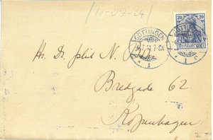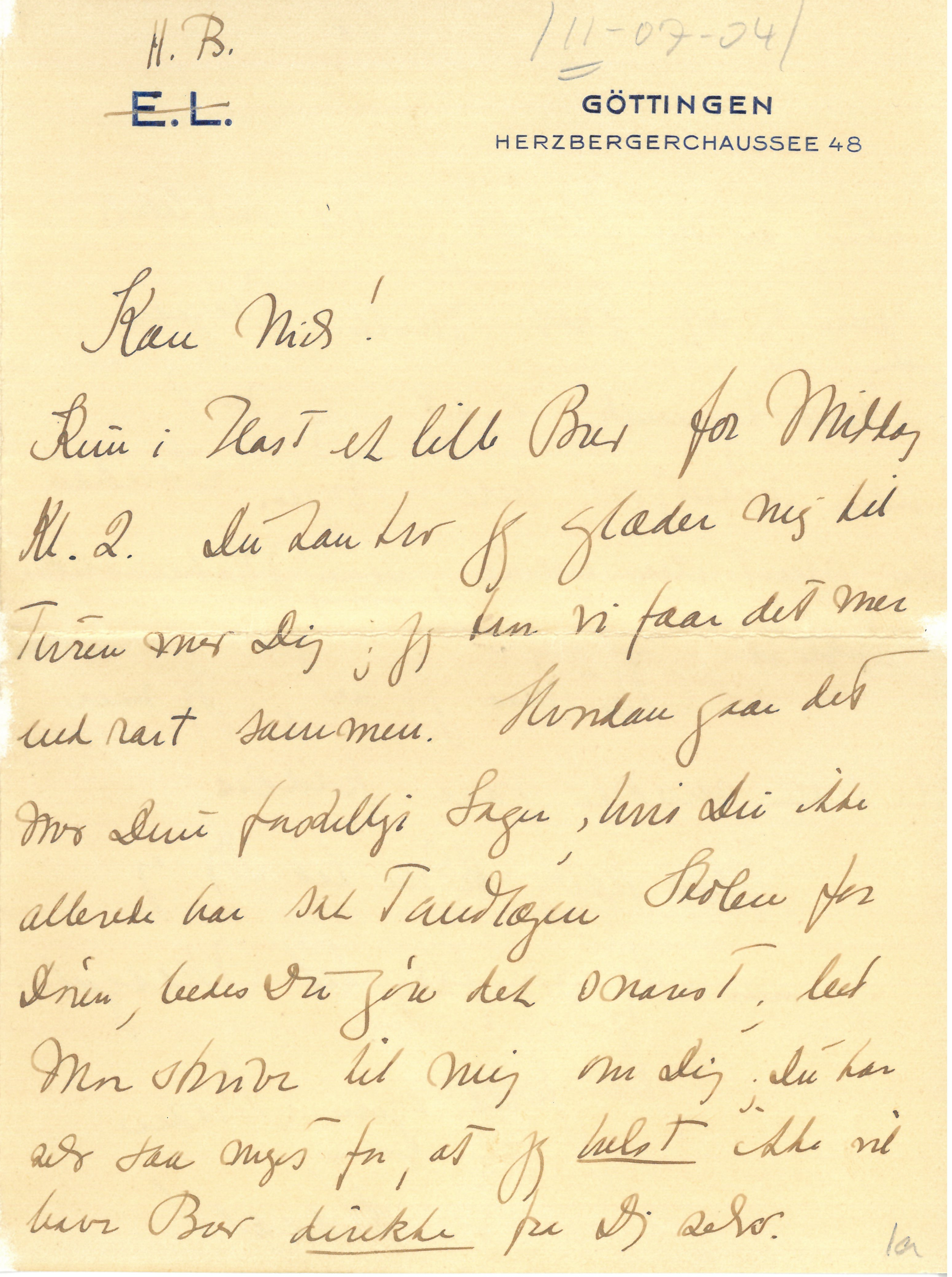 |Jeg har det storartet; har 2 meget store og smukke Værelser med dejlig Udsigt og arbejder som et Bæst. Her er en Orden som er utrolig og, idetmindste, naar den ikke sørges for af en selv, vidunderlig behagelig. Ex. gratia. Her ligger paa Mit Skrivebord 4 Mapper, en med store hvide Ark til at regne paa, Stregpapir og Klatpapir. En med 5 Pfennig og 11 Pfennig Postkarten, 1 med alle mulige Slags Skrivepapir, og endelig 1 med Konvolutter paaklæbede henholdsvis 5, 10 og 20 Pfennig Briefmarken. – Jeg talte 2 Timer med Voigt, som ikke vidste noget om Dit Arbejde; Du ser hvor uhyre vigtigt det er for Dig at faa det ud paa et Verdenssprog. Jeg tror det vil more Dig meget at træffe, selv kun for en Aften, flere af Folkene hernede. Alt, eller næsten |alt, er nu Physik, idet Hilbert giver sig af med Math. Physik, Thermodynamik o.s.v. og med ham naturligvis hele Byen. Landau er snart den eneste, rene, Matematiker i Øjeblikket.