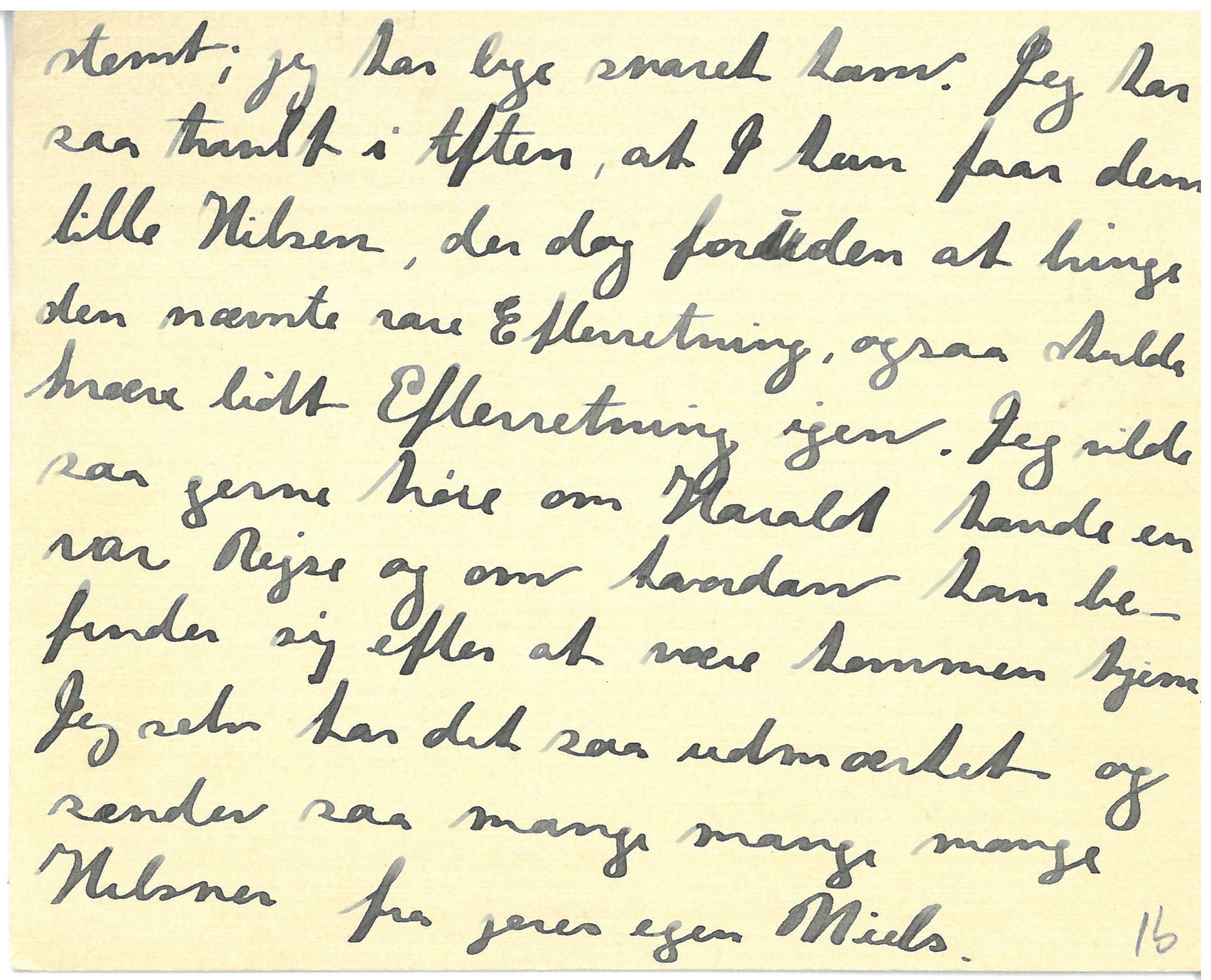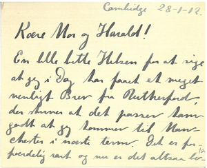 En lille bitte Hilsen for at sige at jeg i Dag har faaet et meget venligt Brev fra Rutherford, der skriver at det passer ham godt at jeg kommer til Manchester i næste term. Det er forfærdelig rart og nu er det altsaa be |stemt; jeg har lige svaret ham. Jeg har saa travlt i Aften, at I kun faar denne lille Hilsen, der dog foruden at bringe den nævnte rare Efterretning, ogsaa skulde kræve lidt Efterretning igen. Jeg vilde saa gerne høre om Harald havde en rar Rejse og om hvordan han befinder sig efter at være kommen hjem. Jeg selv har det saa udmærket og sender saa mange mange mange Hilsner