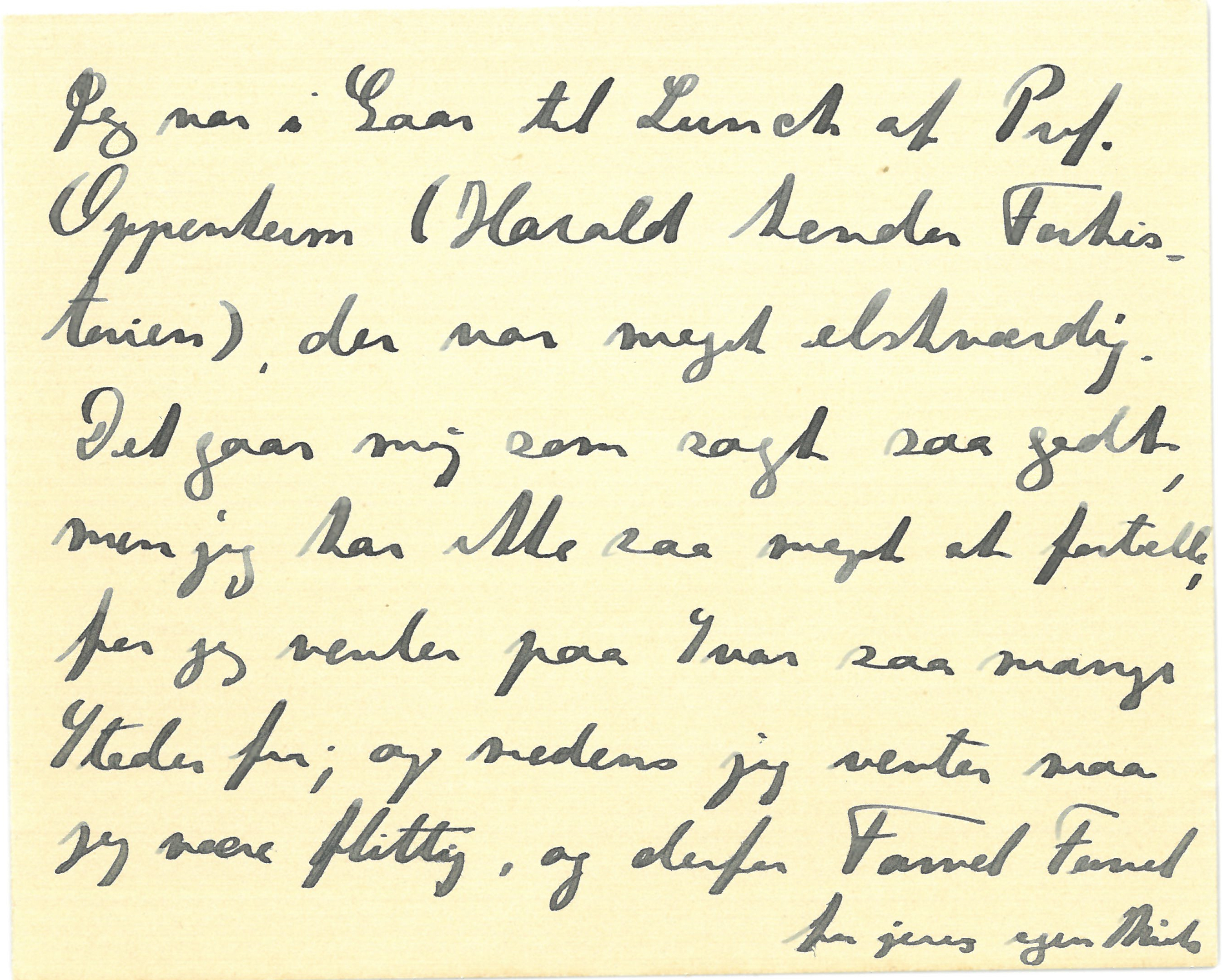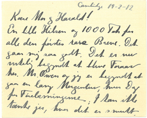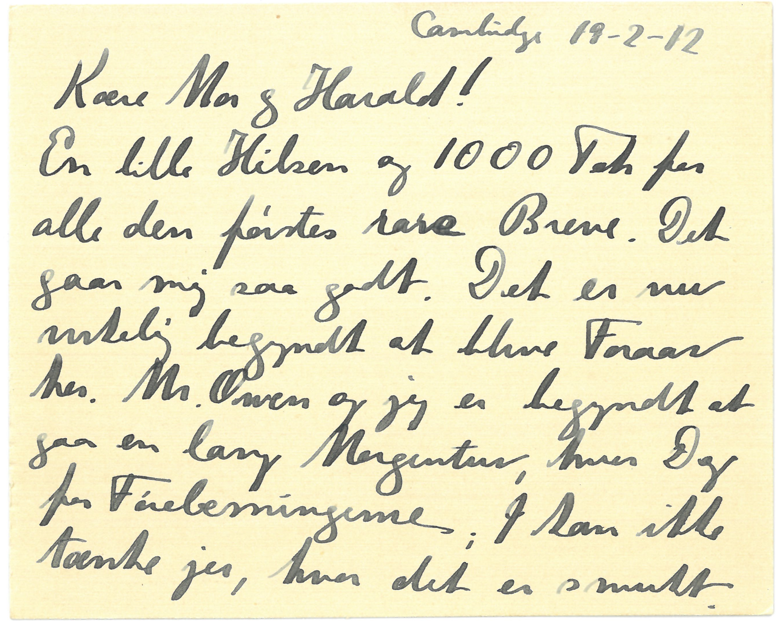 En lille Hilsen og 1000 Tak for alle den førstes rare Breve. Det gaar mig saa godt. Det er nu virkelig begyndt at blive Foraar her. Mr. Owen og jeg er begyndt at gaa en lang Morgentur, hver Dag før Forelæsningerne; I kan ikke tænke jer, hvor det er smukt. |Jeg var i Gaar til Lunch af Prof. Oppenheim (Harald kender Forhistorien), der var meget elskværdig. Det gaar mig som sagt saa godt, men jeg har ikke saa meget at fortælle, for jeg venter paa Svar saa mange Steder fra; og medens jeg venter maa jeg være flittig, og derfor Farvel Farvel