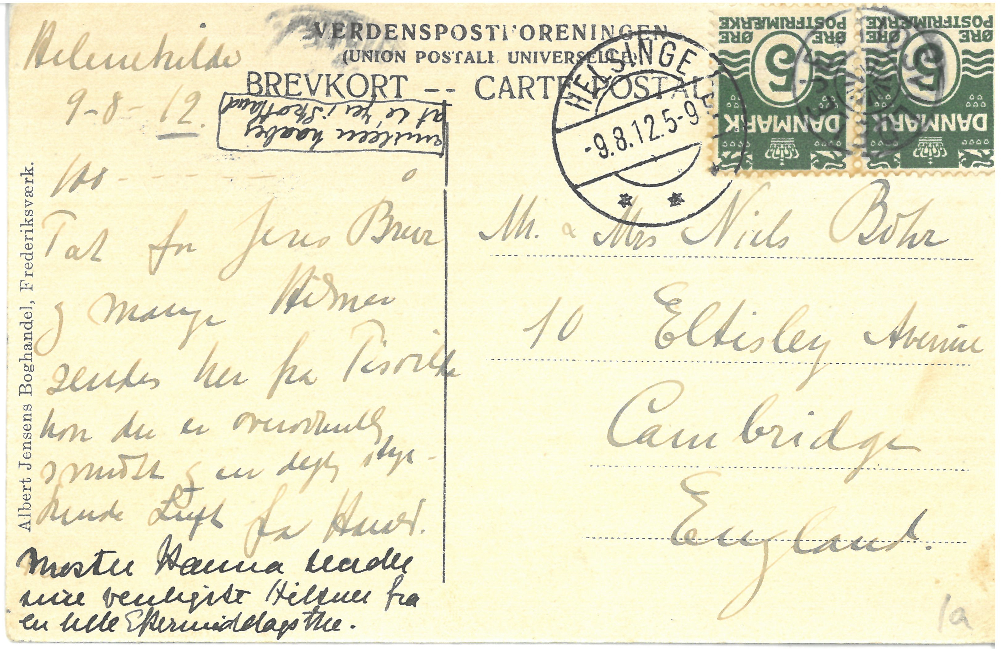 A København, Niels Bohr Arkivet, Harald Bohr Correspondence, HBC-BOHR-120809fa. Postkort med motiv fra Helenekilde Badehotel i Tisvilde skrevet egenhændigt af Harald Bohr. Adresseret til: Mr. & Mrs Niels Bohr, 10 Eltisley Avenue, Cambridge, England.