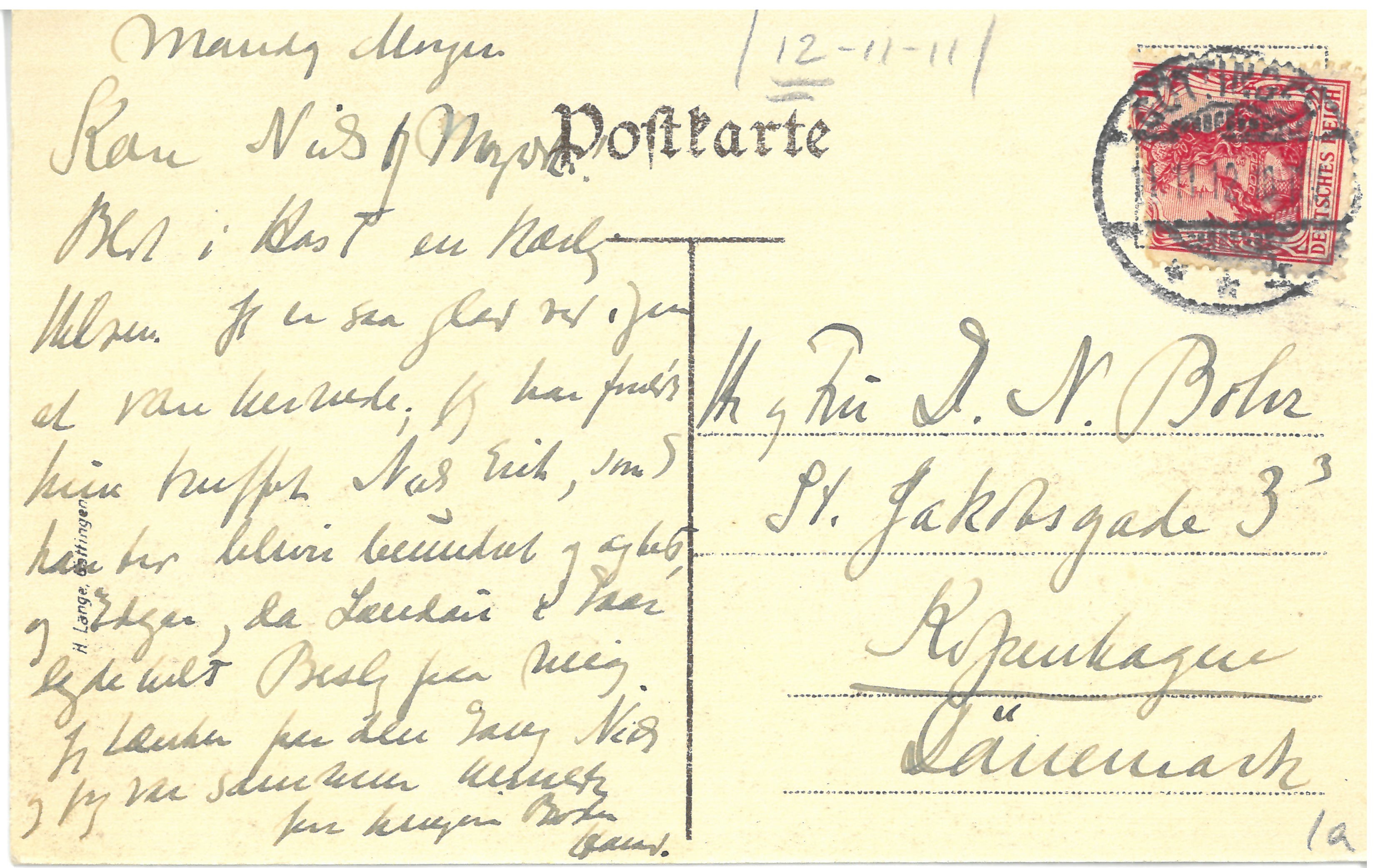 Blot i Hast en kærlig Hilsen. Jeg er saa glad ved igen at være hernede; jeg har foreløbig kun truffet Niels Erik, som I kan tro bliver beundret og agtet, og Edgar, da Landau i Gaar lagde helt Beslag paa mig.