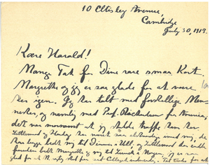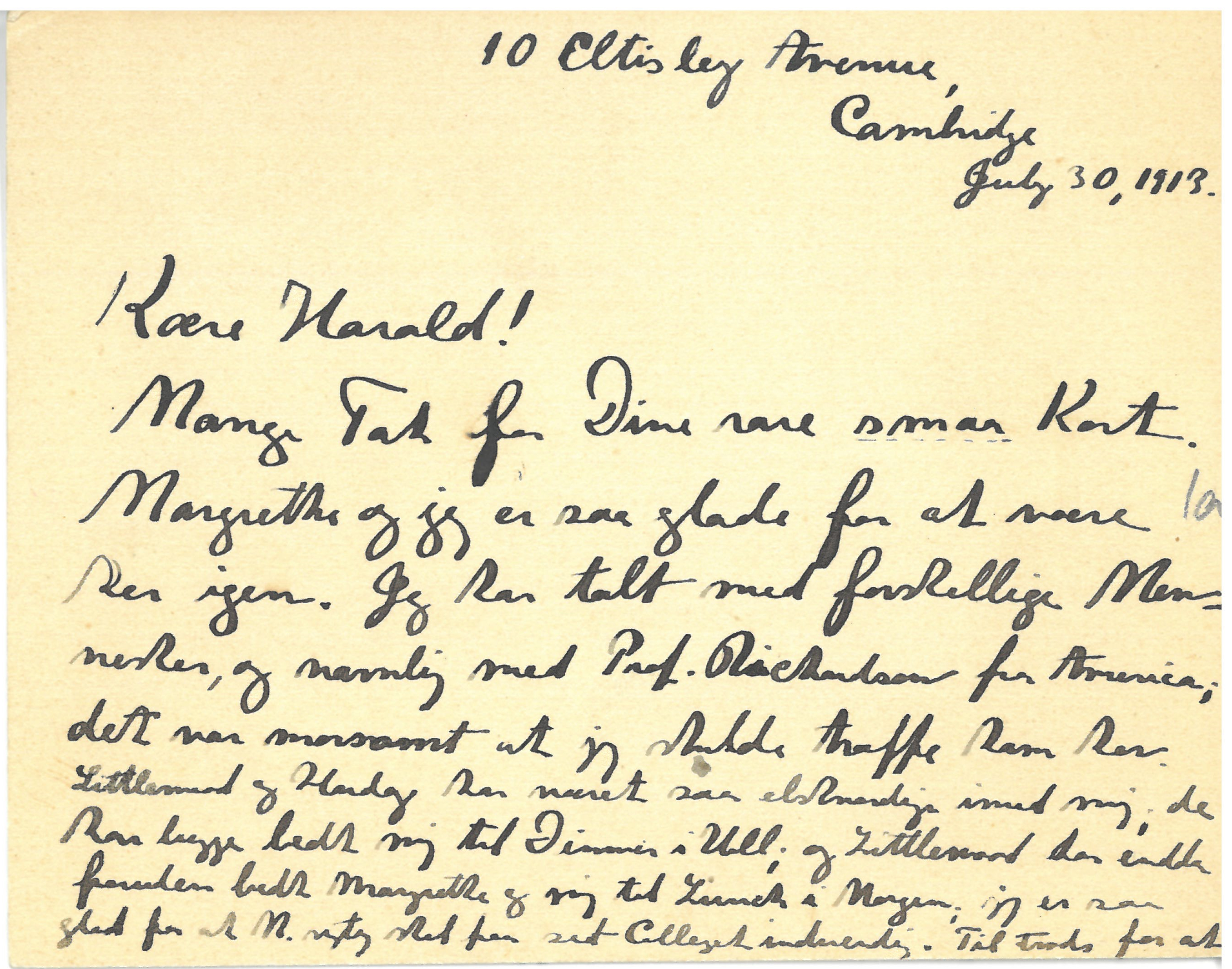 Mange Tak for Dine rare smaa Kort. Margrethe og jeg er saa glade for at være her igen. Jeg har talt med forskellige Mennesker, og navnlig med Prof. Richardson fra America; det var morsomt at jeg skulde træffe ham her. Littlewood og Hardy har været saa elskværdige imod mig; de har begge bedt mig til Dinner i Hall; og Littlewood har endda foruden bedt Margrethe og mig til Lunch i Morgen; jeg er saa glad for at M. rigtig skal faa set Colleget indvendig. Til Trods for at |jeg husker “Hertugen af Augustenborg”, maa jeg dog sige at Littlewood er ganske storartet i alle Maader. Jeg arbejder for Øjeblikket igen med Magnetismen (kan Du huske Ellekilde); jeg tror virkelig at jeg dennegang har faaet fat i lidt af Sandheden. Jeg faar i Morgen tidlig Korrektur paa II. Del (den udkommer i September Heftet) saa snart den er færdig rejser vi herfra (jeg tænker paa Lørdag Aften). Vi glæder os saa umaadelig til snart at se Dig og rigtig snakke med Dig. Du vilde gøre mig en stor Tjeneste om Du saa snart Du faar dette Brev vilde telegrafere til mig naar Du tidligst kan støde til os. Saa skal jeg straks telegrafere tilbage, hvor vi kan træffes.