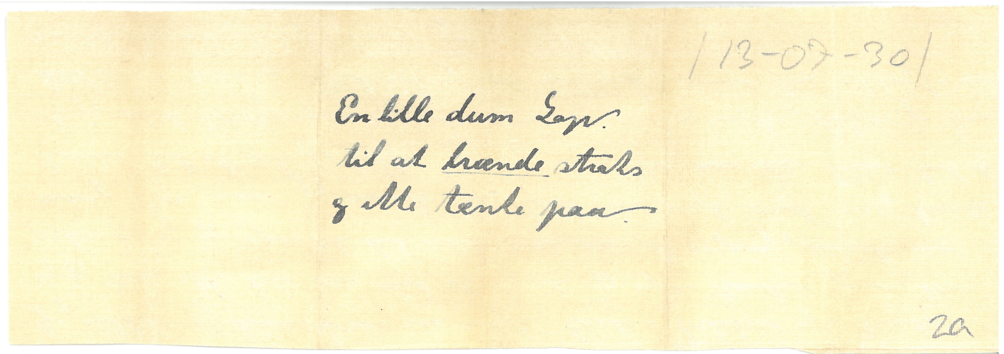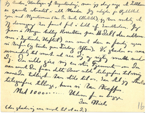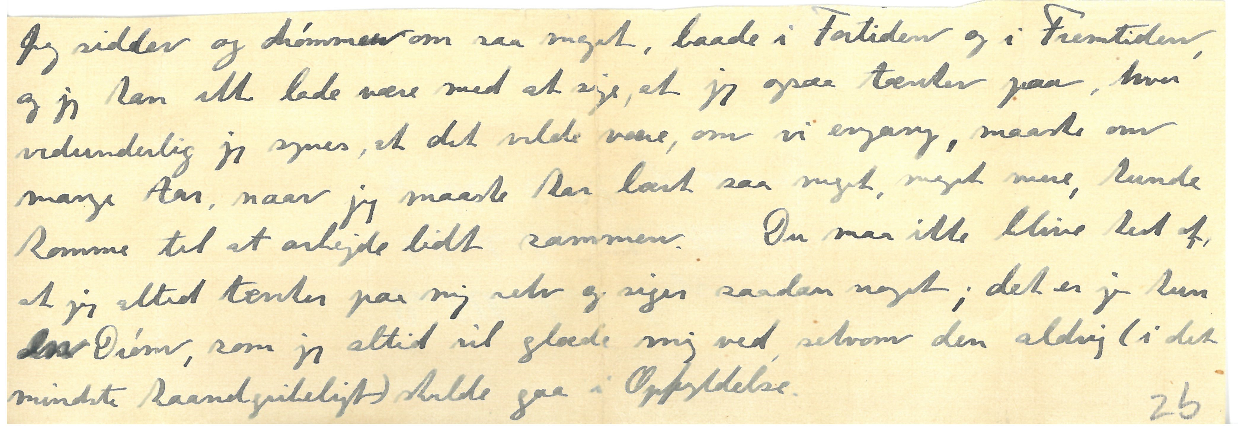 |Jeg sidder og drømmer om saa meget, baade i Fortiden og i Fremtiden, og jeg kan ikke lade være med at sige, at jeg ogsaa tænker paa, hvor vidunderlig jeg synes, at det vilde være, om vi engang, maaske om mange Aar, naar jeg maaske har lært saa meget, meget mere, kunde komme til at arbejde lidt sammen. Du maa ikke blive ked af, at jeg altid tænker paa mig selv og siger saadan noget; det er jo kun en Drøm, som jeg altid vil glæde mig ved, selvom den aldrig (i det mindste haandgribeligt) skulde gaa i Opfyldelse.