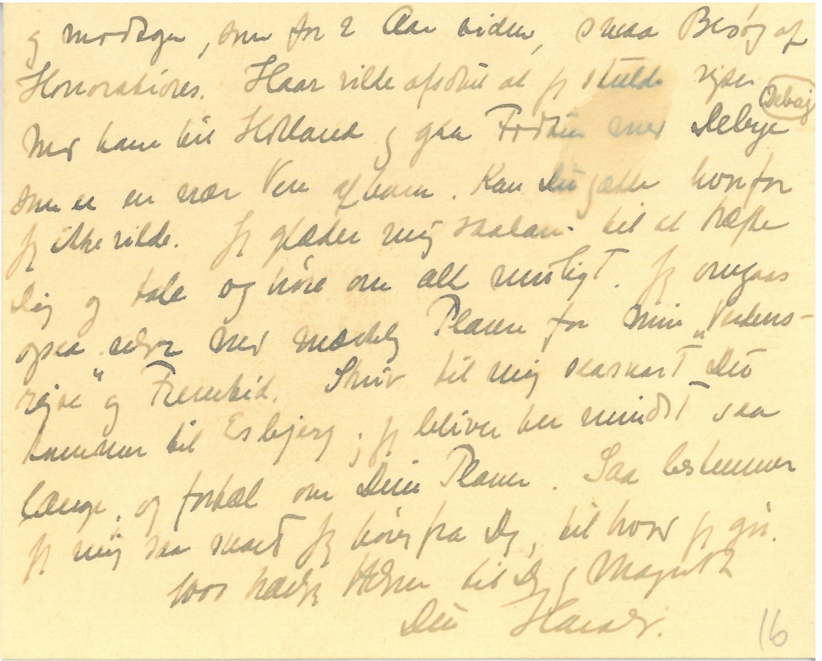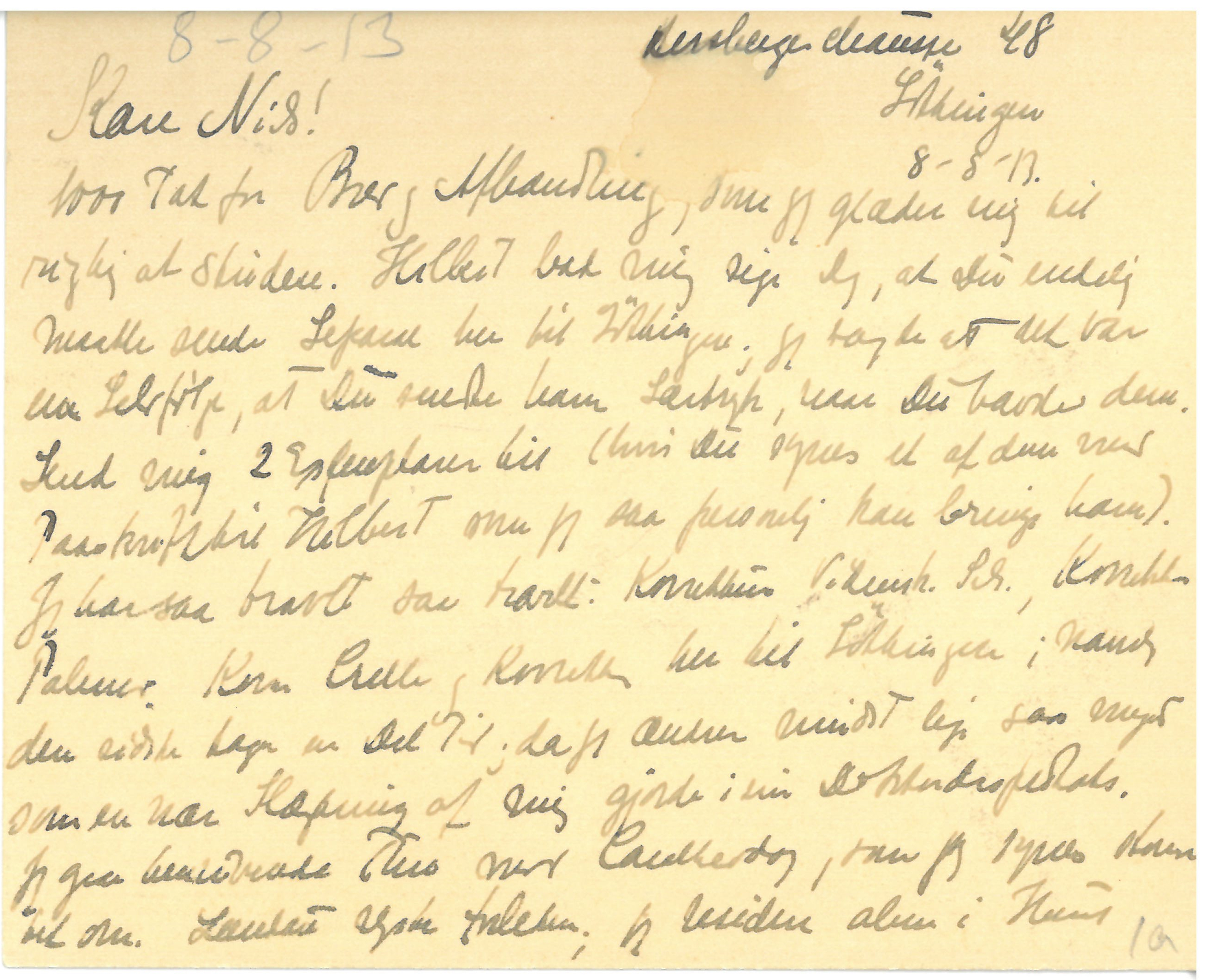 1000 Tak for Brev og Afhandling, som jeg glæder mig til rigtig at studere. Hilbert bad mig sige Dig, at Du endelig maatte sende S[...] her til Göttingen; jeg sagde at det var en Selvfølge, at Du sendte ham Særtryk, naar Du havde dem. Send mig 2 Exemplarer til (hvis Du synes et af dem med Paaskrift til Hilbert som jeg saa personlig kan bringe ham). Jeg har saa travlt saa travlt: Korrektur Vidensk. Sel., Korrektur Palmer, Korr. Crelle og Korrektur her til Göttingen; navnlig den sidste tager en Del Tid; da jeg ændrer mindst lige saa meget som en nær Slægtning af mig gjorde i sin Doktordisputats. Jeg gaar henrivende Ture med Caratheodory, som jeg synes storartet om. Landau rejste forleden; jeg residerer alene i Huset |og modtager, som for 2 Aar siden, smaa Besøg af Honoratiores. Haar vilde absolut at jeg skulde rejse med ham til Holland og gaa Fodtur med Debye som er en nær Ven af ham. Kan Du gætte hvorfor jeg ikke vilde. Jeg glæder mig saadan til at træffe Dig og tale og høre om alt muligt. Jeg omgaas ogsaa selv med modige Planer for min “Verdensrejse” og Fremtid. Skriv til mig saasnart Du kommer til Esbjerg; jeg bliver her mindst saa længe, og fortæl om Dine Planer. Saa bestemmer jeg mig saa snart jeg hører fra Dig, til hvad jeg gør.