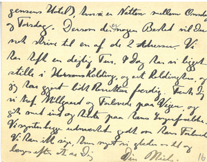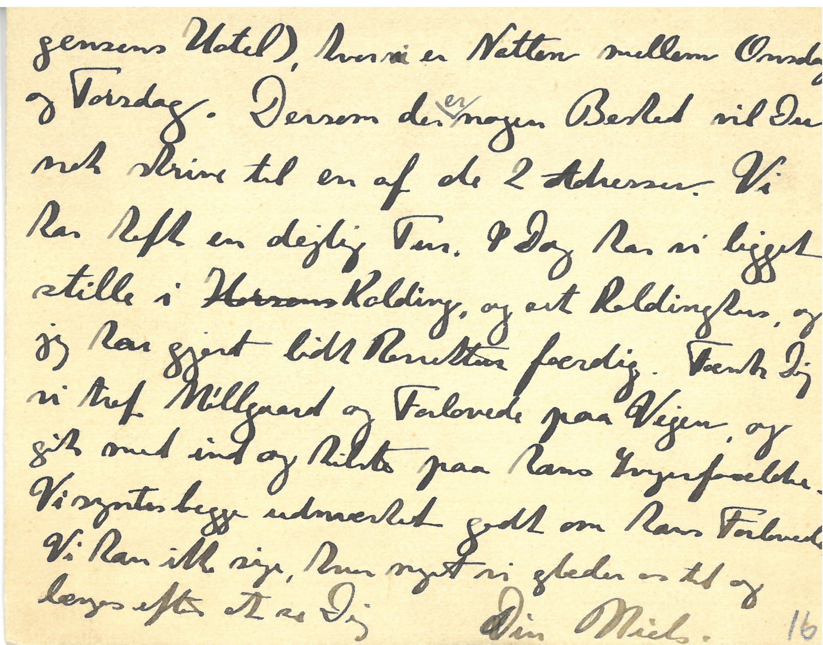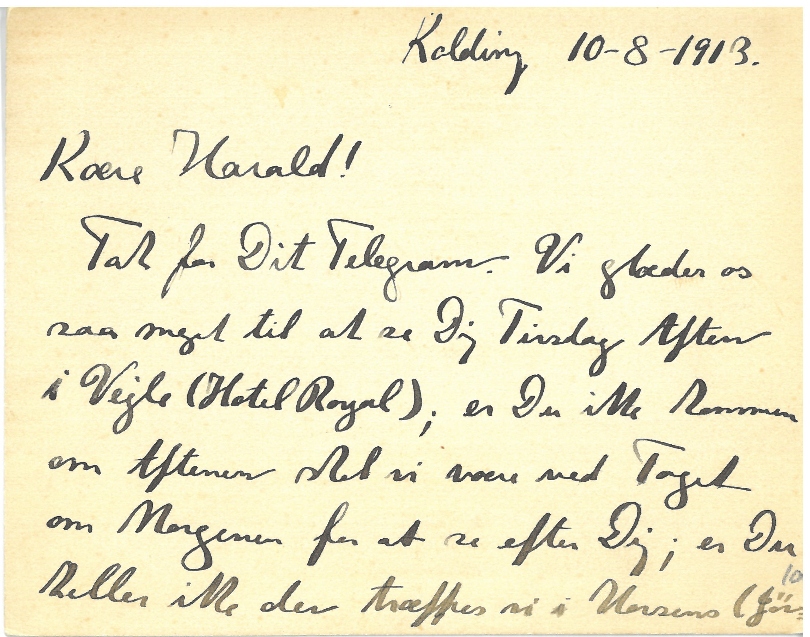 Tak for Dit Telegram. Vi glæder os saa meget til at se Dig Tirsdag Aften i Vejle (Hotel Royal); er Du ikke kommen om Aftenen skal vi være ved Toget om Morgenen for at se efter Dig; er Du heller ikke der træffes vi i Horsens (Jør |gensens Hotel), hvor vi er Natten mellem Onsdag og Torsdag. Dersom der er nogen Besked vil Du nok skrive til en af de 2 Adresser. Vi har haft en dejlig Tur. I Dag har vi ligget stille i Kolding, og set Koldinghus, og jeg har gjort lidt Korrektur færdig. Tænk Dig vi traf Møllgaard og Forlovede paa Vejen, og gik med ind og hilste paa hans Svigerforældre. Vi syntes begge udmærket godt om hans Forlovede. Vi kan ikke sige, hvor meget vi glæder os til og længes efter at se Dig.
