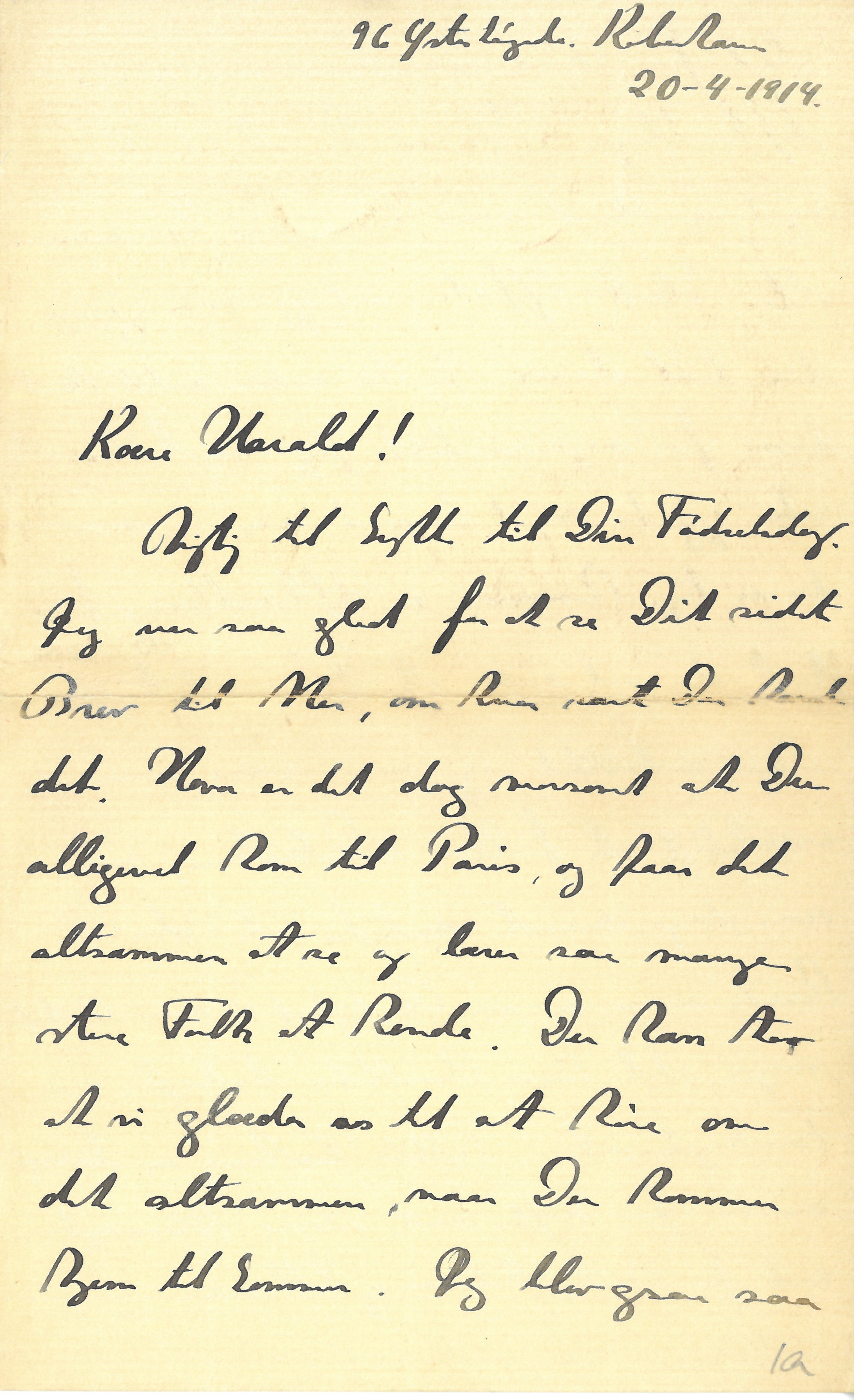 Rigtig til Lykke til Din Fødselsdag. Jeg var saa glad for at se Dit sidste Brev til Mor, om hvor rart Du havde det. Hvor er det dog morsomt at Du alligevel kom til Paris, og faar det altsammen at se og lærer saa mange store Folk at kende. Du kan tro at vi glæder os til at høre om det altsammen, naar Du kommer hjem til Sommer. Jeg blev ogsaa saa |glad for, hvad Du skrev om mine Afhandlinger. Dersom Du skulde høre noget om, hvad man mener om Zeemann eller Stark-Effecten, vil jeg saa gerne høre lidt derom. Jeg har endnu intet hørt derom fra nogensomhelst. Jeg har heller ikke selv gjort noget derved senere; men der er lige kommen en Afhandling fra Stark, der vel viser at Fænomenet er uhyre indviklet og maa være overmaade vanskeligt at forklare i Detaillerne, men som dog maaske antyder, at der kunde være en vis Rigtighed i min Betragtninger, idet hans Resultater bekræfter min Forudsigelse: at Feltets Virkning er langt mindre for Stoffer med større Atomvægt end for Brint, Helium og Lithium.