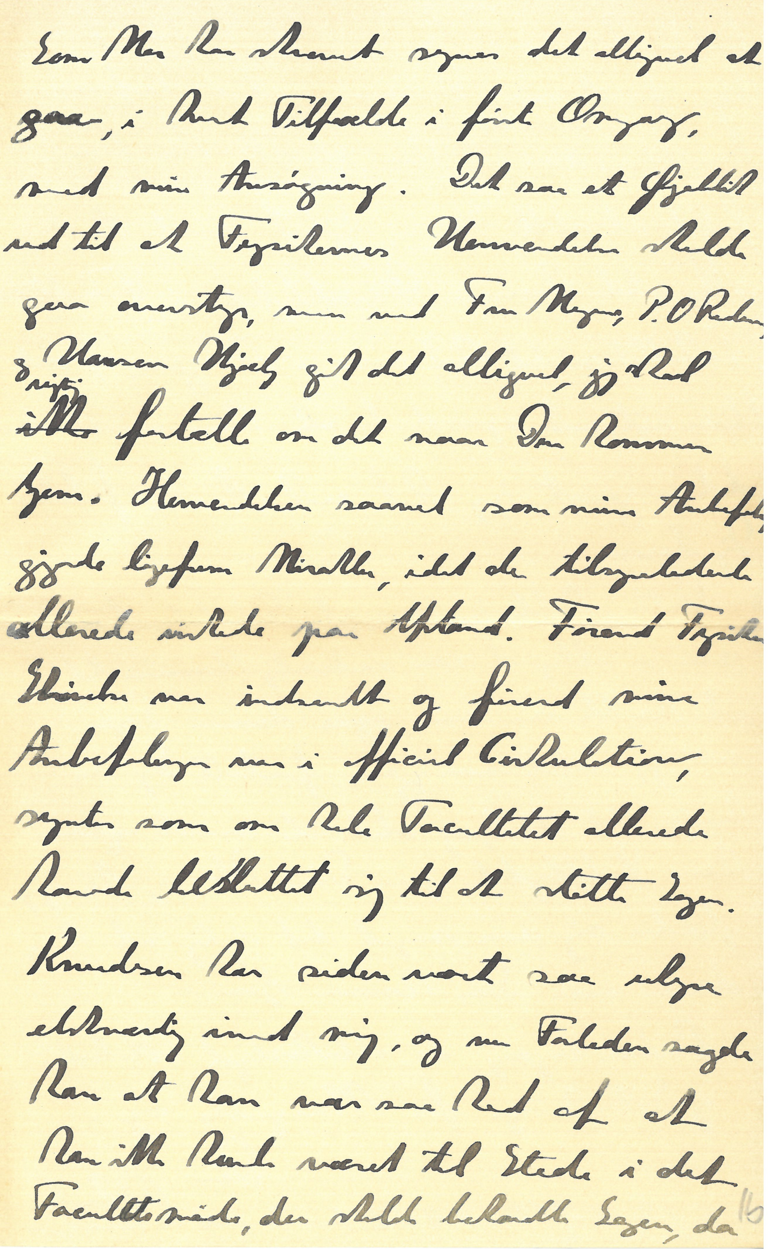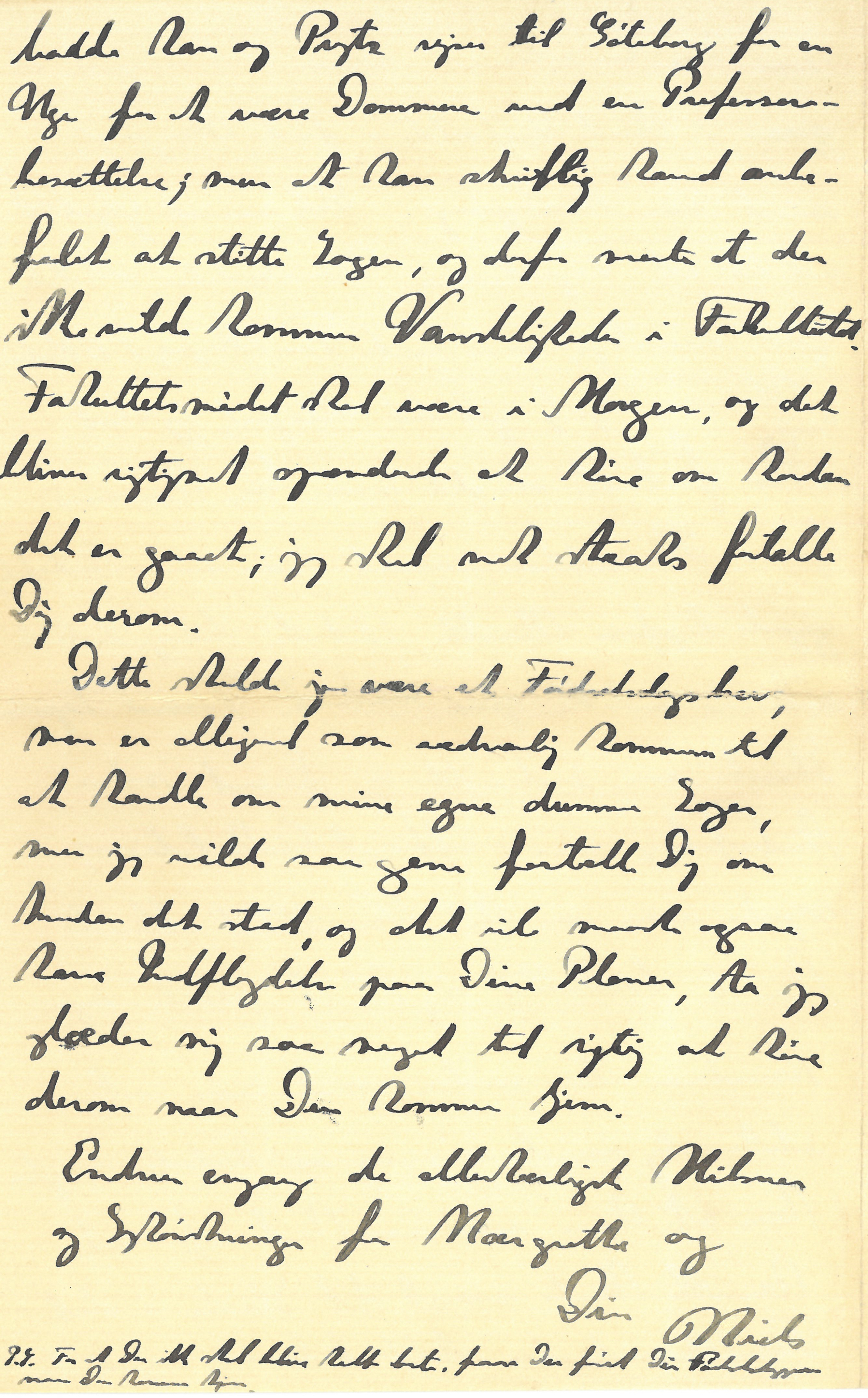 |Som Mor har skrevet synes det alligevel at gaa, i hvert Tilfælde i første Omgang, med min Ansøgning. Det saa et Øjeblik ud til at Fysikernes Henvendelser skulde gaa overstyr, men ved Fru Meyers, P.O. Pedersens, og Hansens Hjælp gik det alligevel, jeg skal rigtig fortælle om det naar Du kommer hjem. Henvendelsen saavel som mine Anbefalinger gjorde ligefrem Mirakler, idet de tilsyneladende allerede virkede paa Afstand. Førend Fysikernes Skrivelse var indsendt og førend mine Anbefalinger var i officiel Cirkulation, syntes som om hele Fakultetet allerede havde besluttet sig til at støtte Sagen. Knudsen har siden været saa uhyre elskværdig imod mig, og nu Forleden sagde han at han var saa ked af at han ikke havde været til Stede i det Fakultetsmøde, der skulde behandle Sagen, da |baade han og Prytz rejser til Göteborg for en Uge for at være Dommere ved en Professorbesættelse; men at han skriftlig havde anbefalet at støtte Sagen, og derfor mente at der ikke vilde komme Vanskeligheder i Fakultetet. Fakultetsmødet skal være i Morgen, og det bliver rigtignok spændende at høre om hvordan det er gaaet; jeg skal nok straks fortælle Dig derom.