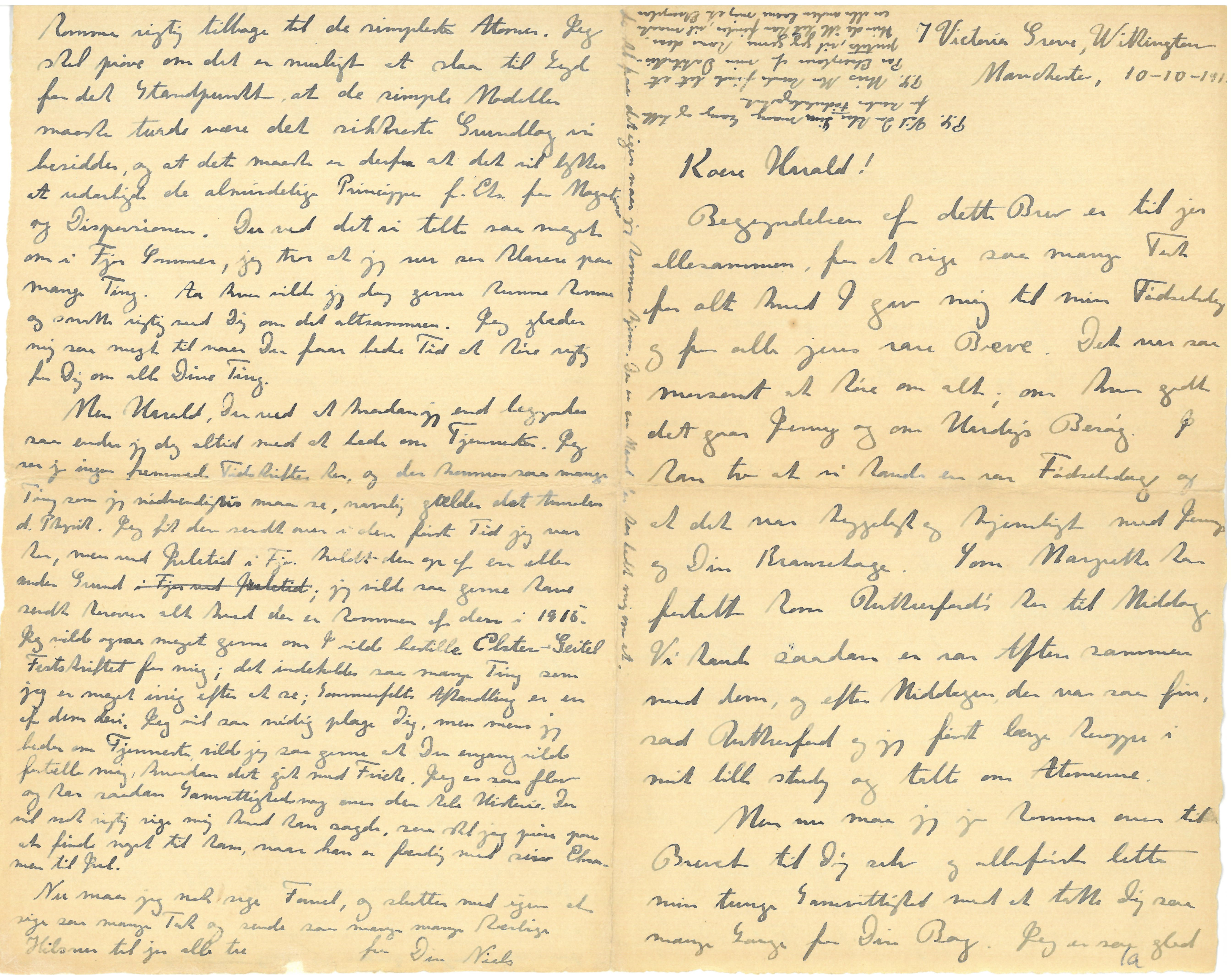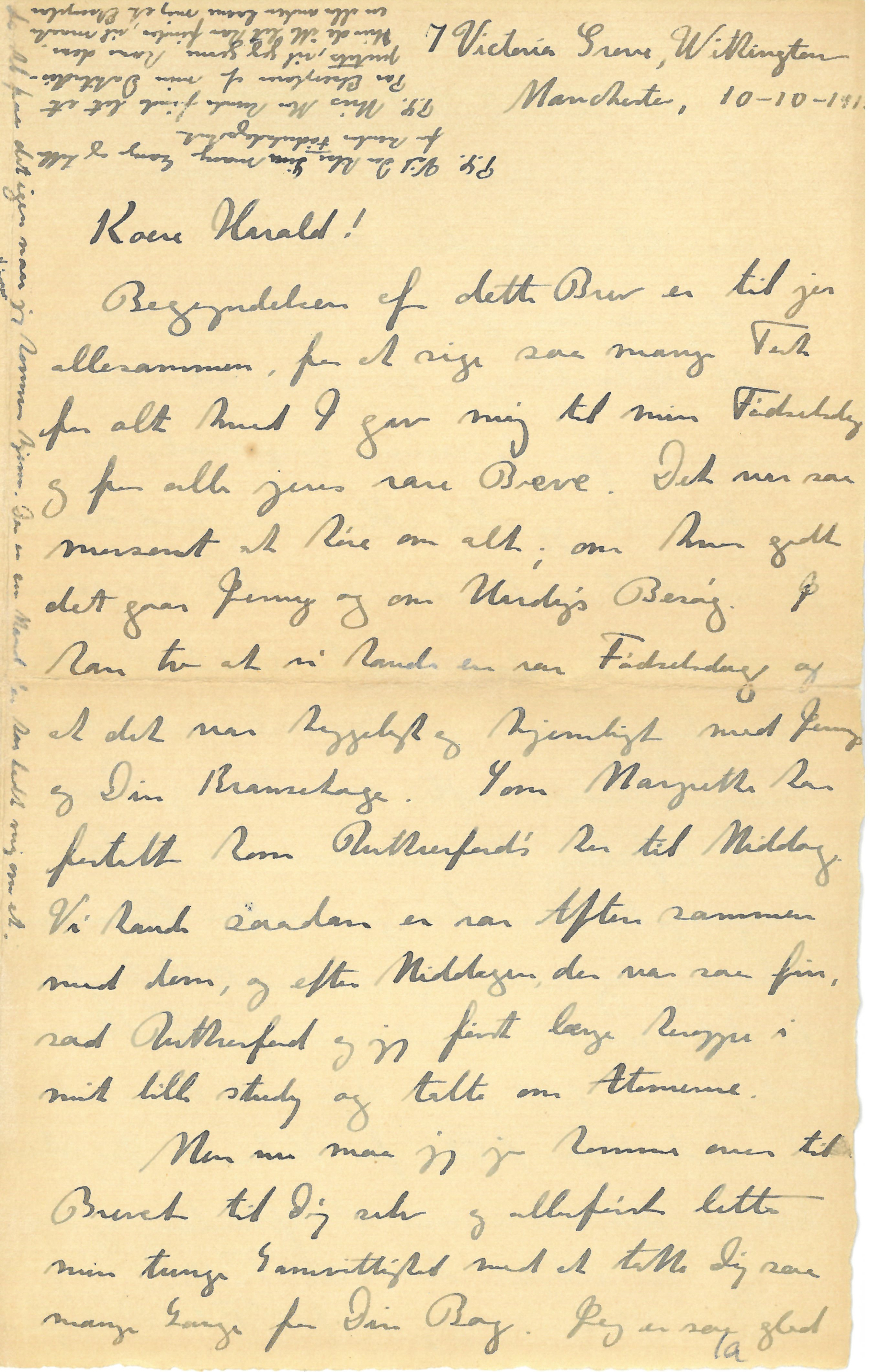 Begyndelsen af dette Brev er til jer allesammen, for at sige saa mange Tak for alt hvad I gav mig til min Fødselsdag og for alle jeres rare Breve. Det var saa morsomt at høre om alt; om hvor godt det gaar Jenny og om Hardy’s Besøg. I kan tro at vi havde en rar Fødselsdag og at det var hyggeligt og hjemligt med Jennys og Din Kransekage. Som Margrethe har fortalt kom Rutherford’s her til Middag. Vi havde saadan en rar Aften sammen med dem, og efter Middagen, der var saa fin, sad Rutherford og jeg først længe heroppe i mit lille study og talte om Atomerne.