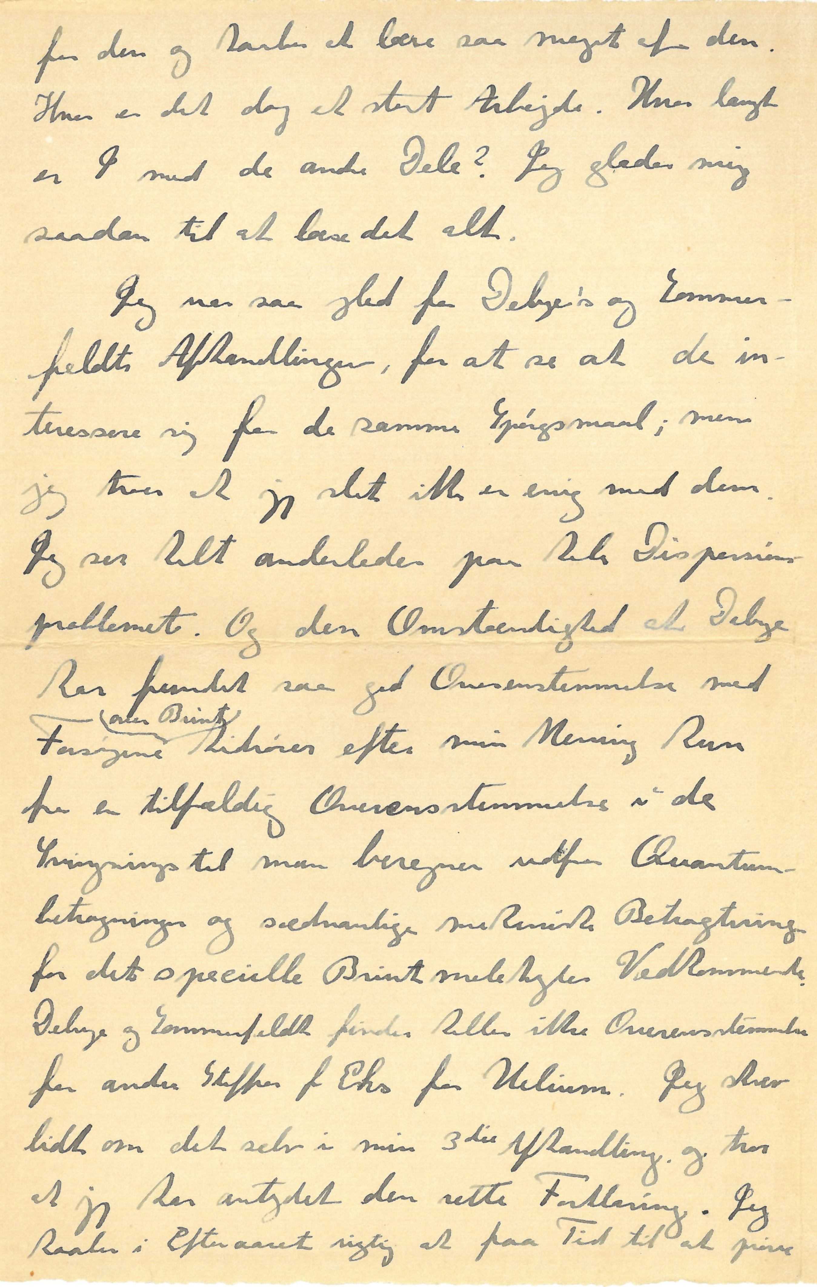 Jeg var saa glad for Debye’s og Sommerfeldts Afhandlinger, for at se at de interessere sig for de samme Spørgsmaal; men jeg tror at jeg slet ikke er enig med dem. Jeg ser helt anderledes paa hele Dispersionsproblemet. Og den Omstændighed at Debye har fundet saa god Overensstemmelse med Forsøgene om Brint hidrører efter min Mening kun fra en tilfældig Overensstemmelse i de Svingningstal man beregner udfra Quantumbetragtninger og sædvanlige mekaniske Betragtninger for det specielle Brintmolekyles Vedkommende. Debye og Sommerfeldt finder heller ikke Overensstemmelse for andre Stoffer f. Eks for Helium. Jeg skrev lidt om det selv i min 3die Afhandling, og tror at jeg har antydet den rette Forklaring. Jeg haaber i Efteraaret rigtig at faa Tid til at prøve |at trænge ind deri. Jeg skal meget snart skrive til Sommerfeldt og forklare ham mit Synspunkt. Jeg er saa taknemlig for al hans Venlighed og Interesse.