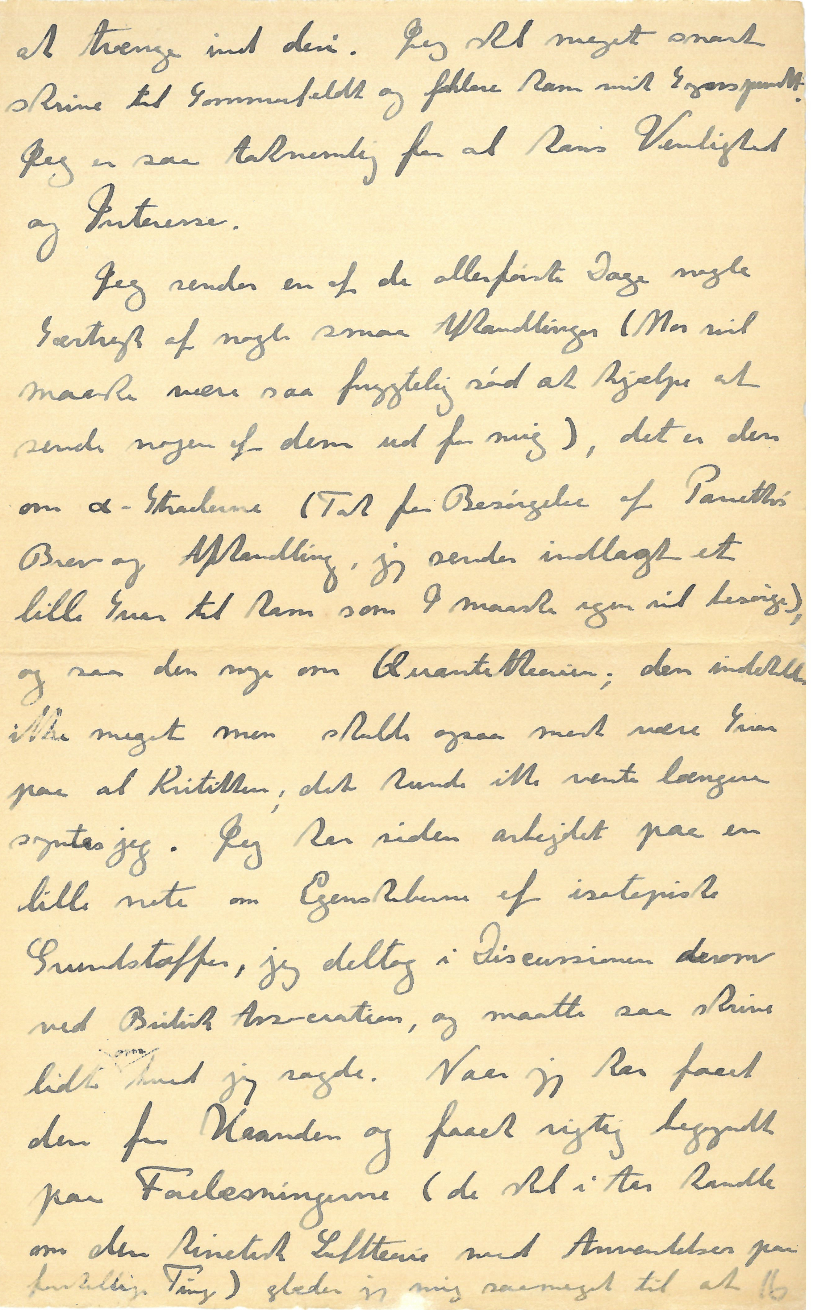 Jeg sender en af de allerførste Dage nogle Særtryk af nogle smaa Afhandlinger (Mor vil maaske være saa frygtelig sød at hjælpe at sende nogen af dem ud for mig), det er den om \(\alpha\)-Straalerne (Tak for Besørgelse af Paneth’s Brev og Afhandling, jeg sender indlagt et lille Svar til ham som I maaske igen vil besørge), og saa den nye om Quantetheorien; den indeholder ikke meget men skulde ogsaa mest være Svar paa al Kritikken; det kunde ikke vente længere syntes jeg. Jeg har siden arbejdet paa en lille note om Egenskaberne af isotopiske Grundstoffer, jeg deltog i Discussionen derom ved Britisk Association, og maatte saa skrive lidt om hvad jeg sagde. Naar jeg har faaet den fra Haanden og faaet rigtig begyndt paa Forelæsningerne (de skal i Aar handle om den kinetiske Luftteori med Anvendelser paa forskellige Ting) glæder jeg mig saa meget til at k |omme rigtig tilbage til de simpleste Atomer. Jeg skal prøve om det er muligt at slaa til Lyd for det Standpunkt, at de simple Modeller maaske turde være det sikreste Grundlag vi besidder, og at det maaske er derfra at det vil lykkes at udarbejde de almindelige Principper f.Eks. for Magnetismen og Dispersionen. Du ved det vi talte saa meget om i Fjor Sommer, jeg tror at jeg nu ser klarere paa mange Ting. Aa hvor vilde jeg dog gerne kunne komme og snakke rigtig med Dig om det altsammen. Jeg glæder mig saa meget til naar Du faar bedre Tid at høre rigtig fra Dig om alle Dine Ting.