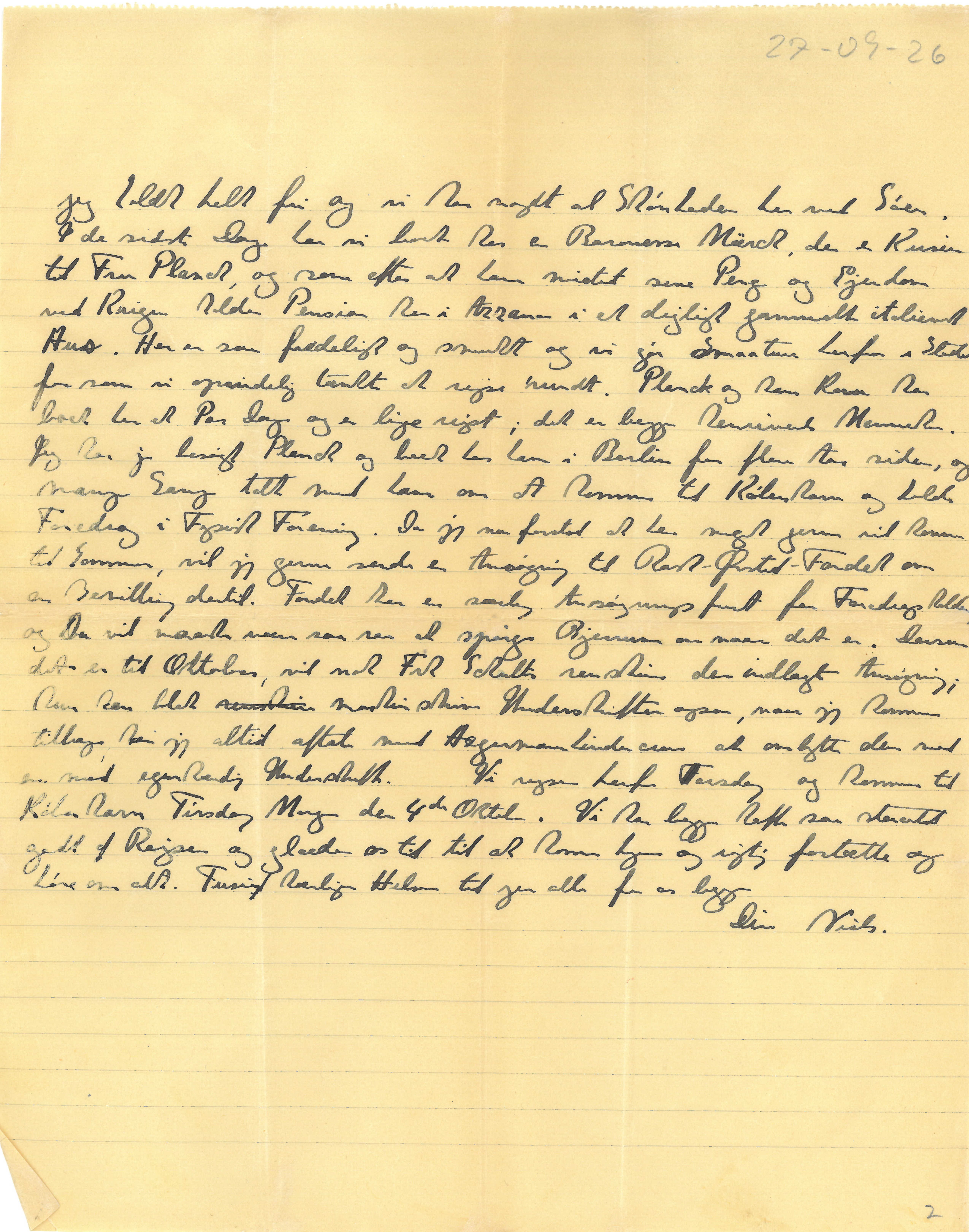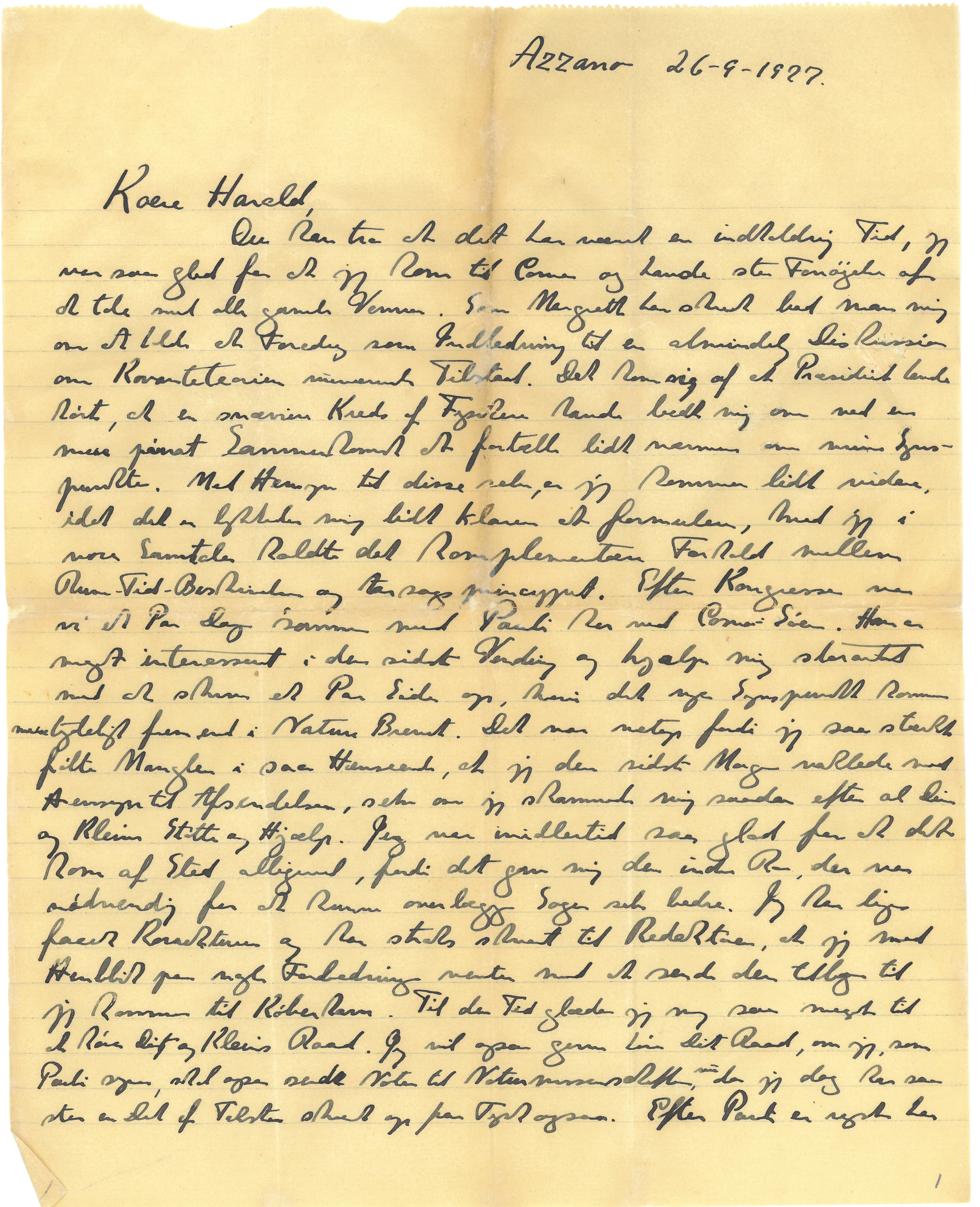 Du kan tro at det har været en indholdsrig Tid, jeg var saa glad for at jeg kom til Como og havde stor Fornøjelsen af at tale med alle gamle Venner. Som Margrethe har skrevet bad man mig om at holde et Foredrag som Indledning til en almindelig Diskussion om Kvanteteoriens nuværende Tilstand. Det kom sig af at Præsidiet havde hørt, at en snævrere Kreds af Fysikere havde bedt mig om ved en mere privat Sammenkomst at fortælle lidt nærmere om mine Synspunkter. Med Hensyn til disse selv, er jeg kommen lidt videre, idet det er lykkedes mig lidt klarere at formulere, hvad jeg i vore Samtaler kaldte det komplementære Forhold mellem Rum-Tid-Beskrivelsen og Aarsagsprincippet. Efter Kongressen var vi et Par Dage sammen med Pauli her ved Como-Søen. Han er meget interesseret i den sidste Vending og hjalp mig storartet med at skrive et Par Sider op, hvori det nye Synspunkt kommer mere tydeligt frem end i Nature Brevet. Det var netop fordi jeg saa stærkt følte Manglen i saa Henseende, at jeg den sidste Morgen vaklede med Hensyn til Afsendelsen, selv om jeg skammede mig saadan efter al Din og Kleins Støtte og Hjælp. Jeg var imidlertid saa glad for at det kom af Sted alligevel, fordi det gav mig den indre Ro, der var nødvendig for at kunne overlægge Sagen selv bedre. Jeg har lige faaet Korrekturen og har straks skrevet til Redaktøren, at jeg med Henblik paa nogle Forbedringer venter med at sende den tilbage til jeg kommer til København. Til den Tid glæder jeg mig saa meget til at høre Dit og Kleins Raad. Jeg vil ogsaa gerne høre Dit Raad, om jeg, som Pauli synes, skal ogsaa sende Noten til Naturwissenschaften, nu da jeg dog har saa stor en Del af Teksten skrevet op paa Tysk ogsaa. Efter Pauli er rejst har |jeg holdt helt fri og vi har nydt al Skønheden her ved Søen. I de sidste Dage har vi boet hos en Baronesse Märck, der er Kusine til Fru Planck, og som efter at have mistet sine Penge og Ejendom ved Krigen holder Pension her i Azzano i et dejligt gammelt italiensk Hus. Her er saa fredeligt og smukt og vi gaar Smaature herfra i Stedet for som vi oprindelig tænkte at rejse rundt. Planck og hans Kone har boet her et Par Dage og er lige rejst; det er begge henrivende Mennesker. Jeg har jo besøgt Planck og boet hos ham i Berlin for flere Aar siden, og mange Gange talt med ham om at komme til København og holde Foredrag i Fysisk Forening. Da jeg nu forstod at han meget gerne vil komme til Sommer, vil jeg gerne sende en Ansøgning til Rask-Ørsted-Fondet om en Bevilling dertil. Fondet har en særlig Ansøgningsfrist for Foredragsholdere og Du vil maaske være saa rar at spørge Bjerrum om naar det er. Dersom det er til Oktober, vil nok Frk Schultz renskrive den indlagte Ansøgning; hun kan blot maskinskrive Underskriften ogsaa, naar jeg kommer tilbage, kan jeg altid aftale med Hegermann Lindencrone at ombytte den med en med egenhændig Underskrift. Vi rejser herfra Torsdag og kommer til København Tirsdag Morgen den 4de Oktober. Vi har begge haft saa storartet godt af Rejsen og glæder os til at komme hjem og rigtig fortælle og høre om alt.