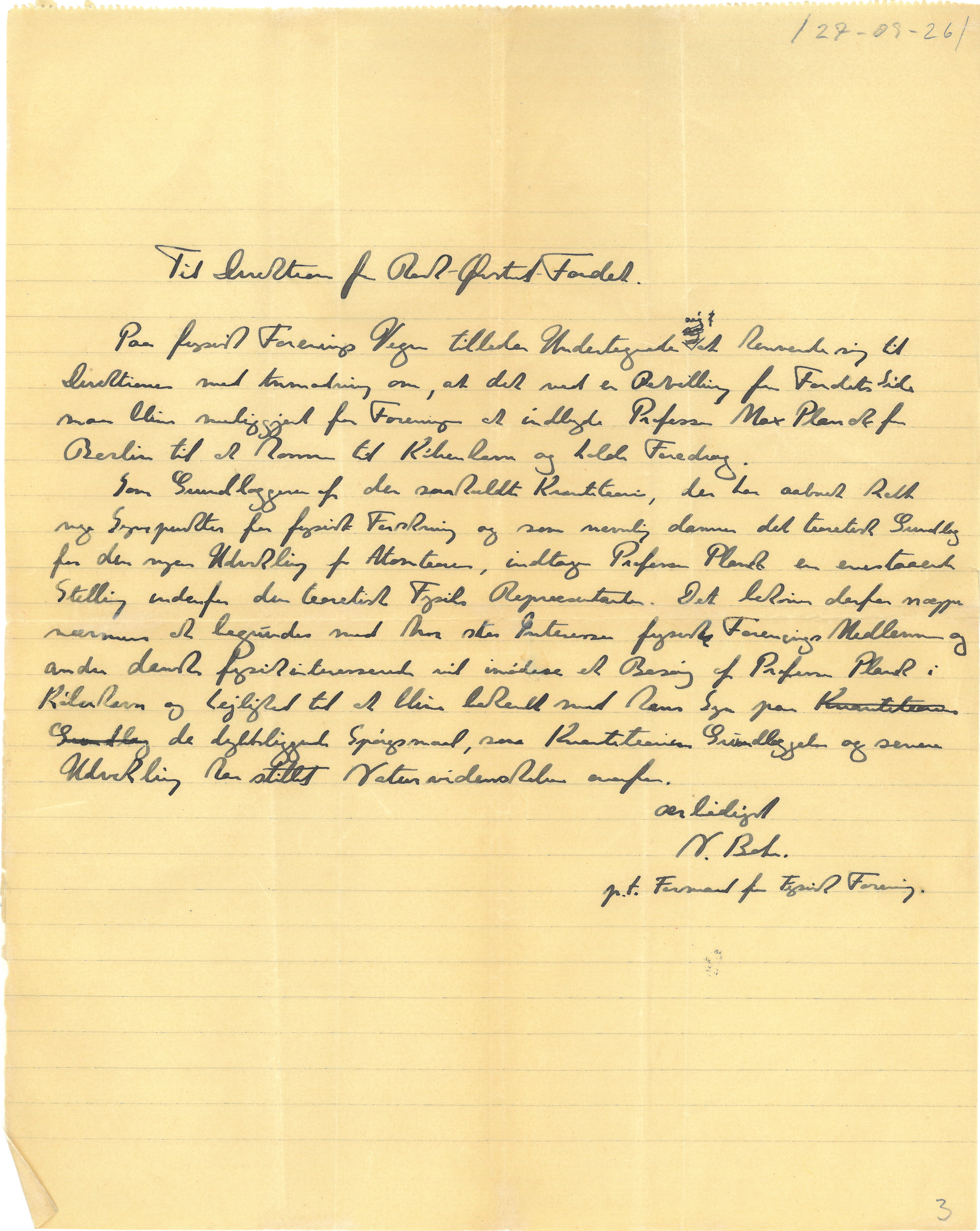 Som Grundlæggeren af den saakaldte Kvanteteori, der har aabnet helt nye Synspunkter for fysisk Forskning og som navnlig danner det teoretiske Grundlag for den nyere Udvikling for Atomteorien, indtager Professor Planck en enestaaende Stilling indenfor den teoretiske Fysiks Repræsentanter. Det behøver derfor næppe nærmere at begrundes med hvor stor Interesse fysisk Forenings Medlemmer og andre danske fysikinteresserede vil imødese et Besøg af Professor Planck i København og Lejlighed til at blive bekendt med hans Syn paa de dybtliggende Spørgsmaal, som Kvanteteoriens Grundlæggelse og senere Udvikling har stillet Naturvidenskaben overfor.
