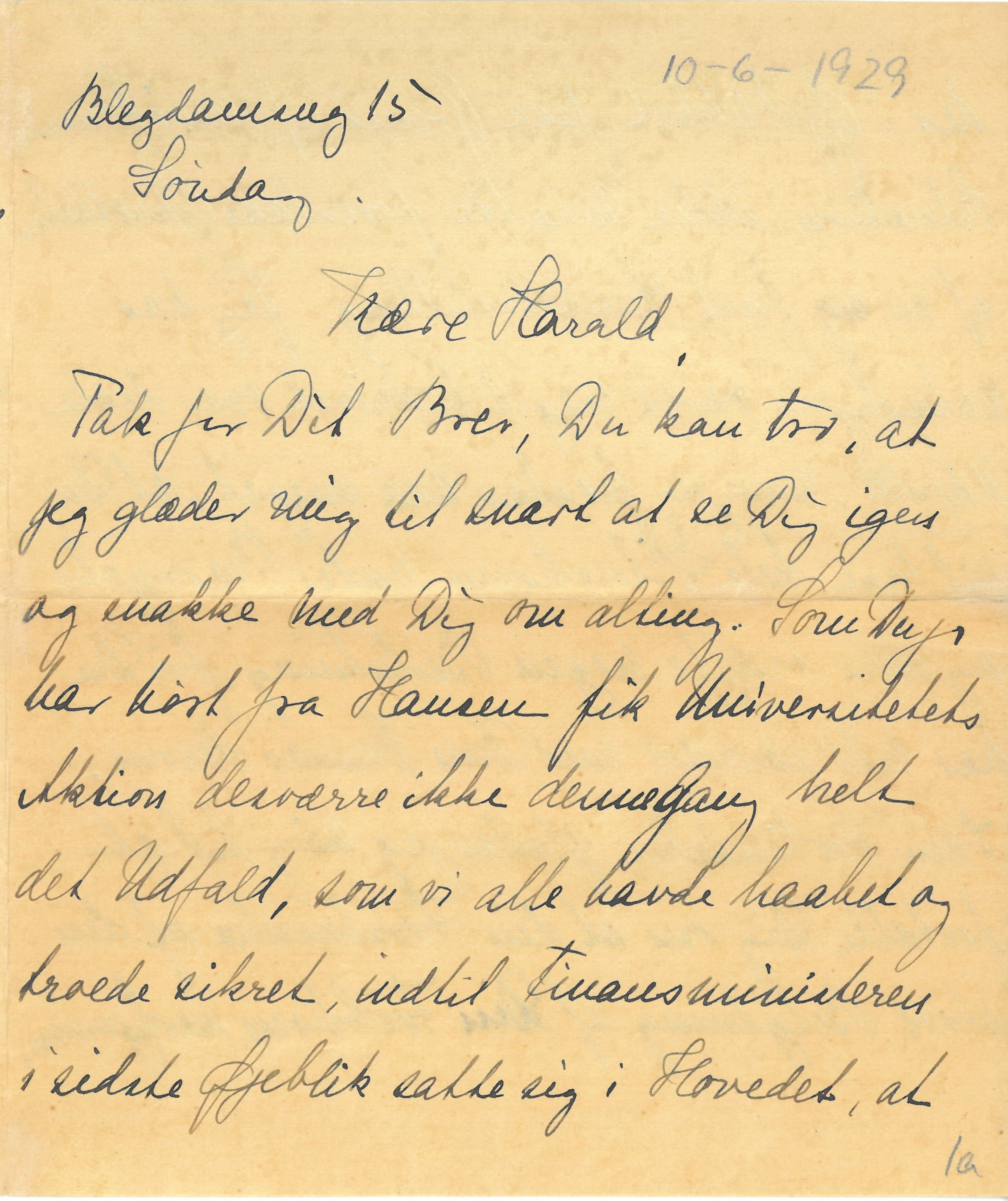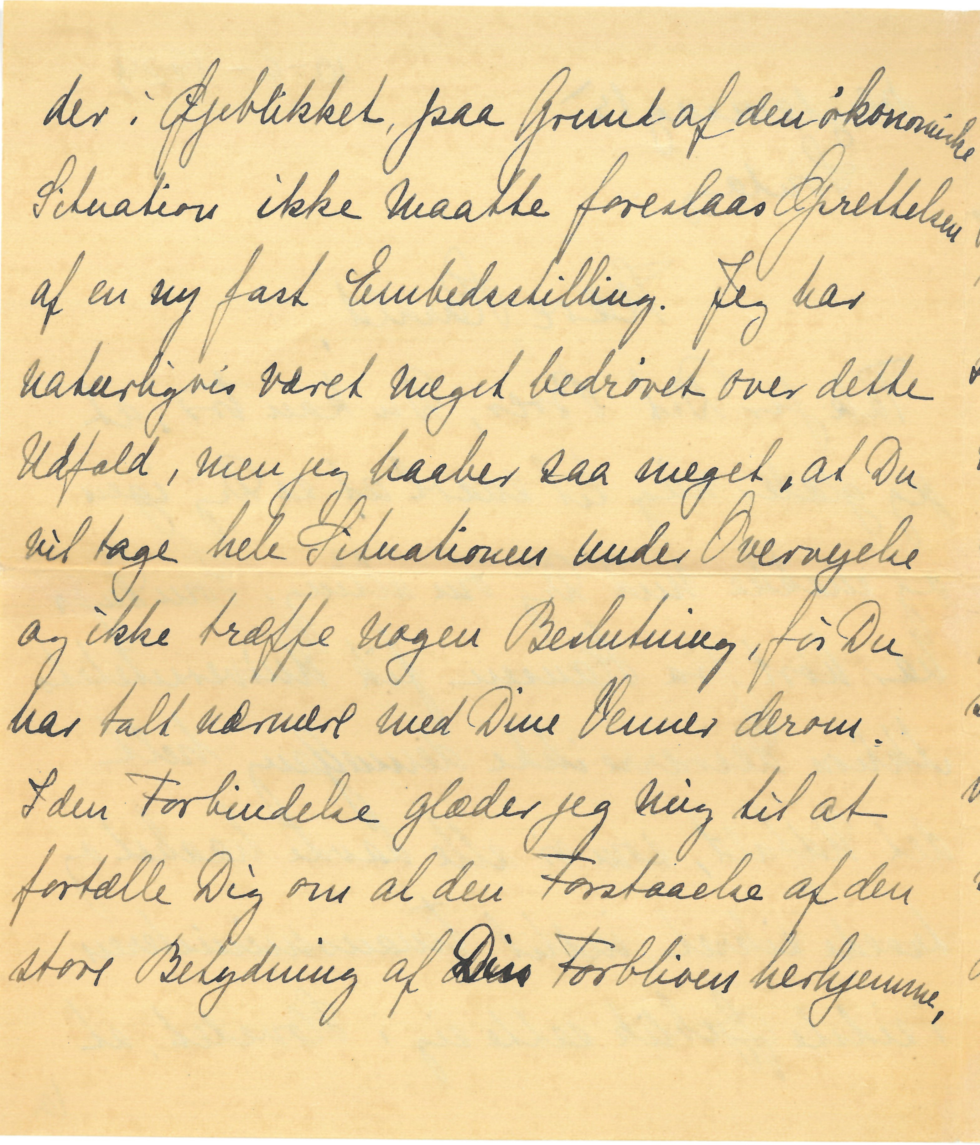 Tak for Dit Brev, Du kan tro, at jeg glæder mig til snart at se Dig igen og snakke med Dig om alting. Som Du jo har hørt fra Hansen fik Universitetets Aktion desværre ikke denne Gang helt det Udfald, som vi alle havde haabet og troet sikret, indtil Finansministeren i sidste Øjeblik satte sig i Hovedet, at |der i Øjeblikket, paa Grund af den økonomiske Situation ikke maatte foreslaas Oprettelsen af en ny fast Embedsstilling. Jeg har naturligvis været meget bedrøvet over dette Udfald, men jeg haaber saa meget, at Du vil tage hele Situationen under Overvejelse og ikke træffe nogen Beslutning, før Du har talt nærmere med Dine Venner derom. I den Forbindelse glæder jeg mig til at fortælle Dig om al den Forstaaelse af den store Betydning af Din Forbliven herhjemme, |som jeg fik saa mange Vidnesbyrd om i Jubilæumsdagene, hvor iøvrigt Hjelmslev repræsenterede Universitetet paa en Maade, som vi alle var stolte af og som i store Kredse vakte Beundring og Sympati for ham og for Universitetet.