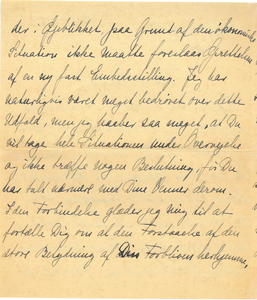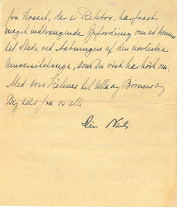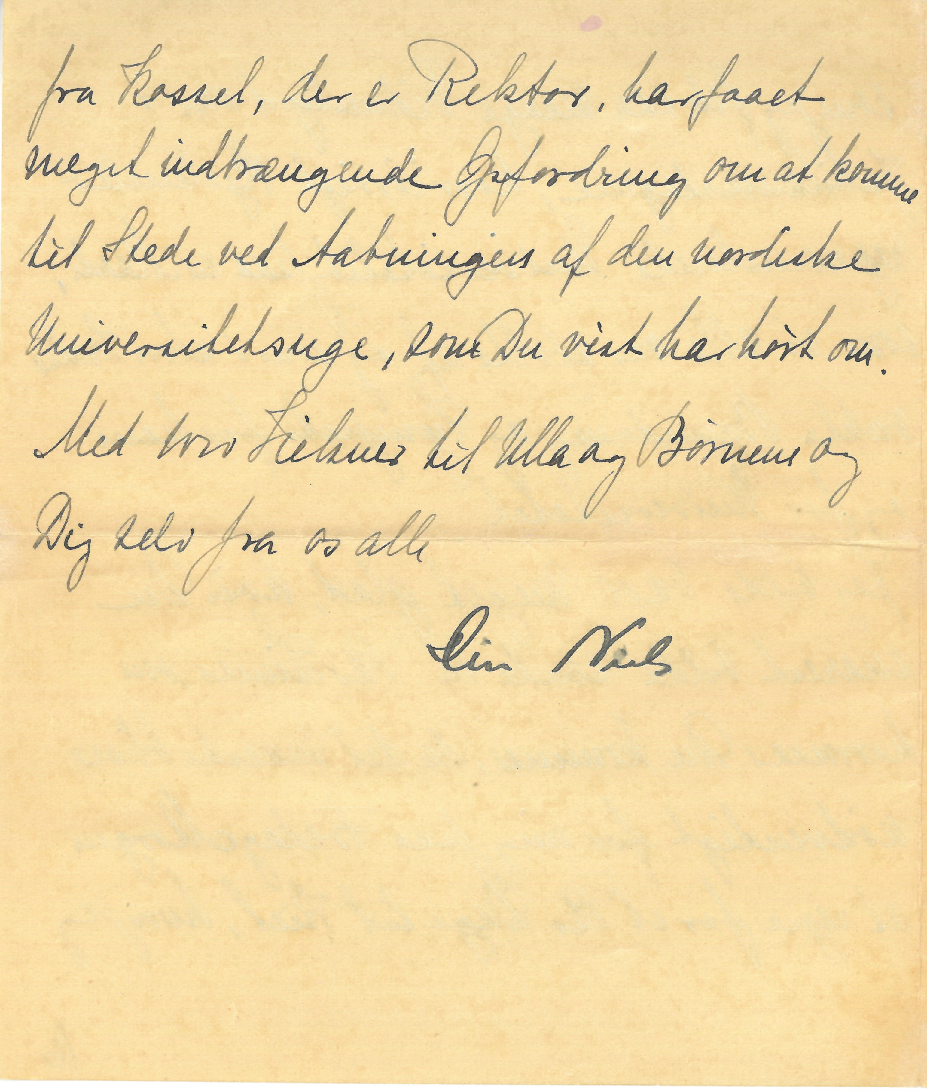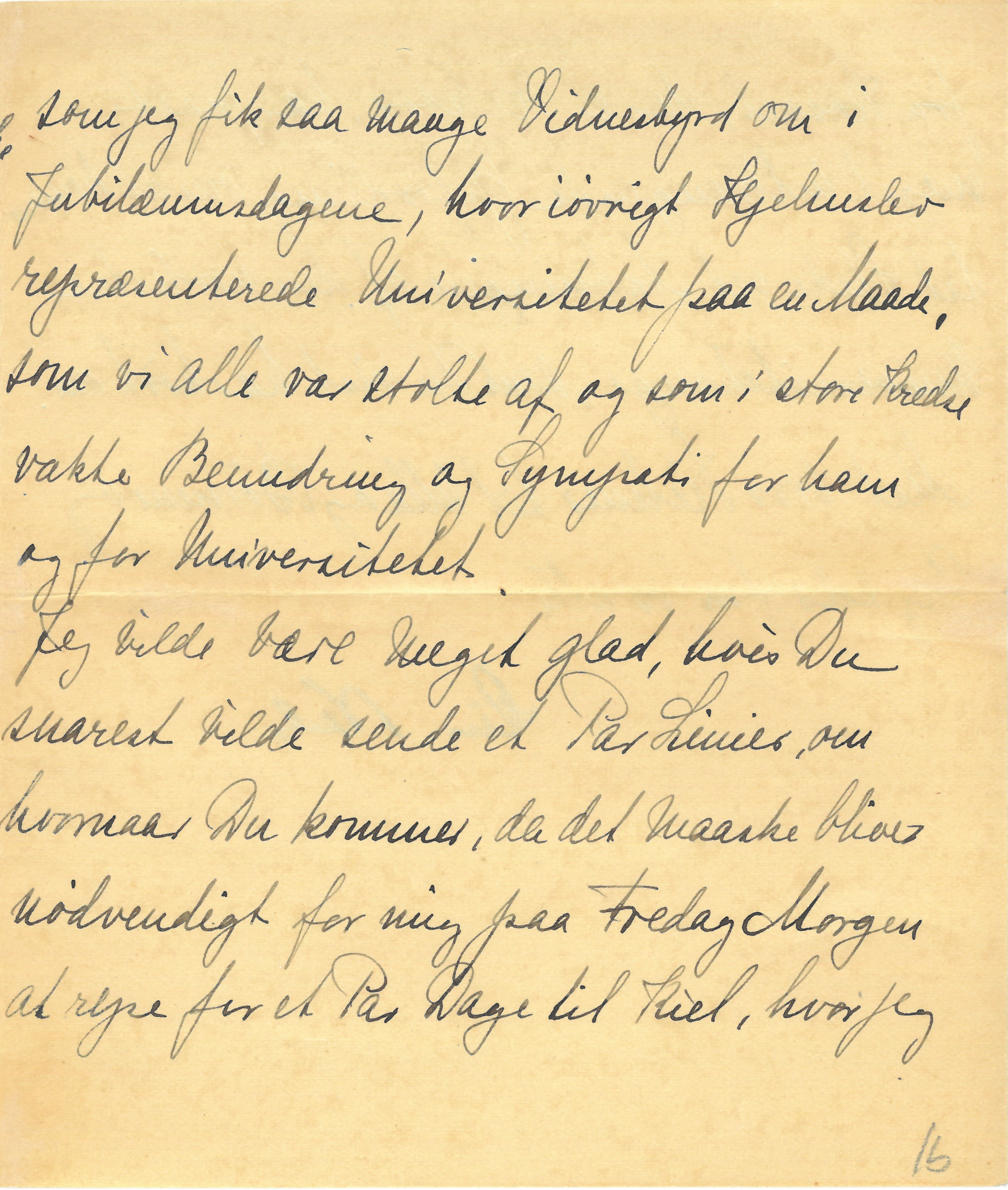 Jeg vilde være meget glad, hvis Du snarest vilde sende et Par Linier, om hvornaar Du kommer, da det maaske bliver nødvendigt for mig paa Fredag Morgen at rejse for et Par Dage til Kiel, hvor jeg |fra Kossel, der er Rektor, har faaet meget indtrængende Opfordring om at komme til Stede ved Aabningen af den nordiske Universitetsuge, som Du vist har hørt om.