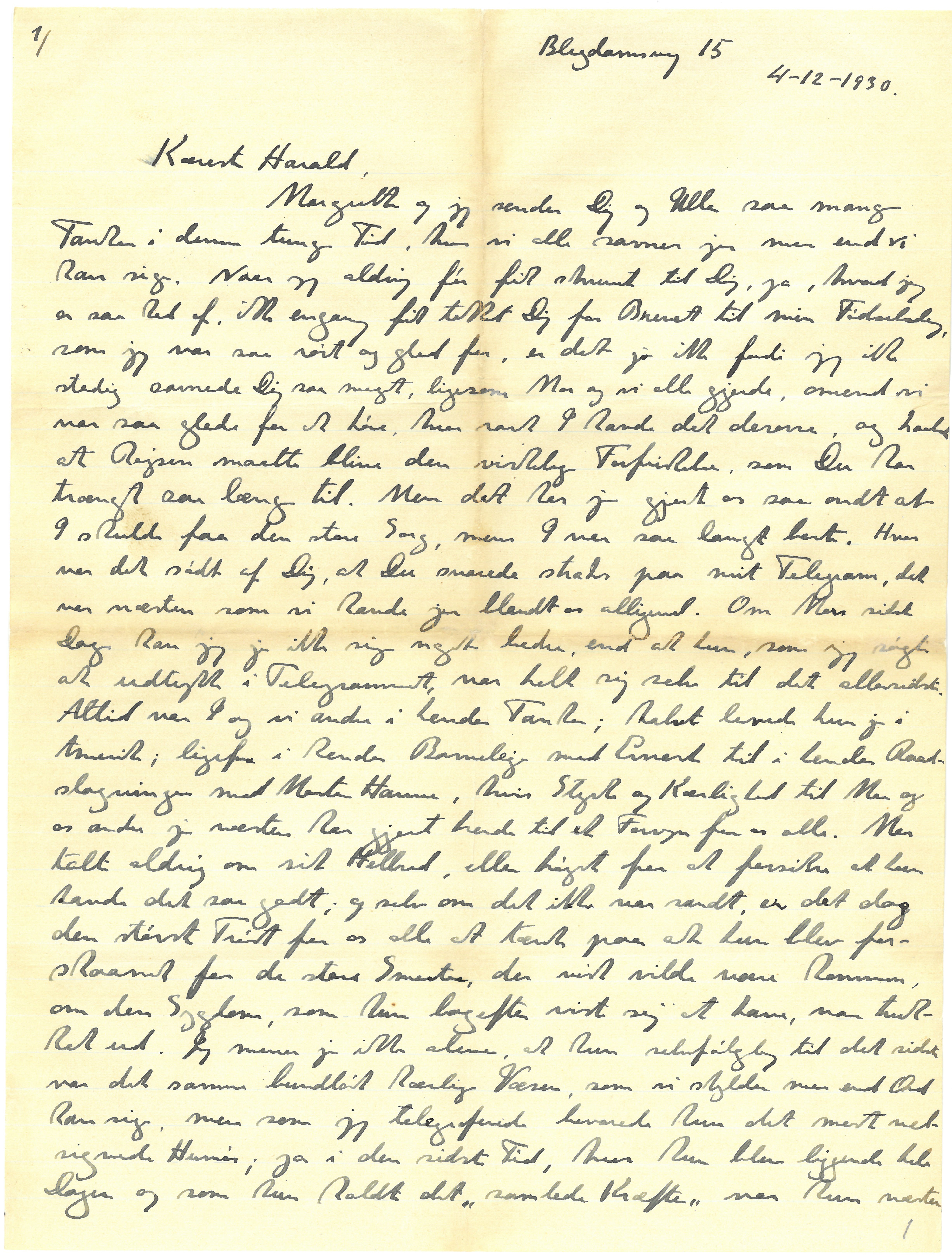 Kæreste Harald, dette Brev udtrykker jo kun saa daarligt, hvad der fylder mig, men det behøver jeg jo heller ikke til Dig. Jeg har ventet saa længe med at skrive, fordi der har været meget at ordne og tænke paa og saa har jeg alligevel til Slut maattet skynde mig med Brevet, fordi Henriques lige har været her og bedt mig om hurtigst muligt at sende Dig den indlagte Formular til Underskrift, som Bardram, Mors rare gamle Ven, og som sammen med Henriques er Exekutor i Mors Bo, har udformet.