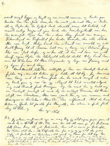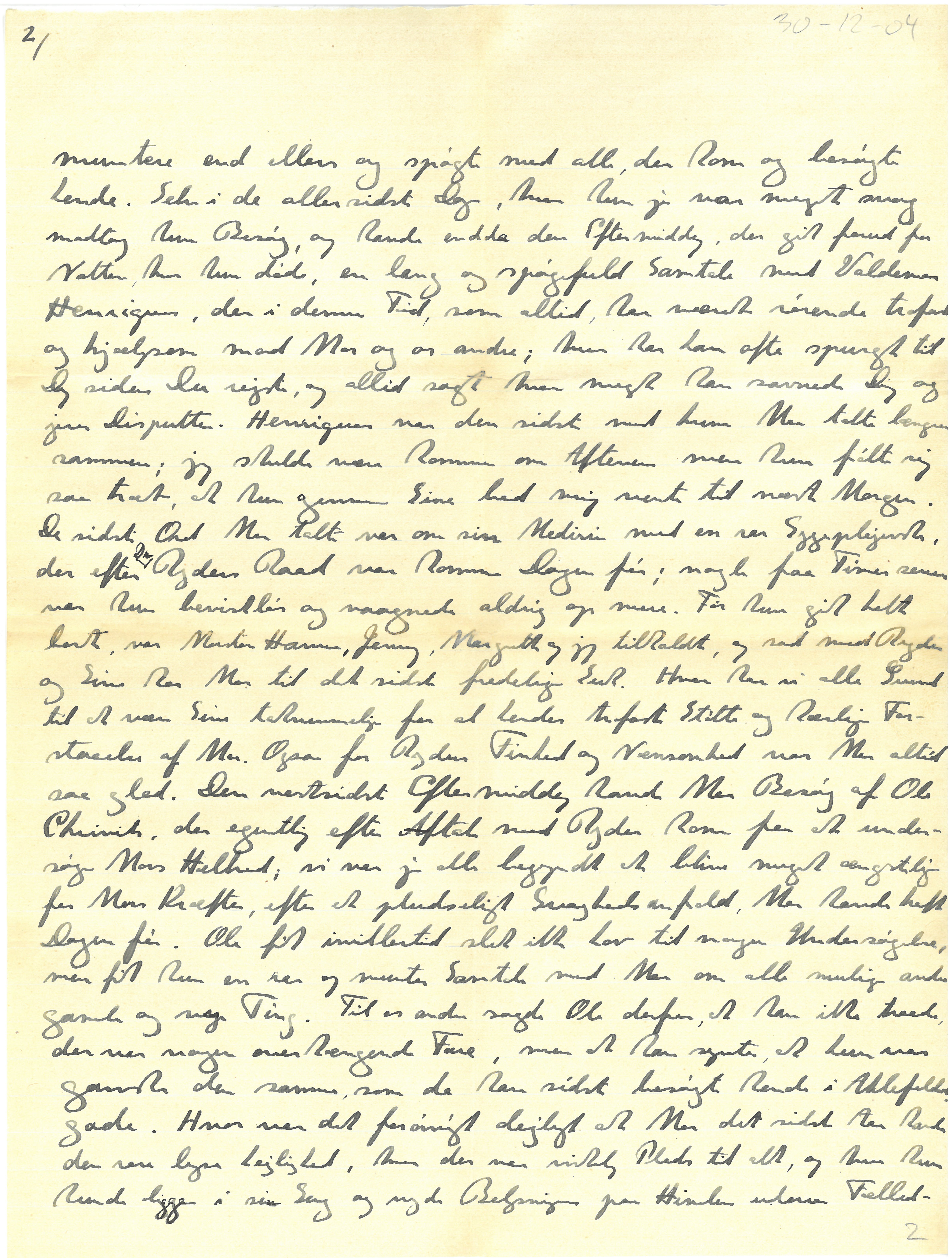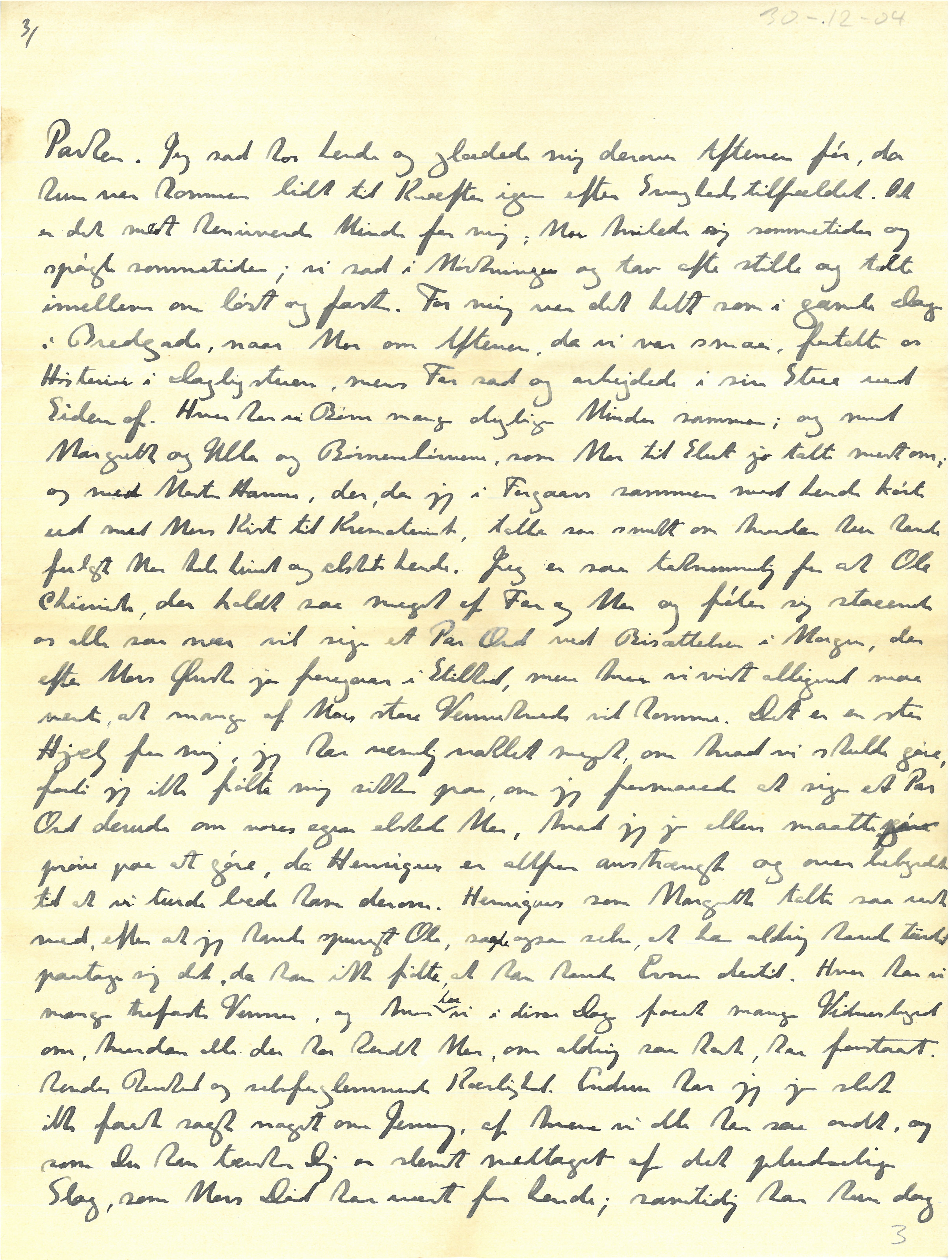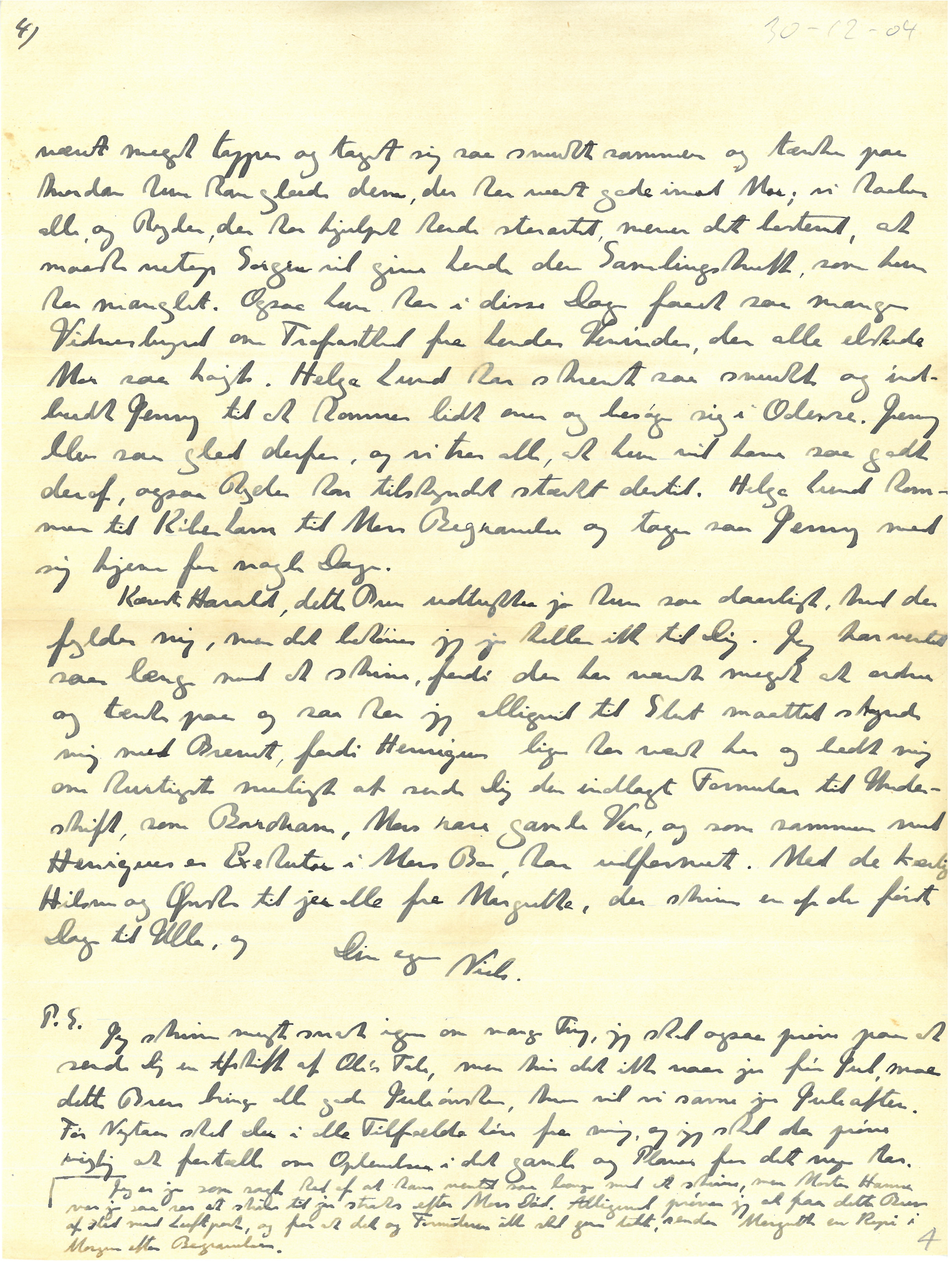 P.S. Jeg skriver meget snart igen om mange Ting, jeg skal ogsaa prøve paa at sende Dig en Afskrift af Ole’s Tale, men hvis det ikke naar jer før Jul, maa dette Brev bringe alle gode Juleønsker, hvor vil vi savne jer Juleaften. Før Nytaar skal Du i alle Tilfælde høre fra mig, og jeg skal da prøve rigtig at fortælle om Oplevelser i det gamle og Planer for det nye Aar.