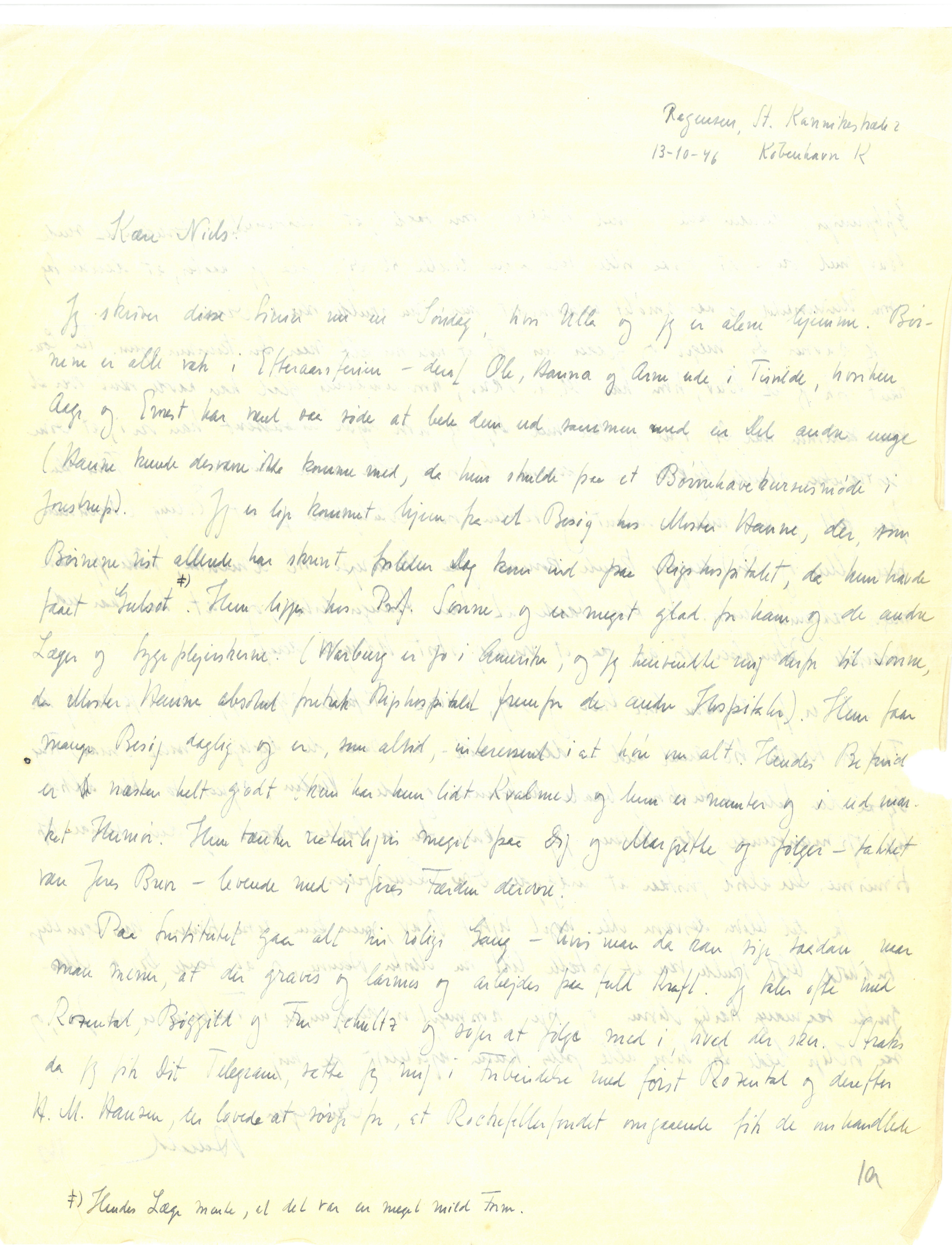 Jeg skriver disse Linier nu en Søndag, hvor Ulla og jeg er alene hjemme. Børnene er alle væk i Efteraarsferien – deraf Ole, Hanna og Arne ude i Tisvilde, hvorhen Aage og Ernest har været saa søde at bede dem ud sammen med en Del andre unge (Hanne kunde desværre ikke komme med, da hun skulde paa et Børnehavekursusmøde i Jonstrup). Jeg er lige kommet hjem fra et Besøg hos Moster Hanne, der, som Børnene vist allerede har skrevet, forleden Dag kom ind paa Rigshospitalet, da hun havde faaet Gulsot≠). Hun ligger hos Prof. Sonne og er meget glad for ham og de andre Læger og Sygeplejerskerne (Warburg er jo i Amerika, og jeg henvendte mig derfor til Sonne, da Moster Hanne absolut foretrak Rigshospitalet fremfor de andre Hospitaler). Hun faar mange Besøg daglig og er, som altid, interesseret i at høre om alt. Hendes Befind[ende] er næsten helt godt (kun har hun lidt Kvalme) og hun er munter og i udmærket Humør. Hun tænker naturligvis meget paa Dig og Margrethe og følger – takket være Jeres Breve – levende med i Jeres Færden derovre.