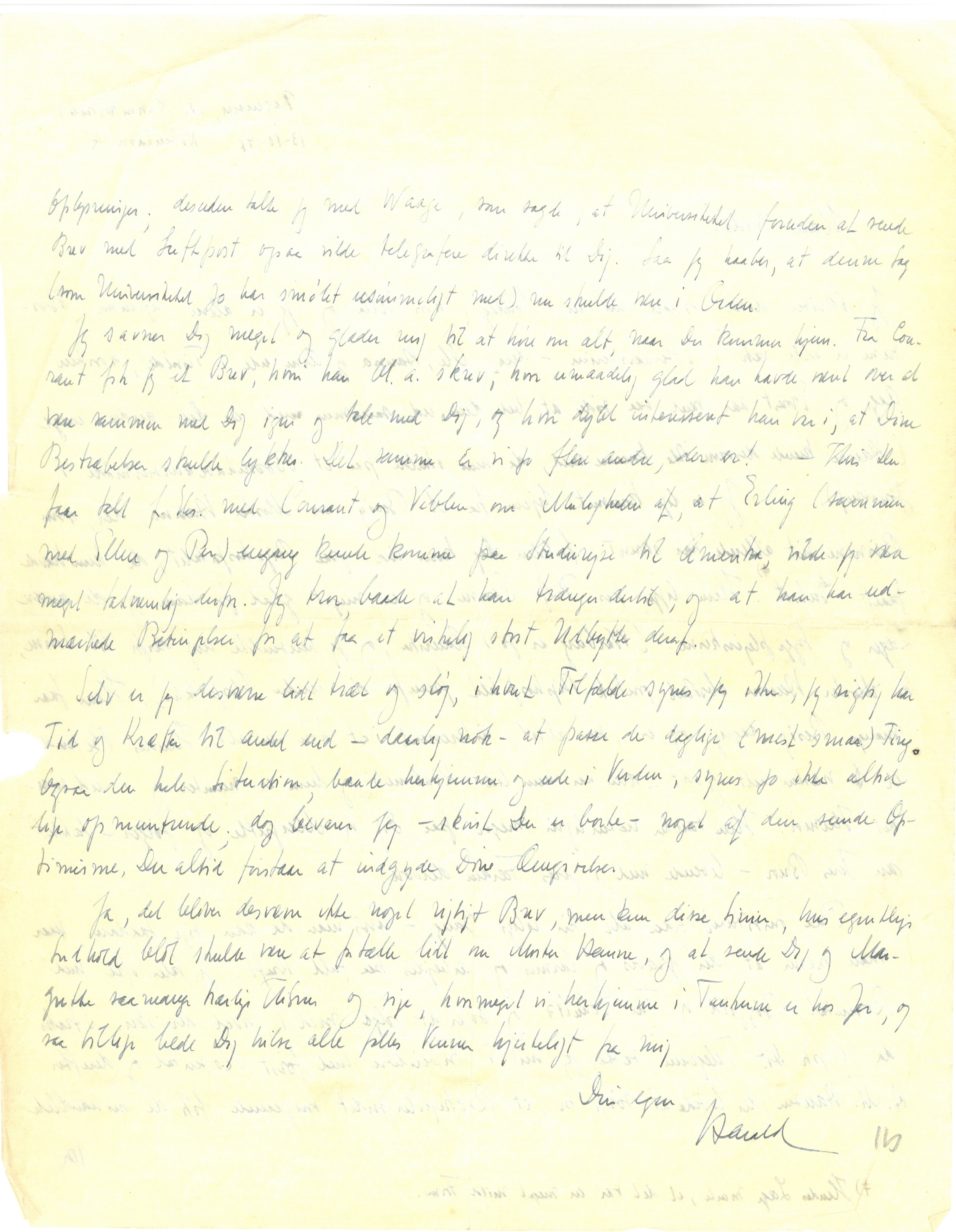 Jeg savner Dig meget og glæder mig til at høre om alt, naar Du kommer hjem. Fra Courant fik jeg et Brev, hvori han bl.a. skrev, hvor umaadelig glad han havde været over at være sammen med Dig igen og tale med Dig, og hvor dybt interesseret han var i, at Dine Bestræbelser skulde lykkes. Det samme er vi jo flere andre, der er! Hvis Du faar talt f.Eks. med Courant og Veblen om Muligheden af, at Erling (sammen med Ellen og Per) engang kunde komme paa Studierejse til Amerika, vilde jeg være meget taknemlig derfor. Jeg tror baade at han trænger dertil, og at han har udmærkede Betingelser for at faa et virkelig stort Udbytte deraf.