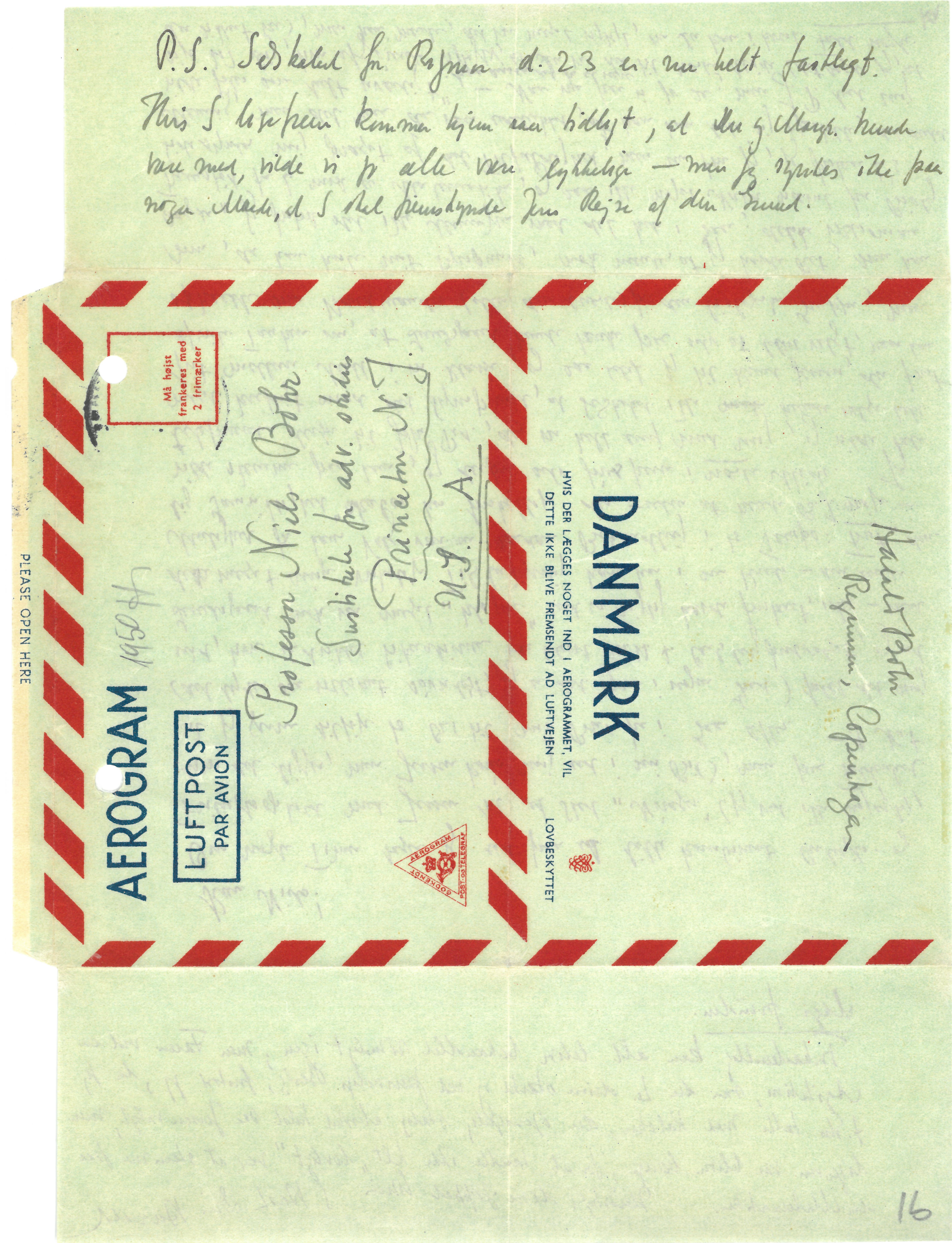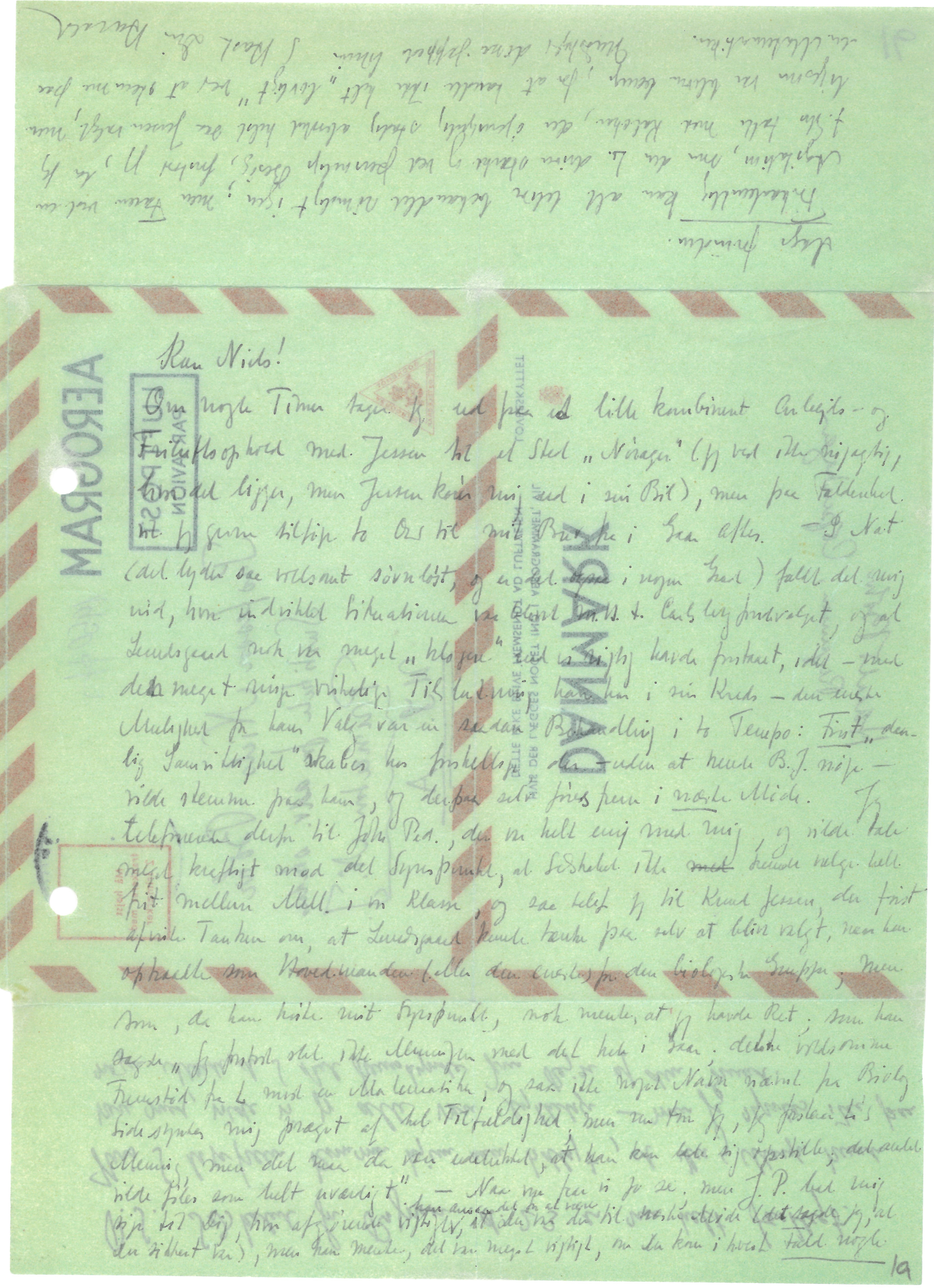 Om nogle Timer tager jeg ud paa et lille kombineret Arbejds- og Friluftsophold med Jessen til et Sted “Nørager” (jeg ved ikke nøjagtig, hvor det ligger, men Jessen kører mig ud i sin Bil), men paa Falderebet vil jeg gerne tilføje to Ord til mit Brev fra i Gaar Aftes. – I Nat (det lyder saa voldsomt søvnløst, og er det ogsaa i nogen Grad) faldt det mig ind, hvor indviklet Situationen var blevet m.h.t. Carlsbergfondvalget, og at Lundsgaard nok var meget “klogere” end vi rigtig havde forstaaet, idet – med den meget ringe virkelige Tilslutning han har i sin Kreds – den eneste Mulighed for hans Valg var en saadan Behandling i to Tempo: Først “daarlig Samvittighed” skabes hos forskellige der – uden at kende B.J. nøje – vilde stemme paa ham, og derpaa selv føres frem i næste Møde. Jeg telefonerede derfor til Johs. Ped. der var helt enig med mig, og vilde tale meget kraftigt mod det Synspunkt, at Selskabet ikke kunde vælge helt frit mellem Medl. i en Klasse, og saa telef. jeg til Knud Jessen, der først afviste Tanken om, at Lundsgaard kunde tænke paa selv at blive valgt, men han optraadte som Hovedmanden (eller den eneste) fra den biologiske Gruppe; men som, da han hørte mit Synspunkt, nok mente, at jeg havde Ret; men han sagde “Jeg forstod slet ikke Meningen med det hele i Gaar; dette voldsomme Fremstød fra L mod en Matematiker, og saa ikke noget Navn nævnt fra Biolog Side synes mig præget af hel Tilfældighed; men nu tror jeg, jeg forstaar L’s Mening, men det maa da være udelukket, at han kan lade sig opstille; det andet vilde føles som helt uværdigt”. – Naa nu faar vi jo se; men J.P. bad mig sige til Dig, hvor afgørende vigtigt, han anser det for at være, at Du var der til næste Møde (det sagde jeg, at du sikkert var), men han mente, det var meget vigtigt, om Du kom i hvert Fald nogle Dage forinden.