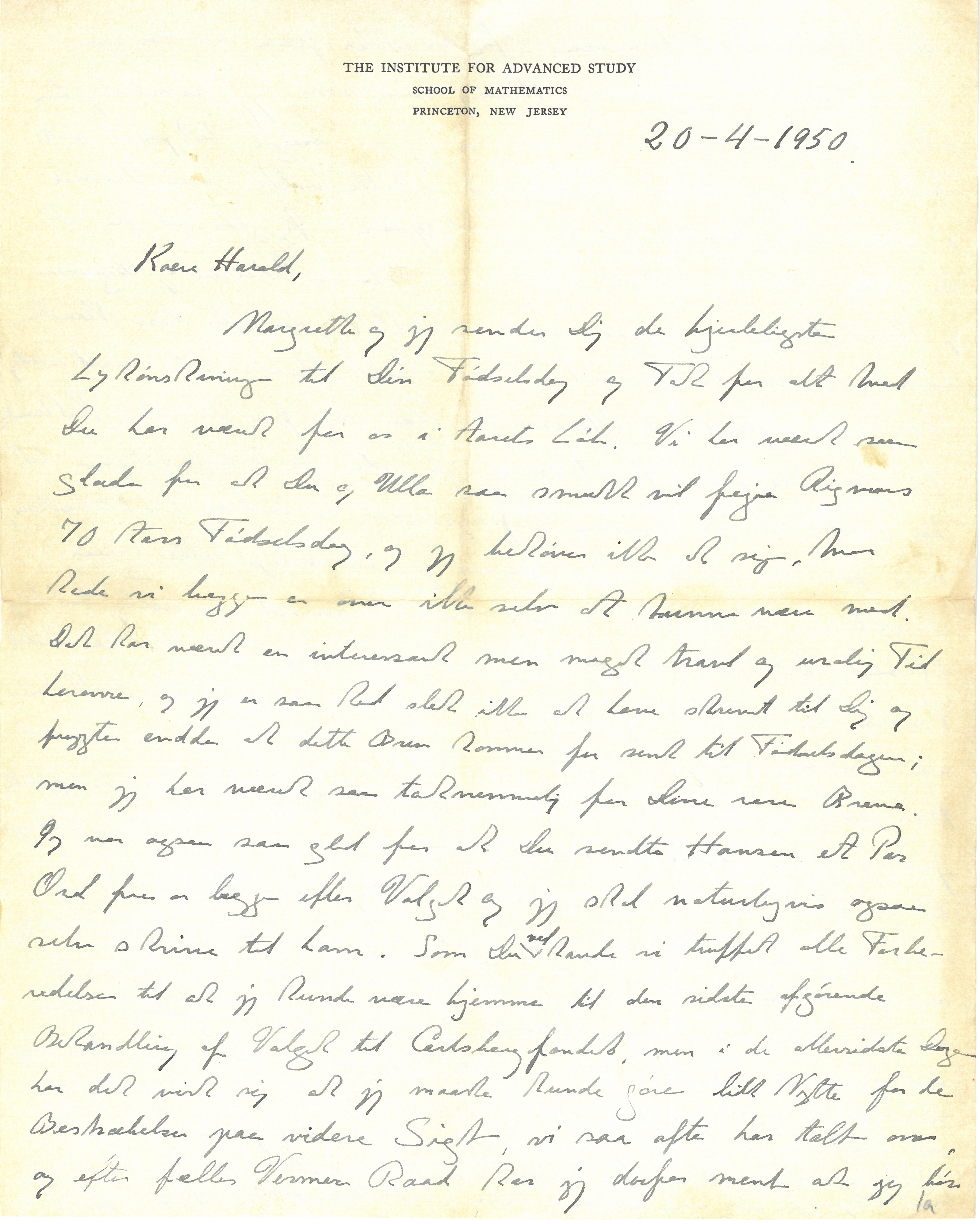 A København, Niels Bohr Arkivet, Harald Bohr Correspondence, HBC-BOHR-500420t. Brev skrevet egenhændigt af Niels Bohr på brevpapir fra The Institute for Advanced Study, Princeton.