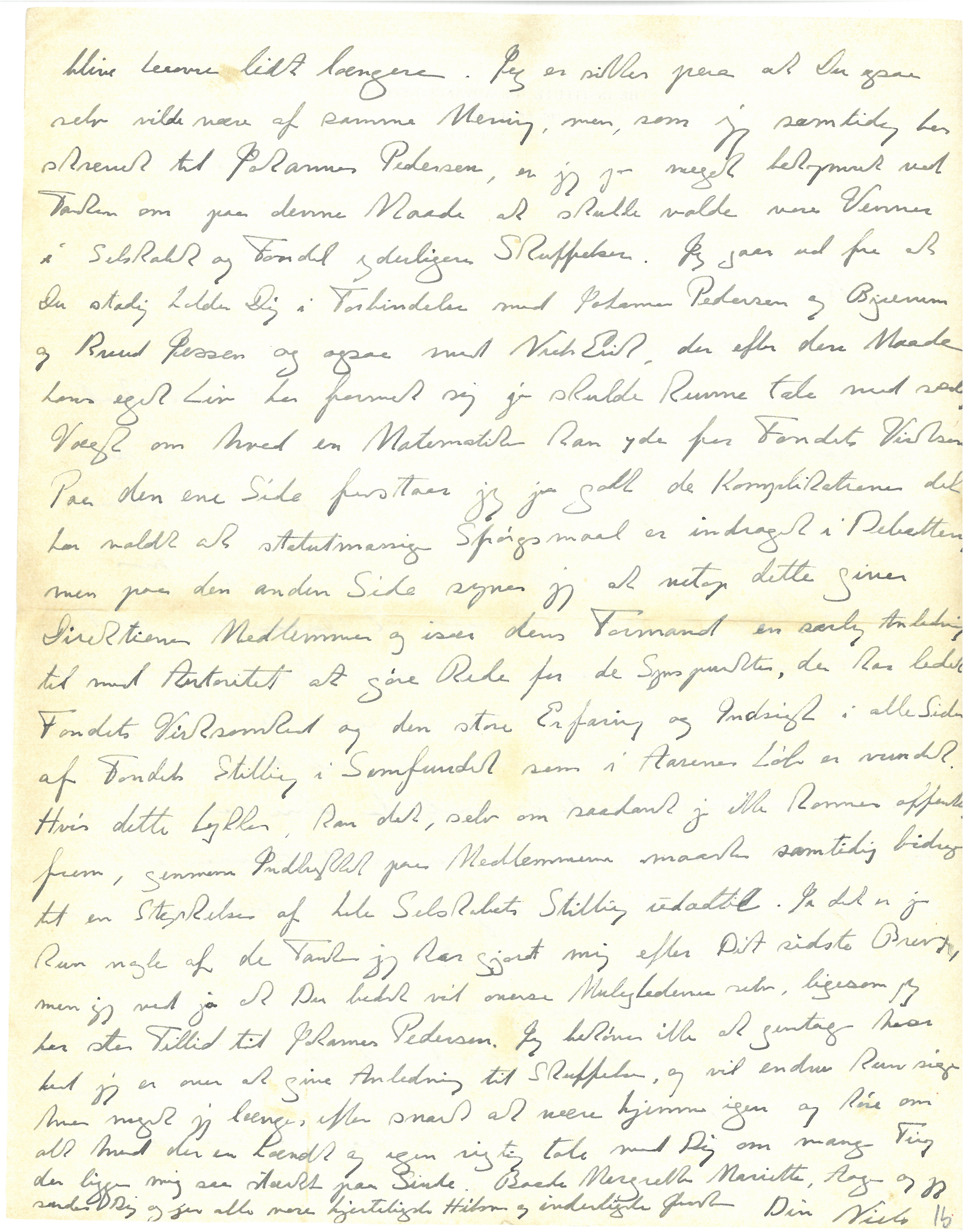 Margrethe og jeg sender Dig de hjerteligste Lykønskninger til Din Fødselsdag og Tak for alt hvad Du har været for os i Aarets Løb. Vi har været saa glade for at Du og Ulla saa smukt vil fejre Rigmors 70 Aars Fødselsdag, og jeg behøver ikke at sige, hvor kede vi begge er over ikke selv at kunne være med. Det har været en interessant men meget travl og urolig Tid herovre, og jeg er saa ked slet ikke at have skrevet til Dig og frygter endda at dette Brev kommer for sent til Fødselsdagen; men jeg har været saa taknemmelig for Dine rare Breve. Jeg var ogsaa saa glad for at Du sendte Hansen et Par Ord fra os begge efter Valget og jeg skal naturligvis ogsaa selv skrive til ham. Som Du ved havde vi truffet alle Forberedelser til at jeg kunde være hjemme til den sidste afgørende Behandling af Valget til Carlsbergfondet, men i de allersidste Dage har det vist sig at jeg maaske kunde gøre lidt Nytte for de Bestræbelser paa videre Sigt, vi saa ofte har talt om, og efter fælles Venners Raad har jeg derfor ment at jeg bør |blive herovre lidt længere. Jeg er sikker paa at Du ogsaa selv vilde være af samme Mening, men, som jeg samtidig har skrevet til Johannes Pedersen, er jeg jo meget bekymret ved Tanken om paa denne Maade at skulde volde vore Venner i Selskabet og Fondet yderligere Skuffelser. Jeg gaar ud fra at Du stadig holder Dig i Forbindelse med Johannes Pedersen og Bjerrum og Knud Jessen og ogsaa med Niels Erik, der efter den Maade hans eget Liv har formet sig jo skulde kunne tale med særlig Vægt om hvad en Matematiker kan yde for Fondets Virksomhed. Paa den ene Side forstaar jeg jo godt de Komplikationer det har voldt at statutmæssige Spørgsmaal er indraget i Debatten, men paa den anden Side synes jeg at netop dette giver Direktionens Medlemmer og især dens Formand en særlig Anledning til med Autoritet at gøre Rede for de Synspunkter, der har ledet Fondets Virksomhed og den store Erfaring og Indsigt i alle Sider af Fondets Stilling i Samfundet som i Aarenes Løb er vundet. Hvis dette lykkes, kan det, selv om saadant jo ikke kommer offentlig frem, gennem Indtrykket paa Medlemmerne maaske samtidig bidrage til en Styrkelse af hele Selskabets Stilling udadtil. Ja det er jo kun nogle af de Tanker jeg har gjort mig efter Dit sidste Brev, men jeg ved jo at Du bedst vil overse Mulighederne selv, ligesom jeg har stor Tillid til Johannes Pedersen. Jeg behøver ikke at gentage hvor ked jeg er over at gøre Anledning til Skuffelse, og vil endnu kun sige hvor meget jeg længes efter snart at være hjemme igen og høre om alt hvad der er hændt og igen rigtig tale med Dig om mange Ting der ligger mig saa stærkt paa Sinde. Baade Margrethe, Marietta, Aage og jeg sender Dig og jer alle vore hjerteligste Hilsner og inderligste Ønsker