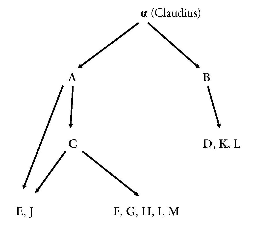 Forholdet mellem kilderne i nærværende udgave kan illustreres ved at opstille kilderne kronologisk (ældste kilder øverst, yngste nederst) og vise mulige relationer kilderne imellem.