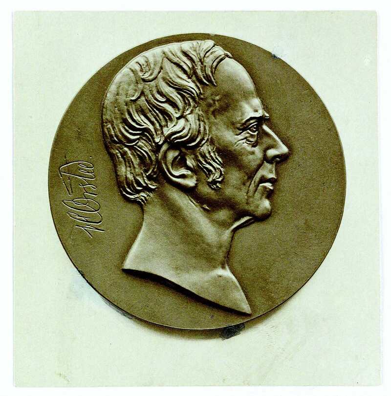 Illustration 1. H.C. Ørsted Medaljen, indstiftet i 1908 af Selskabet for Naturlærens Udbredelse. Medaljen er udført af Gunnar Jensen i 1909 og uddeles i guld, sølv og bronze.