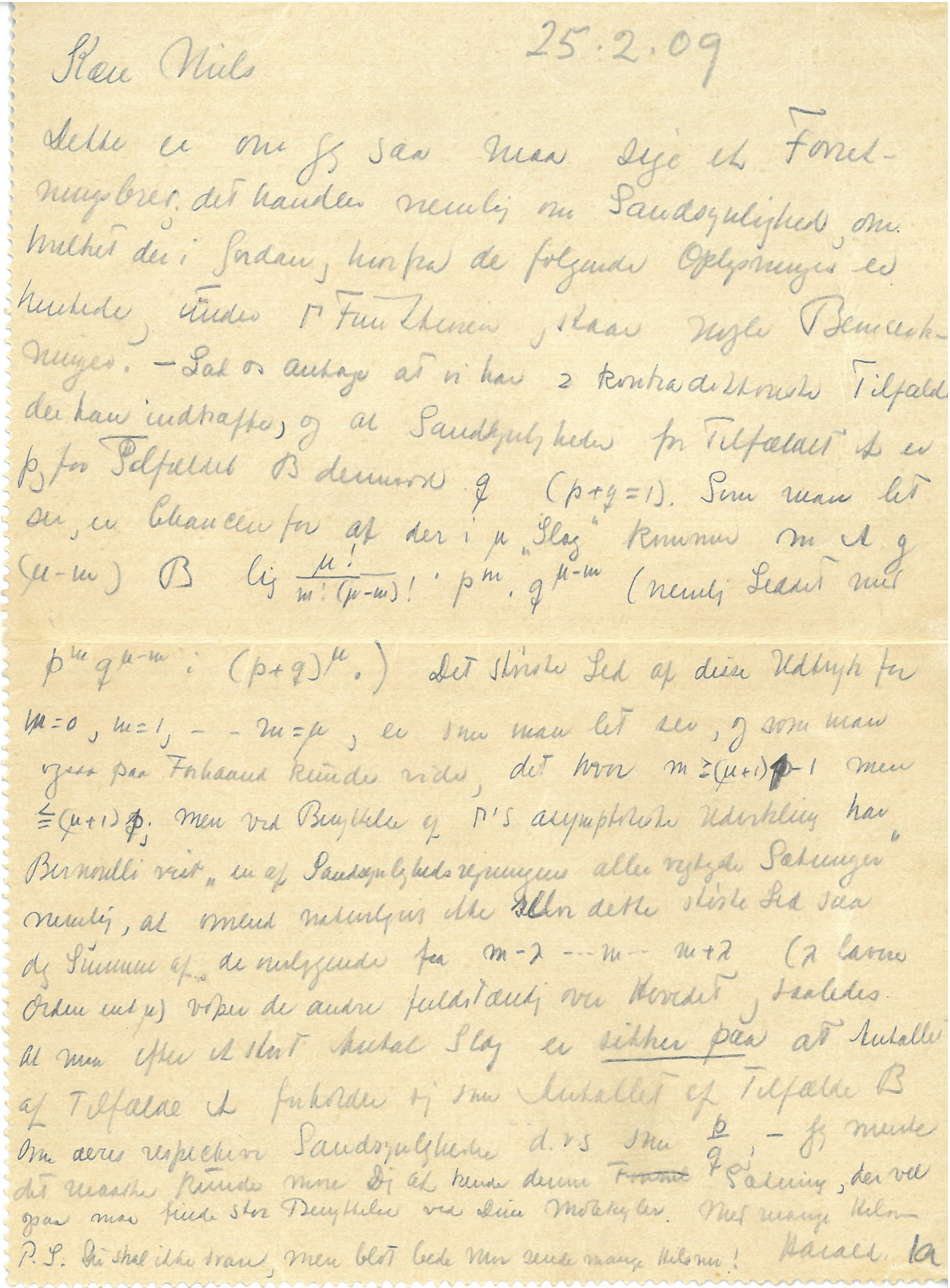 This is, if I may say so, a business letter; for it concerns probability, where Jordan, from where I have obtained the following information, has some comments under the \(\Gamma\) Let us assume that we have 2 contradictory instances which can occur, and that the probability for instance \(A\) is \(p\), for instance \(B\) on the other hand \(q\;(p+q=1)\). As one easily sees, the chance that, in \(\mu\) “throws”, one gets \(m\) \(A\) and \((\mu-m) \; B\:\) is \(\frac{\mu!}{m!(\mu-m)!} \cdot p^m \cdot q^{\mu-m}\) (namely the term with \({p^m}{q^{\mu-m}}\) in \({(p+q)}^{\mu}\).) The largest term of these expressions for \(m=0\), \(m=1\), ..., \(m=\mu\), is, as one easily sees, and which one also could have known already, is the one for which \(m\geq(\mu+1)p-1\), and \(\leq(\mu+1)p\); but by application of \(\Gamma\)’s asymptotic expansion, Bernoulli has shown “one of the most important theorems of the theory of probability” namely, that while naturally not the largest term itself, nevertheless the sum of those close by, from \(m- \lambda\) ... \(m\) ... \(m+\lambda\) (\(\lambda\:\) of lesser order than \(\mu\)) completely dominates the other terms, so that after a large number of throws, one is sure that the number of instances \(A\) relates to the number of instances \(B\) as their respective probabilities, i.e. as \(\frac{p}{q}\); – I thought it might amuse you to know this theorem, which I presume must find application in your molecules.