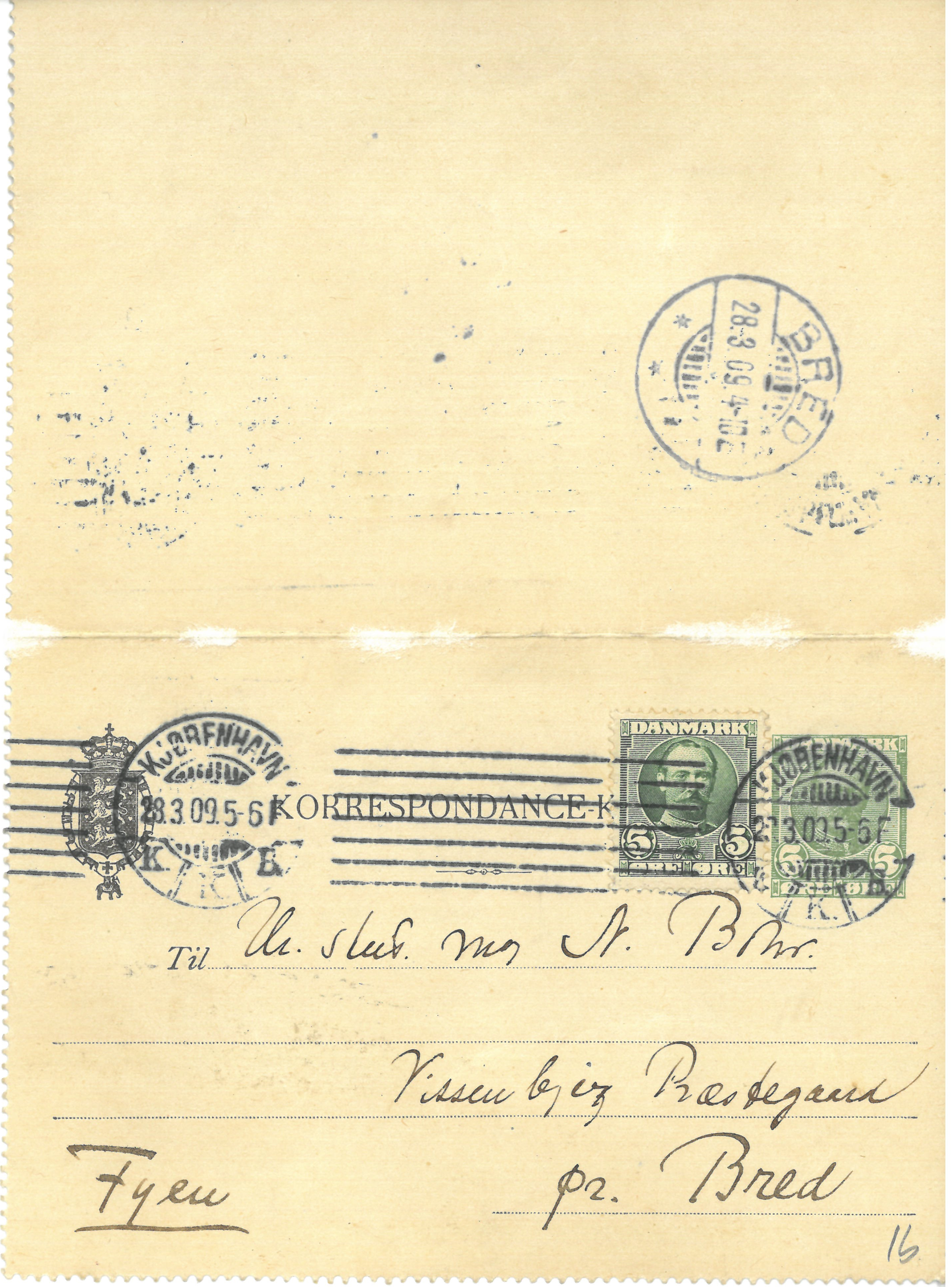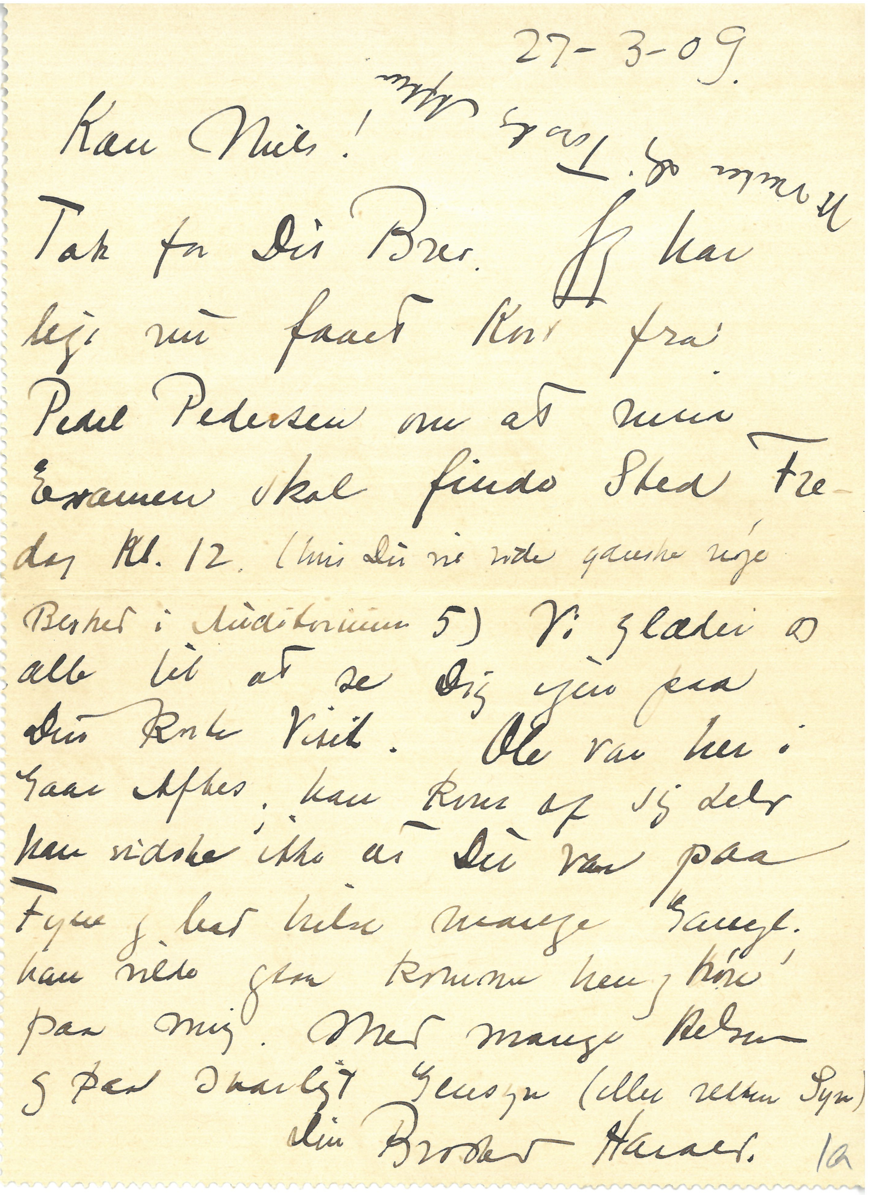 Thank you for your letter. I have just received a card from Porter Pedersen saying that my exam will be at 12 noon on Friday (Auditorium 5 if you want to know precisely) We are all looking forward to seeing you again on your short visit. Ole was here last night, he came unannounced, he did not know that you were in Funen and bade me give many greetings; he also wants to come and hear me. With lots of love and see you again soon (or rather just see you).