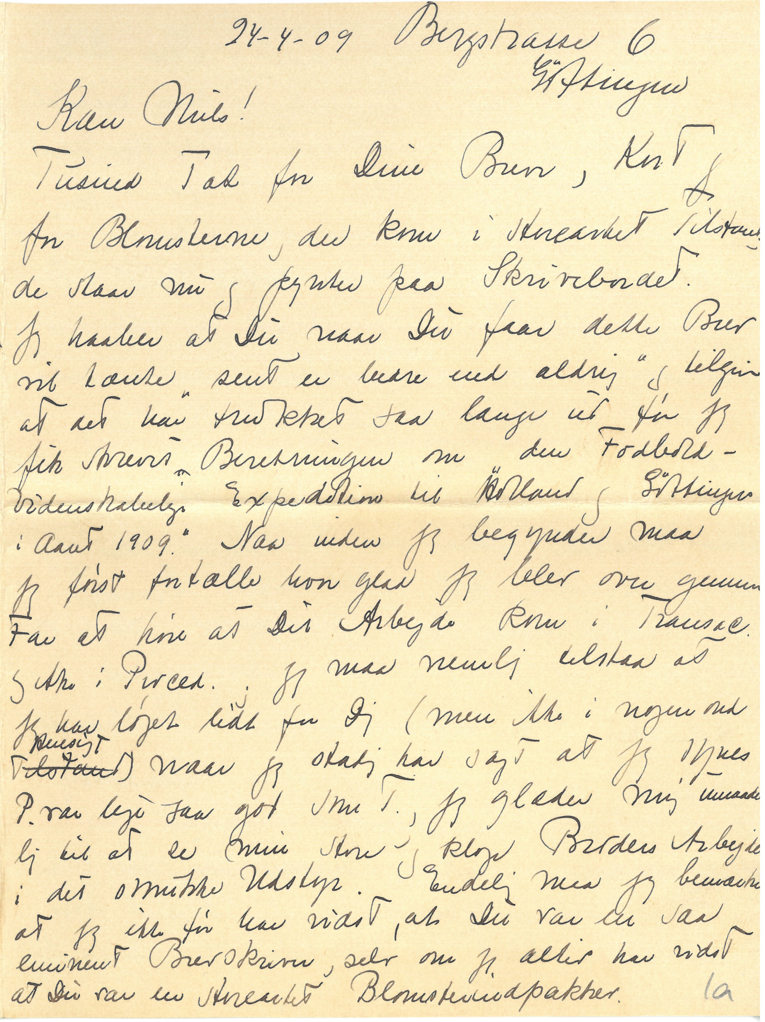 Many thanks for your letters, cards and for the flowers, which came in grand condition; they are now decorating my desk. I hope that now, when you receive this letter, you will think “better late than never” and forgive me that it has taken so long to write the account of the “Scientific Football Expedition to Holland and Göttingen anno 1909”. Well, before I begin, I should say how delighted I was to hear via Pa that your work was published in Transac. and not in Proced.; I must admit that I lied a bit to you (not with any evil intent) when I continually said that I thought P. was as good as T., I am looking forward so much to seeing my clever big brother’s work in that wonderful publication. Finally, I should remark that I did not know that you were so eminent an author of letters, even though I always knew you were such a fine packer of flowers.