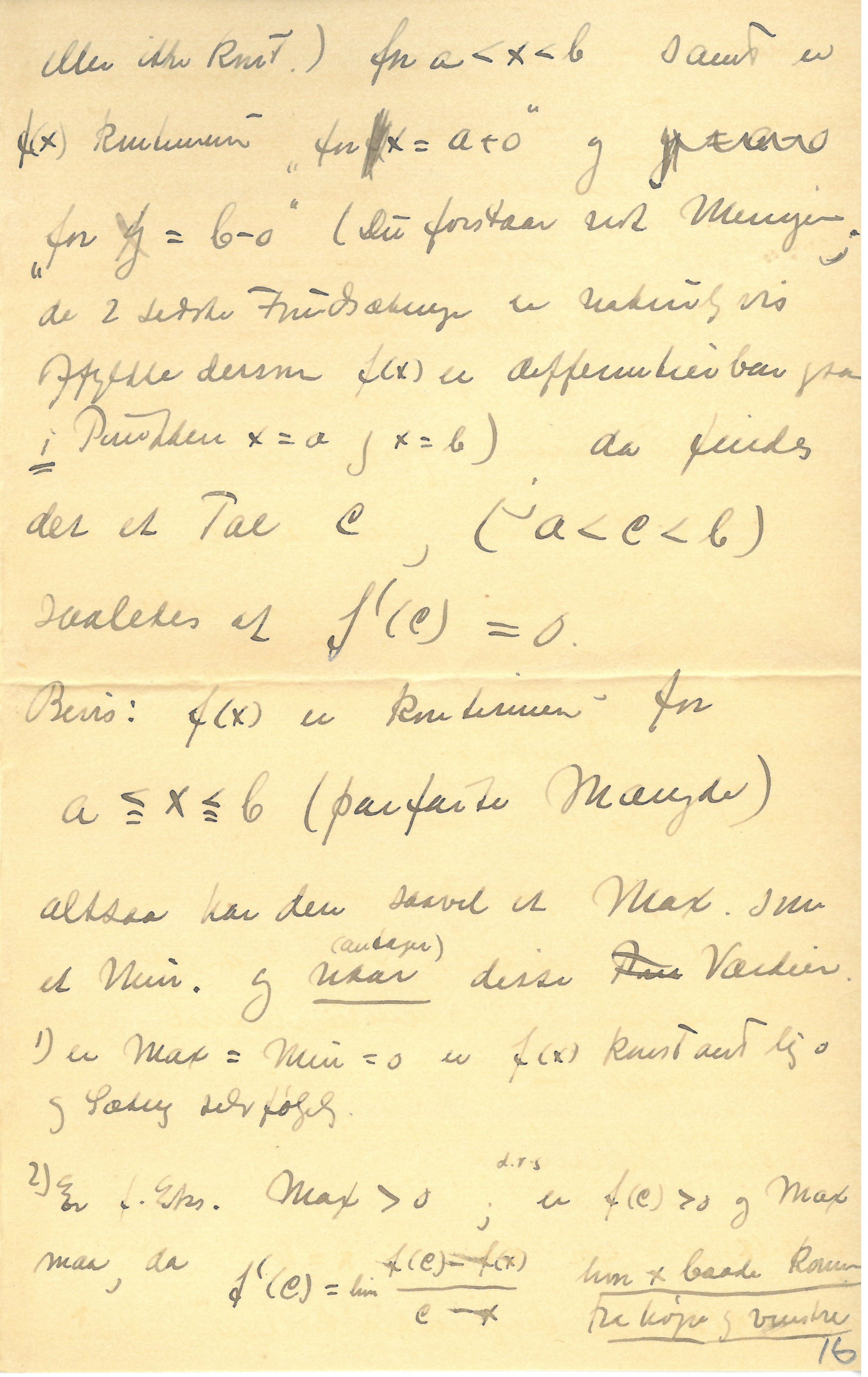 2) Er f.Eks. Max \(> 0\); d.v.s. er \(f(c) > 0\) og Max maa, da \(f'(c) = \lim\frac{f(c)-f(x)}{c-x}\) hvor \(x\) baade kommer fra højre og venstre | \(f'(c)=0\)(for \(x\) “uendelig lille” antager \(\frac{f(c)-f(x)}{c-x}\) baade Værdien \(\geq 0\) og Værdien \(\leq 0\)) q.e.d.