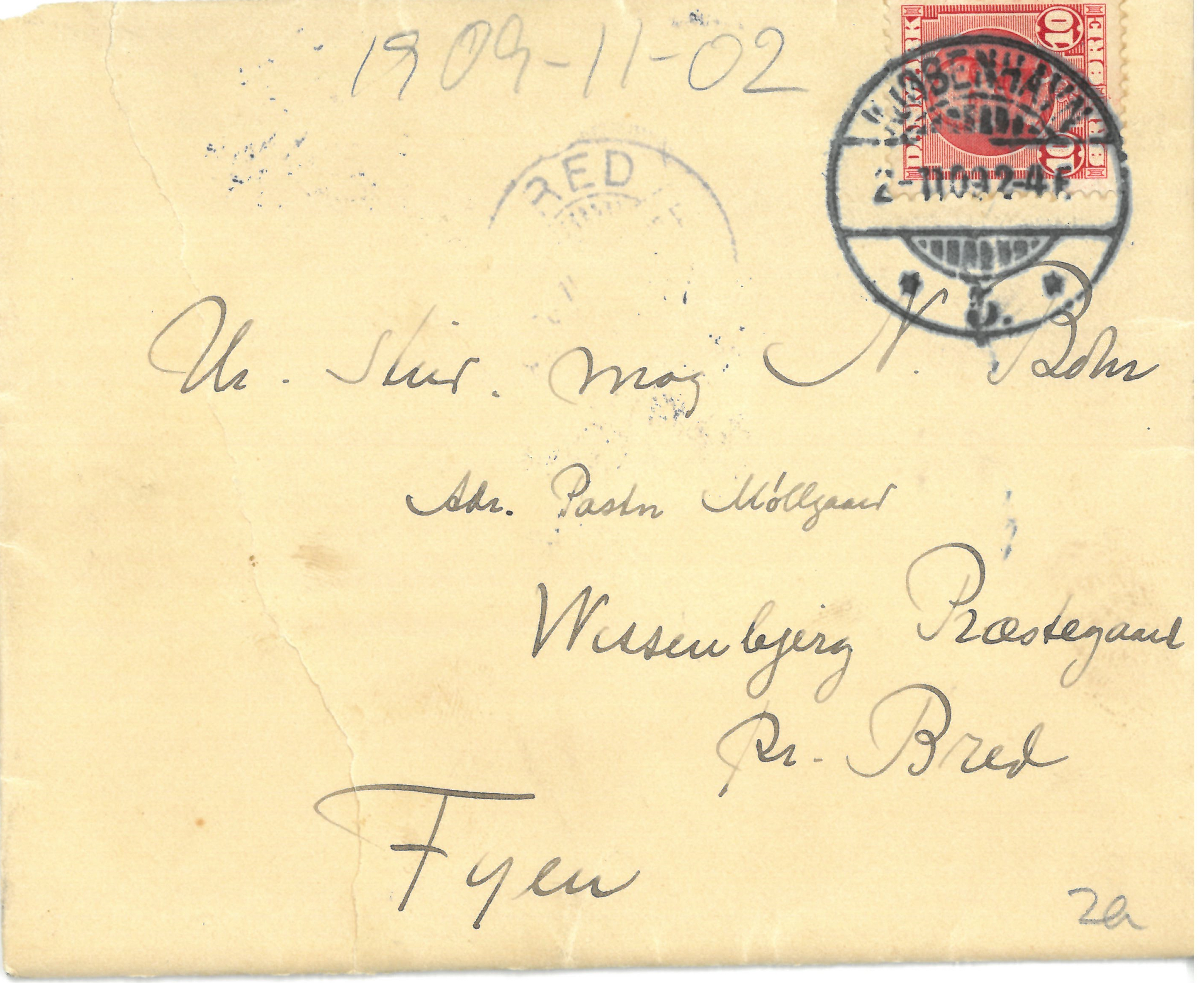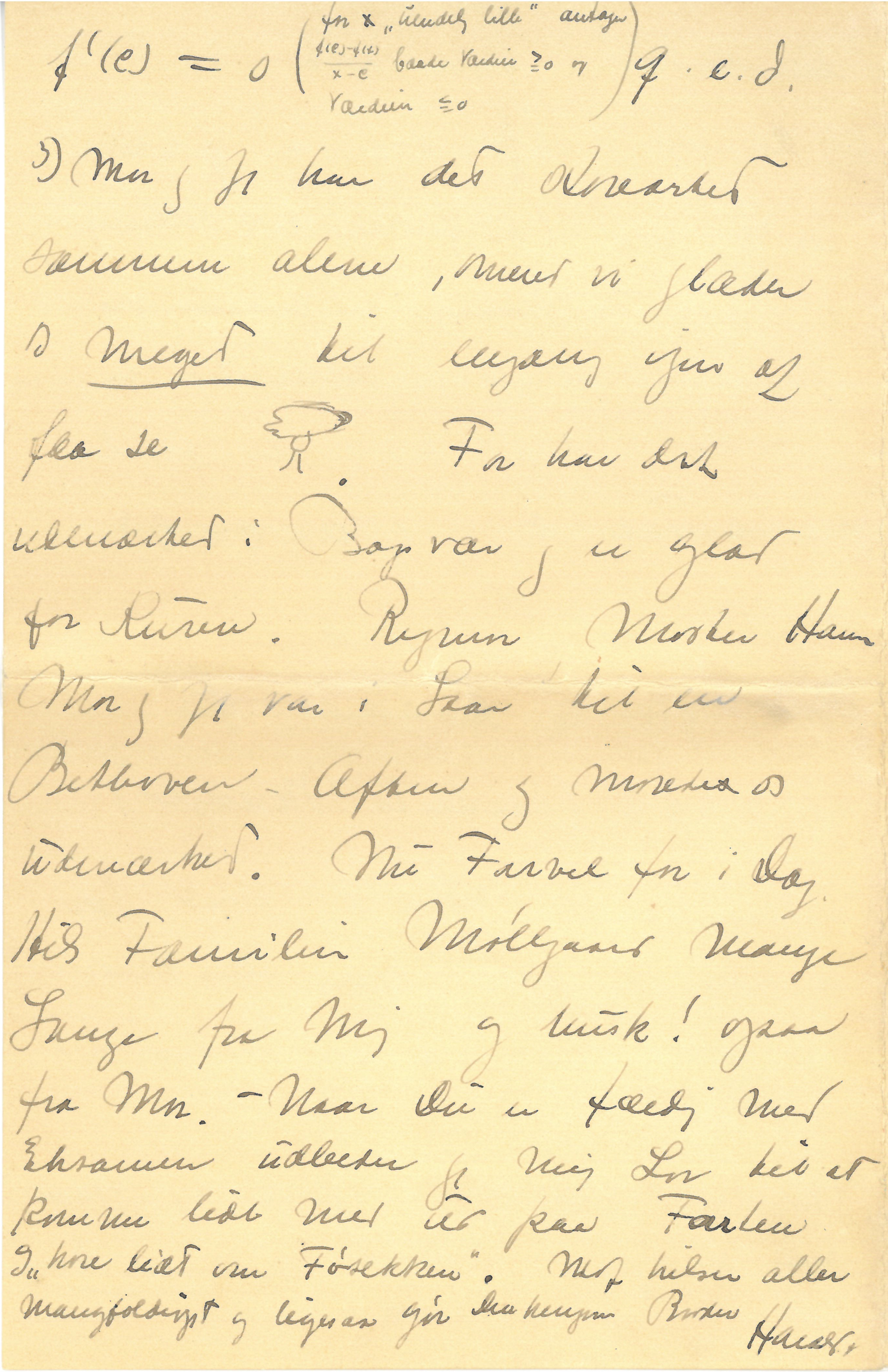3) Mor og jeg har det storartet sammen alene, omend vi glæder os meget til engang igen at faa se [stregtegning af en mand] . Far har det udmærket i Bagsværd og er glad for Kuren. Rigmor, Moster Hanna, Mor og jeg var i Gaar til en Beethoven-Aften og morede os udmærket. Nu Farvel for i Dag. Hils Familien Møllgaard mange Gange fra mig og husk! ogsaa fra Mor. – Naar Du er færdig med Eksamen udbeder jeg mig Lov til at komme lidt med ud paa Farten og “høre lidt om Føsekken”. Mof hilser aller mangfoldigst og ligesaa gør Din hengivne Broder.