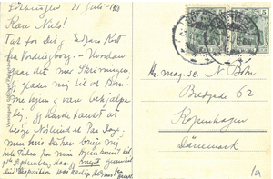 Tak for Dit og Edgars Kort fra Vordingborg. – Hvordan gaar det med Skrivningen; jeg glæder mig til at komme hjem og være behjælpelig; jeg havde tænkt at besøge Nørlund et Par Dage; men hvis Du kan bruge mig hele Tiden fra min Hjemkomst til 1ste September, staar jeg meget gerne til Din Disposition.