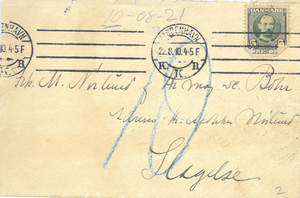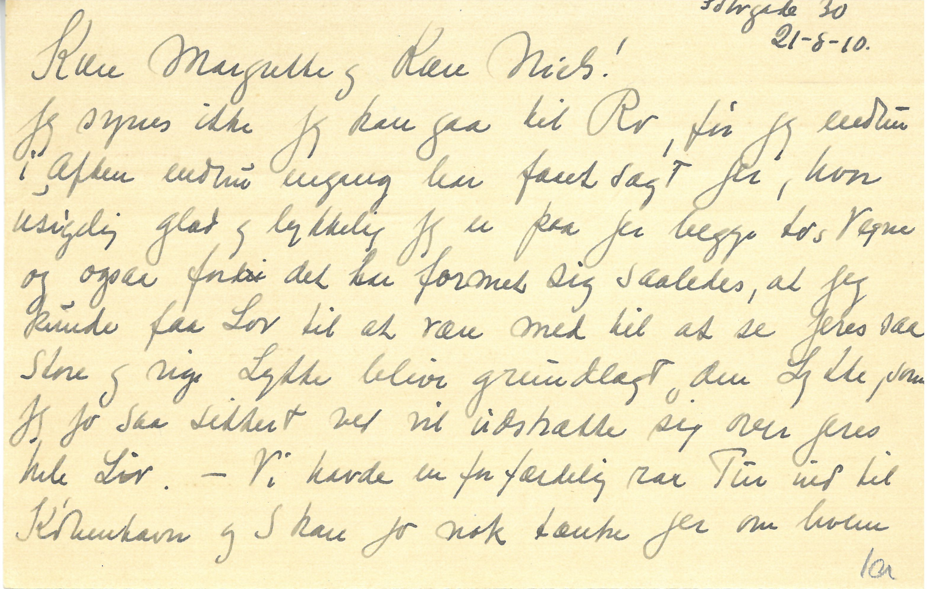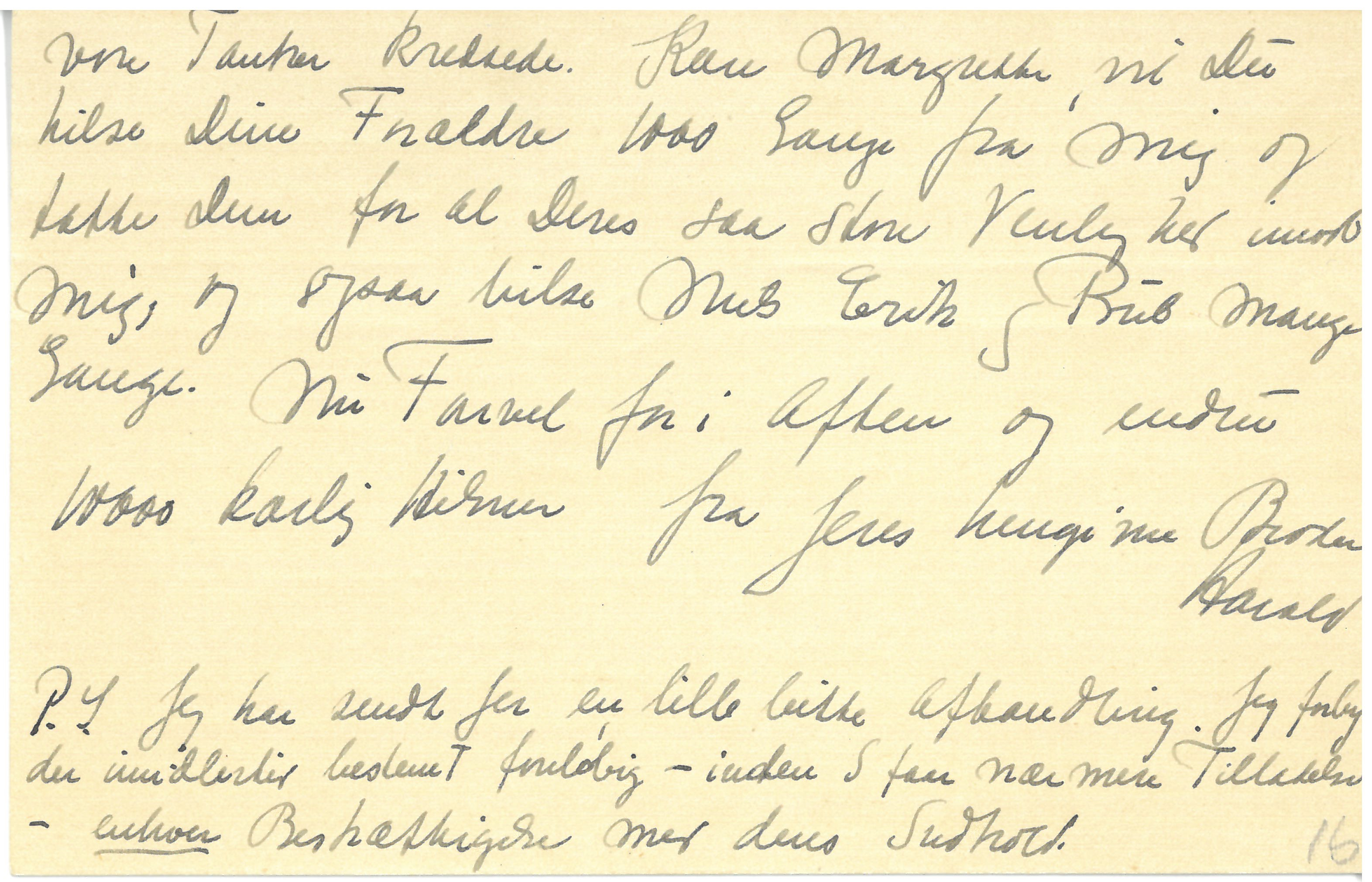 Jeg synes ikke jeg kan gaa til Ro, før jeg endnu i Aften endnu engang har faaet sagt Jer, hvor usigelig glad og lykkelig jeg er paa begges to’s Vegne og ogsaa fordi det har formet sig saaledes, at jeg kunde faa Lov til at være med til at se Jeres saa store og rige Lykke blive grundlagt den Lykke, som jeg jo saa sikkert ved vil udstrække sig over Jeres hele Liv. – Vi havde en forfærdelig rar Tur ind til København og I kan jo nok tænke Jer om hvem |vore Tanker kredsede. Kære Margrethe, vil Du hilse Dine Forældre 1000 Gange fra mig og takke dem for al Deres saa store Venlighed imod mig, og ogsaa hilse Niels Erik og Rub mange Gange.