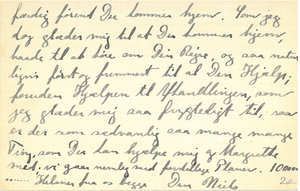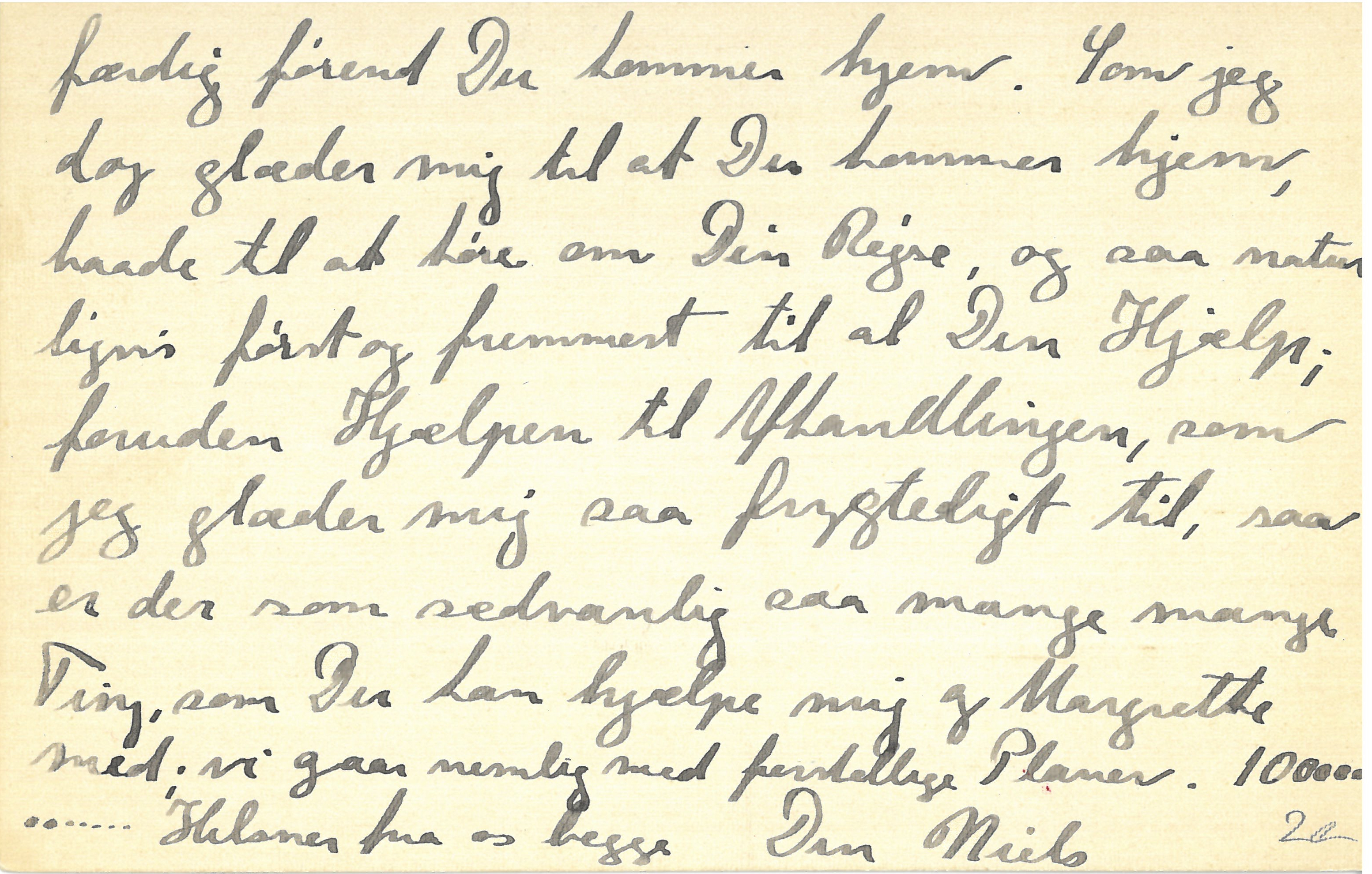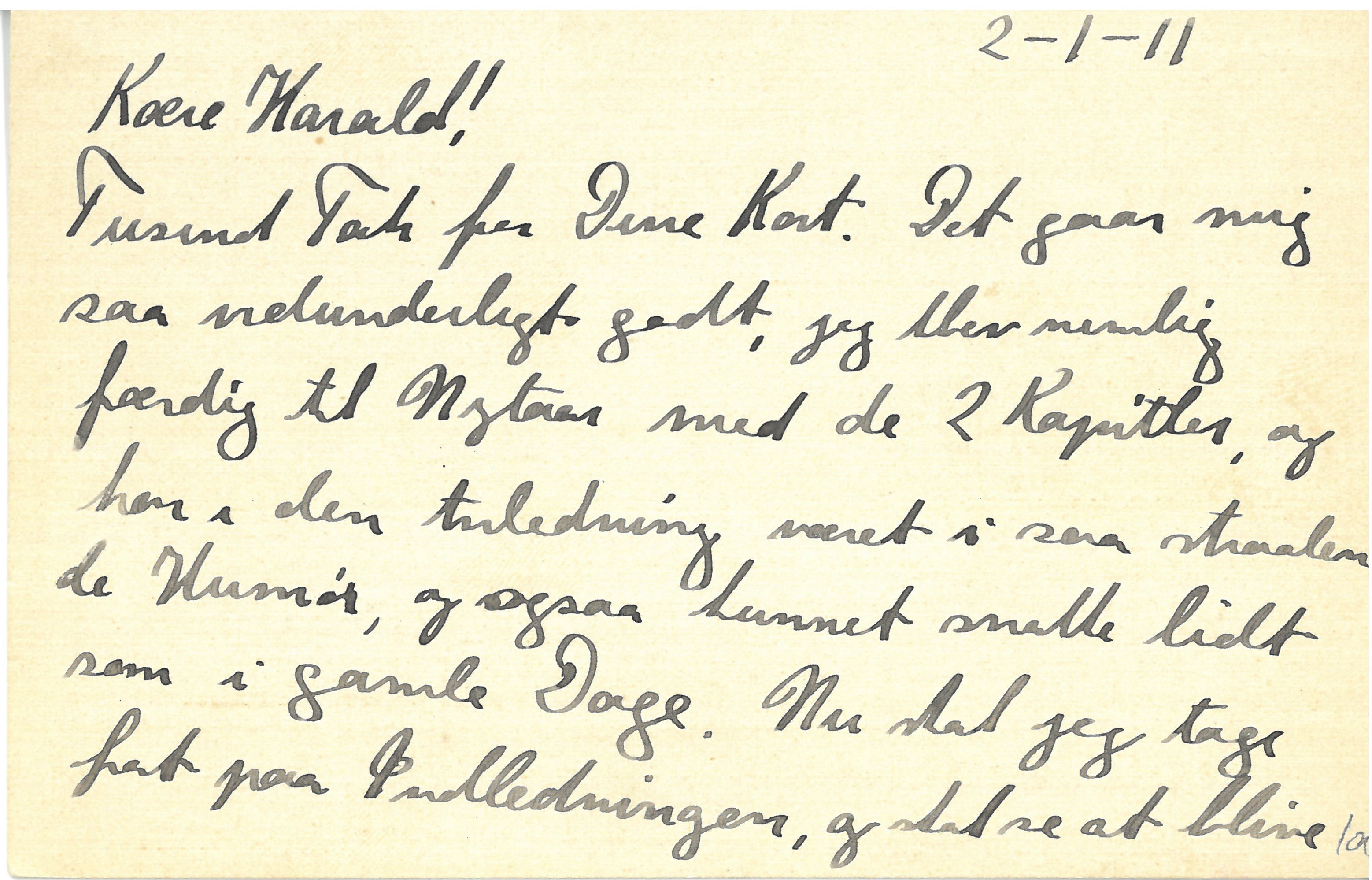 Tusind Tak for Dine Kort. Det gaar mig saa vidunderligt godt, jeg blev nemlig færdig til Nytaar med de 2 Kapitler, og har i den Anledning været i saa straalende Humør, og ogsaa kunnet snakke lidt som i gamle Dage. Nu skal jeg tage fat paa Indledningen, og skal se at blive |færdig førend Du kommer hjem. Som jeg dog glæder mig til at Du kommer hjem, baade til at høre om Din Rejse, og saa naturligvis først og fremmest til al Din Hjælp; foruden Hjælpen til Afhandlingen, som jeg glæder mig saa frygtelig til, saa er der som sædvanlig saa mange mange Ting, som Du kan hjælpe mig og Margrethe med; vi gaar nemlig med forskellige Planer.